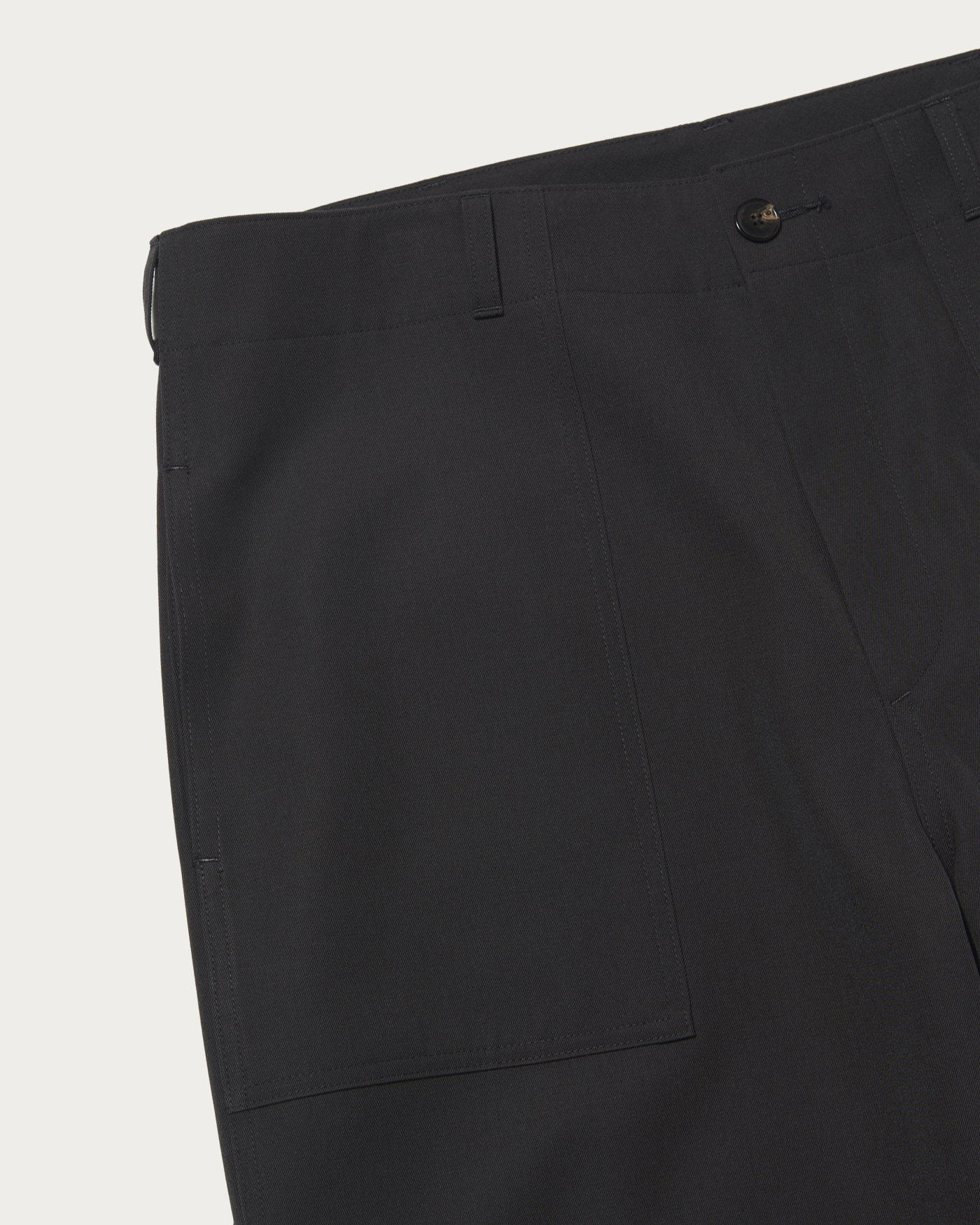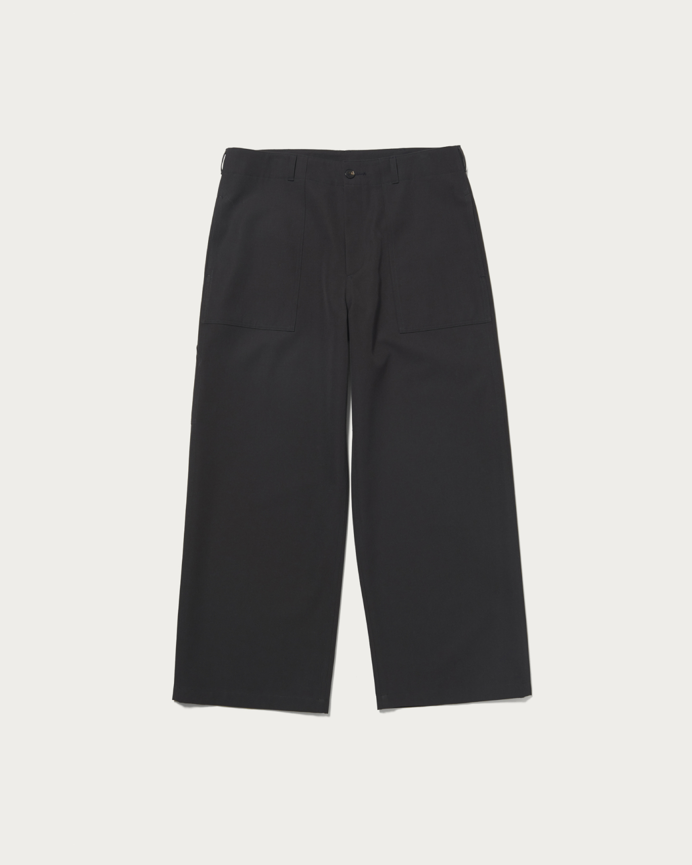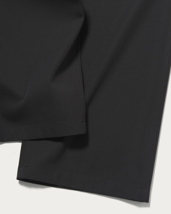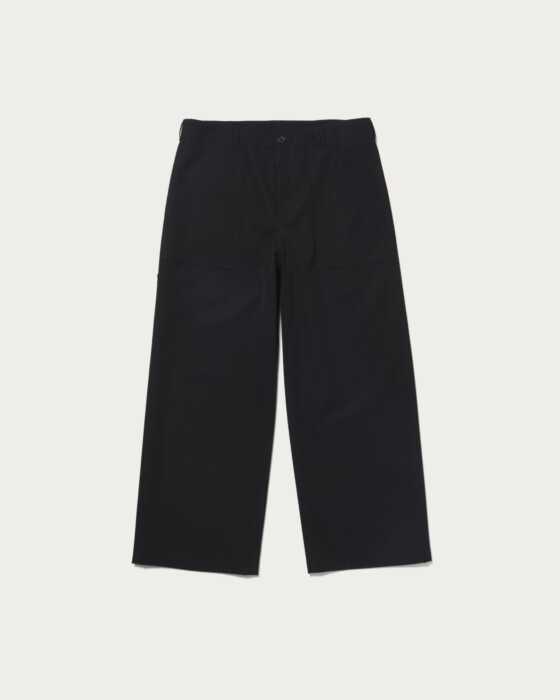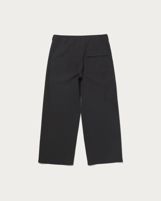 U.S.ARMYベイカーパンツがデザインのベースになっています。サイドアジャストタブなどのディテールを削ぎ落とし、梳毛の生地に落とし込むことで、ミリタリー臭が排除されて、大人向けの上品なカジュアルパンツに仕上がりました。シルエットはワイドストレート。ハリのある生地によって、直線的なシルエットが綺麗に出ているのが特徴です。