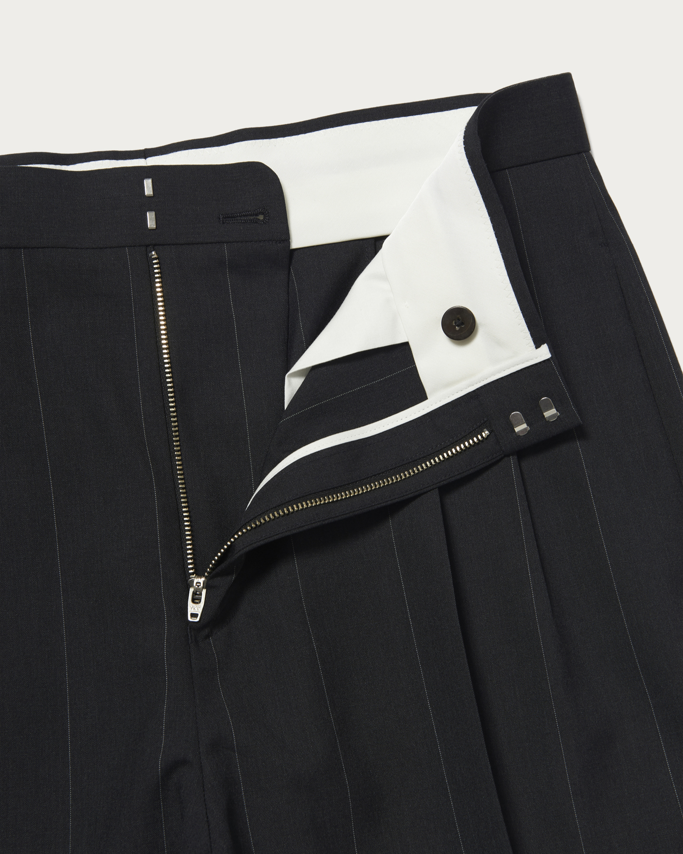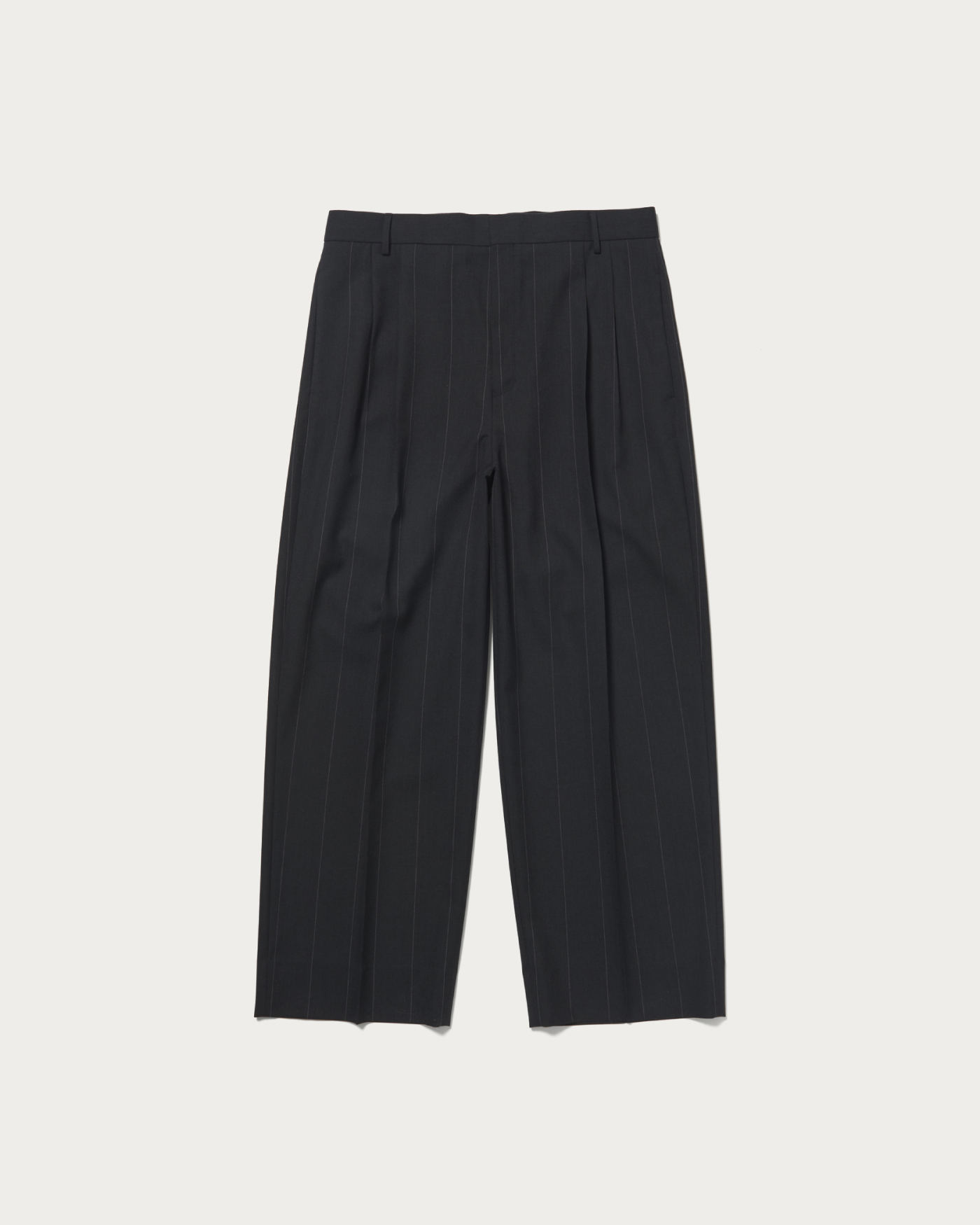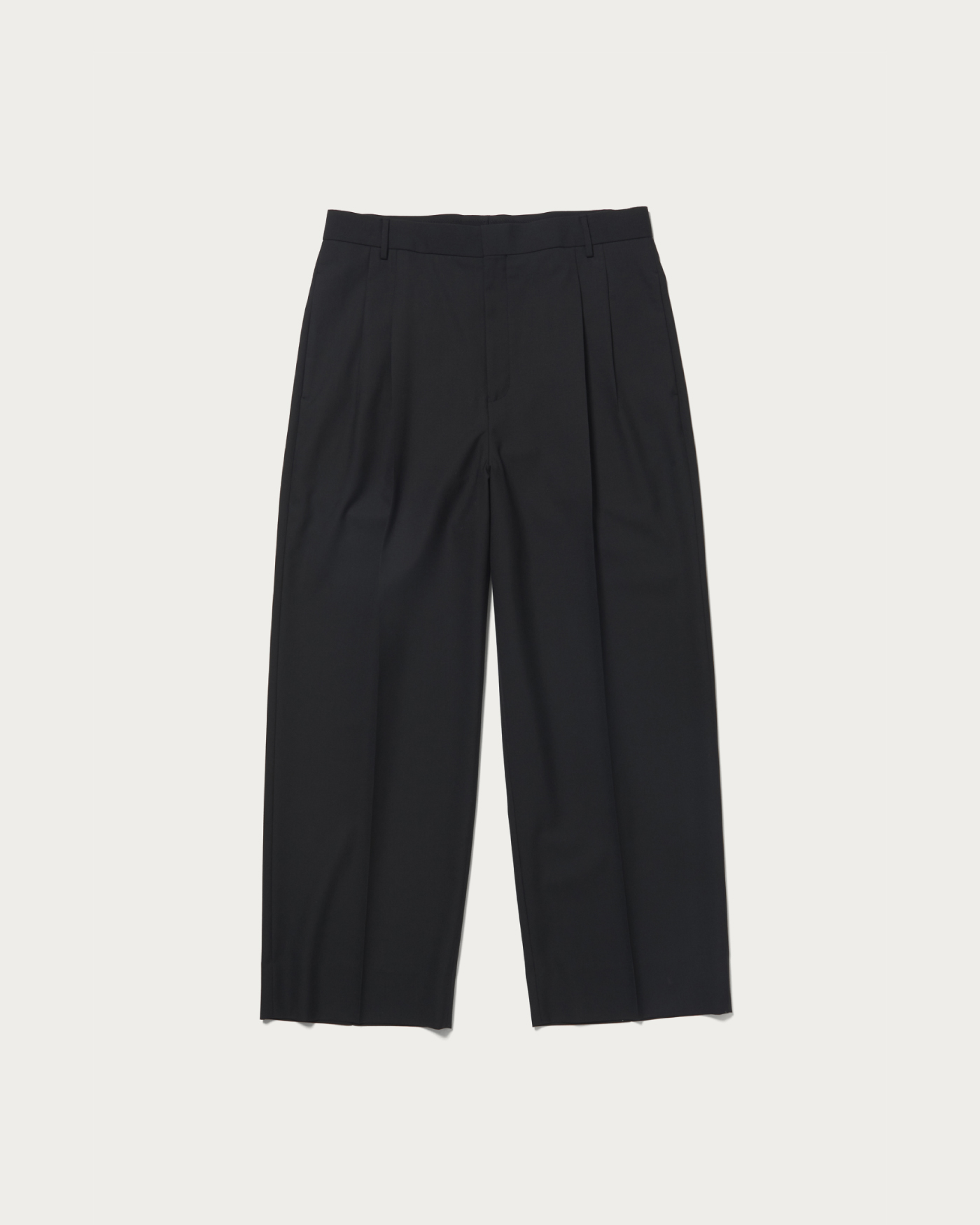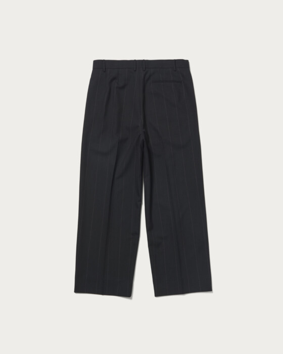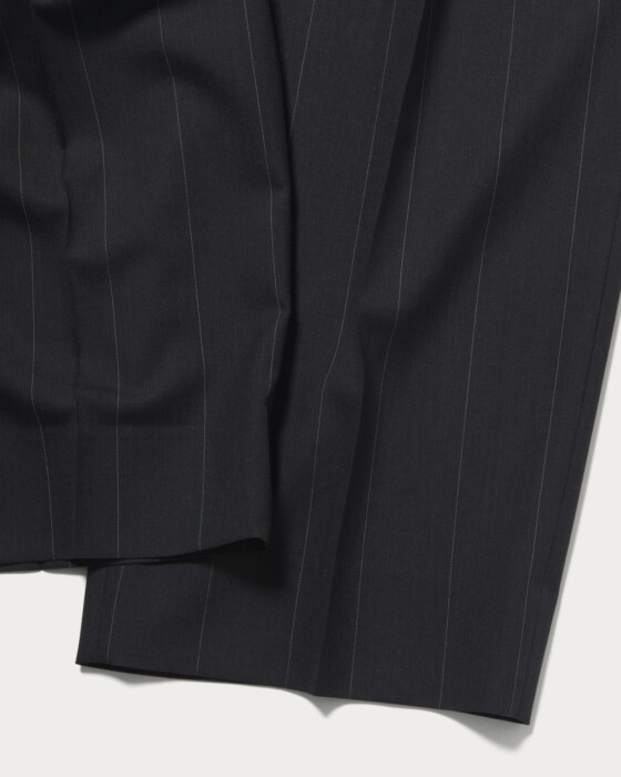 デザインは2プリーツのワイドシルエットパンツです。腰回りはスッキリさせることで、2プリーツパンツ特有の野暮ったさの無いモードなシルエットに仕上がっています。ハイマイクロンの上質な原料で織り上げたサマートロピカルウールを使用。適度な光沢と滑らかな肌当たりが特徴の非常に贅沢な素材です。痒みが無く、盛夏時期でも快適に着用出来ます。