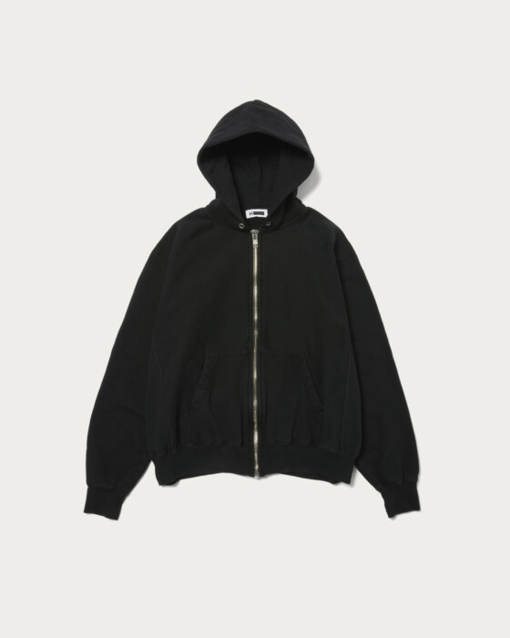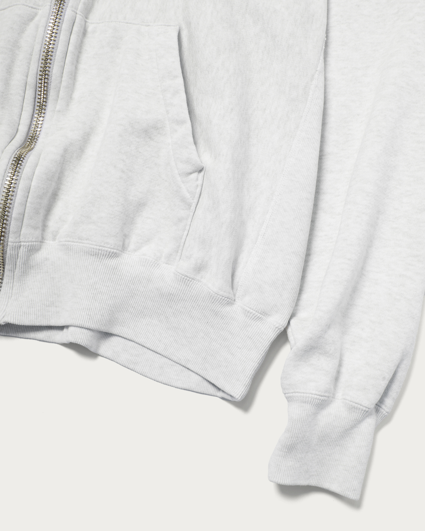クラシックな雰囲気で仕上げたスウェットジップフーディです。タンブラー乾燥を繰り返したかのような波打ったファスナーなど、ヴィンテージスウェットを彷彿とさせる佇まいがおすすめのポイント。ワイドシルエットでブルゾンタイプの着丈短めのバランスです。