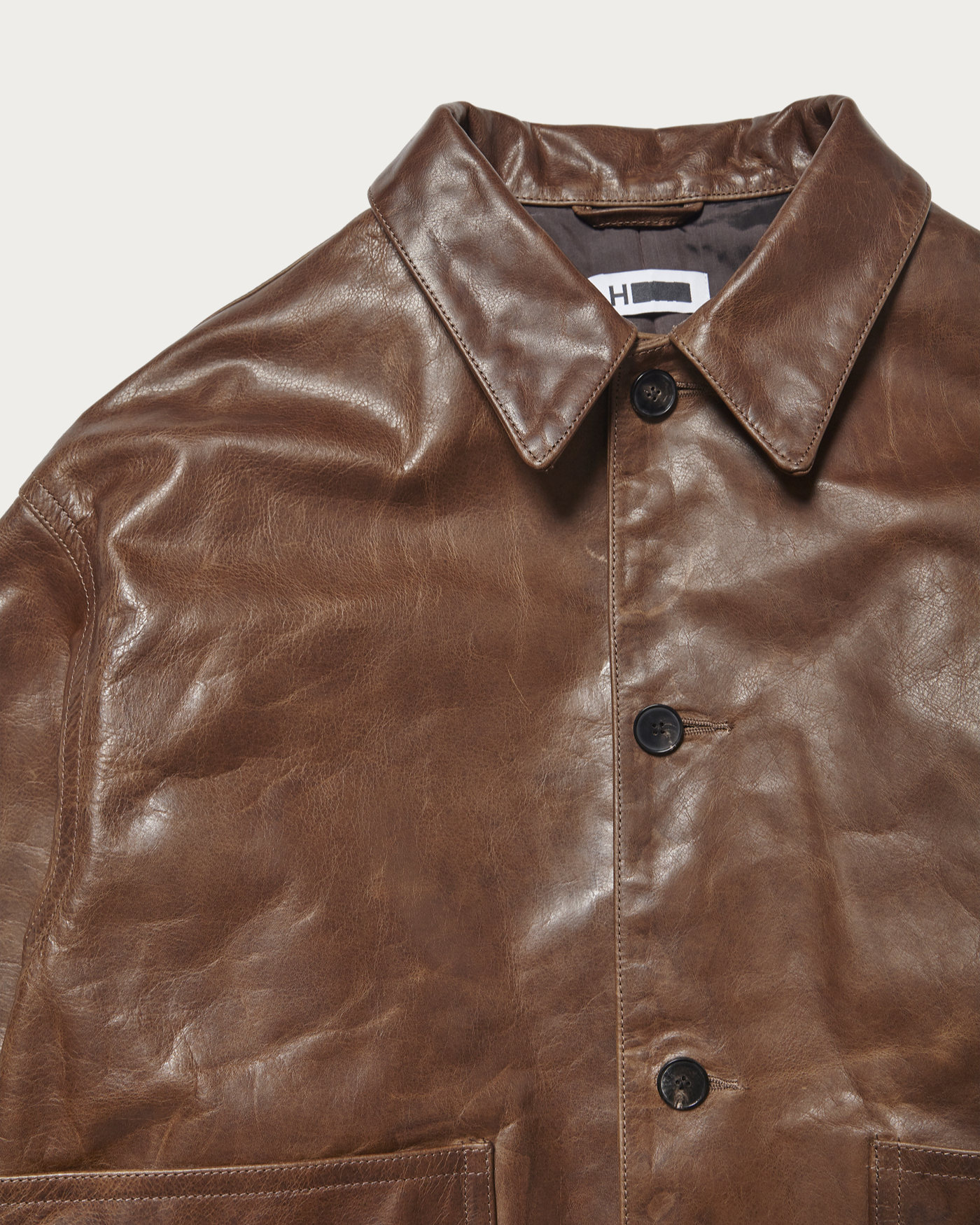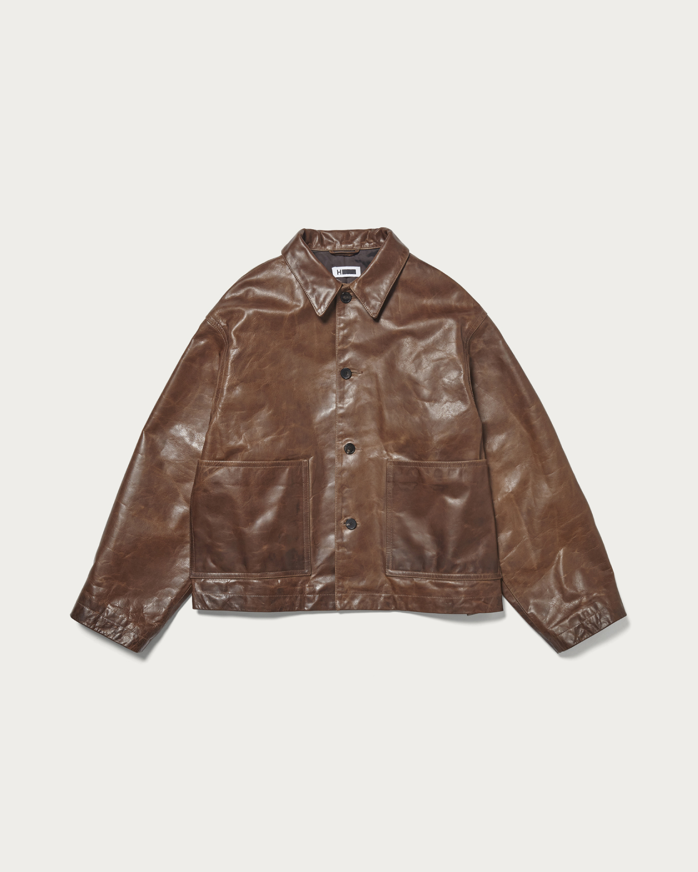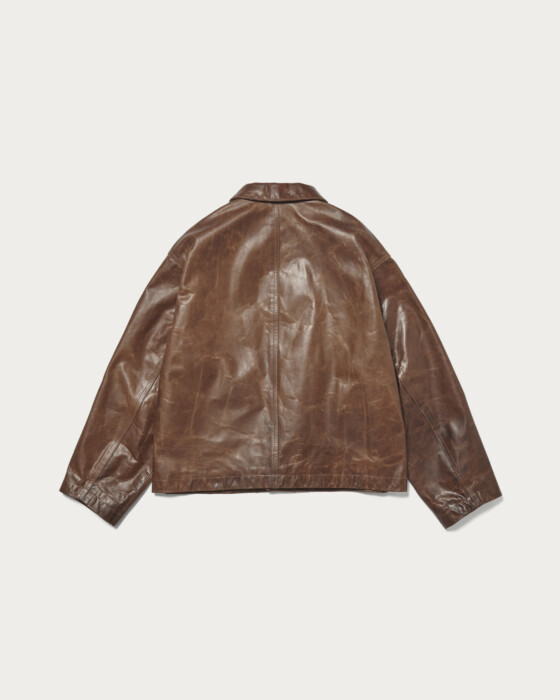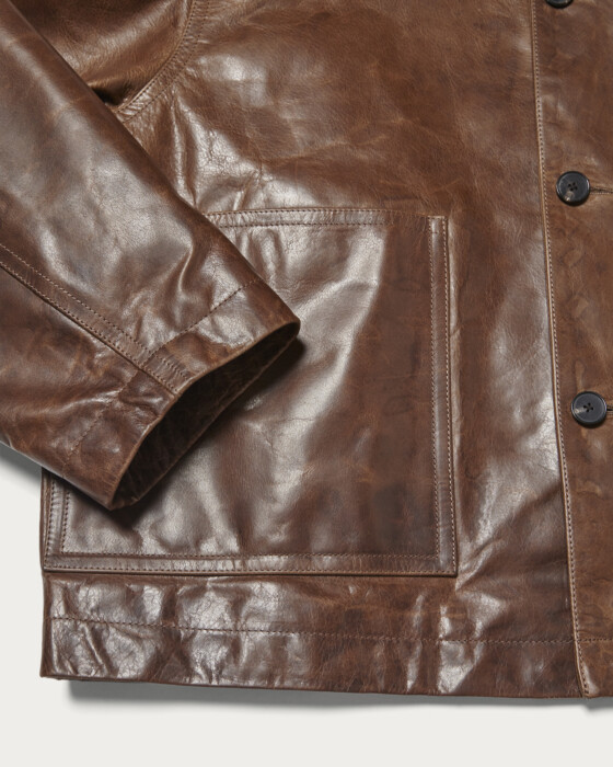 ショートレングスのトルコ原皮のカウレザーを使用した2ポケットカバーオールです。Gジャンやスポーツジャケットのような着丈で春時期にも軽快に着用出来るアウターです。革の質感を活かすために、デザインは極力シンプルにしています。ボタンはホーンボタンを使用しています。素材のもつ風合いの良さを活かしながらプルアップ調に仕上げています。