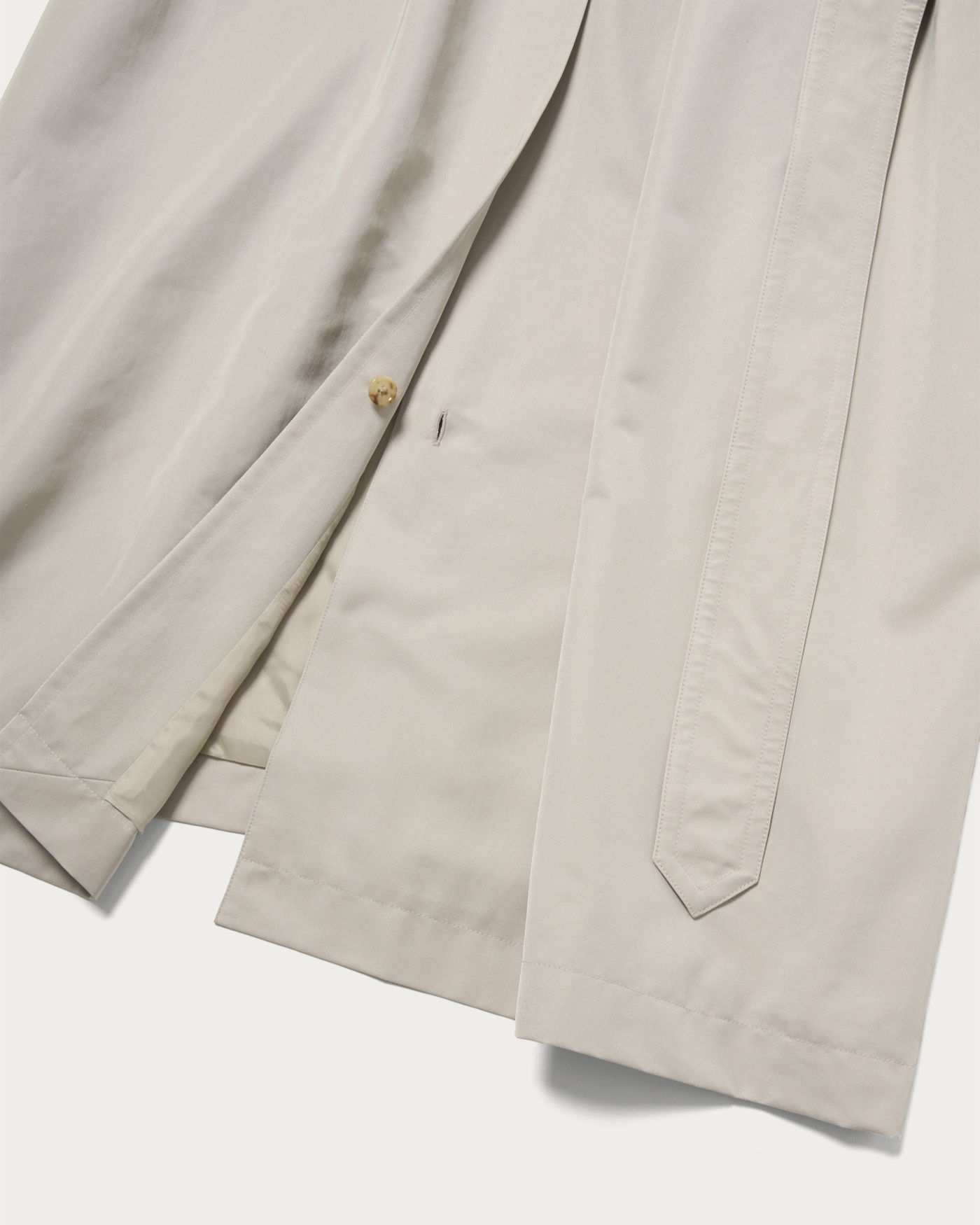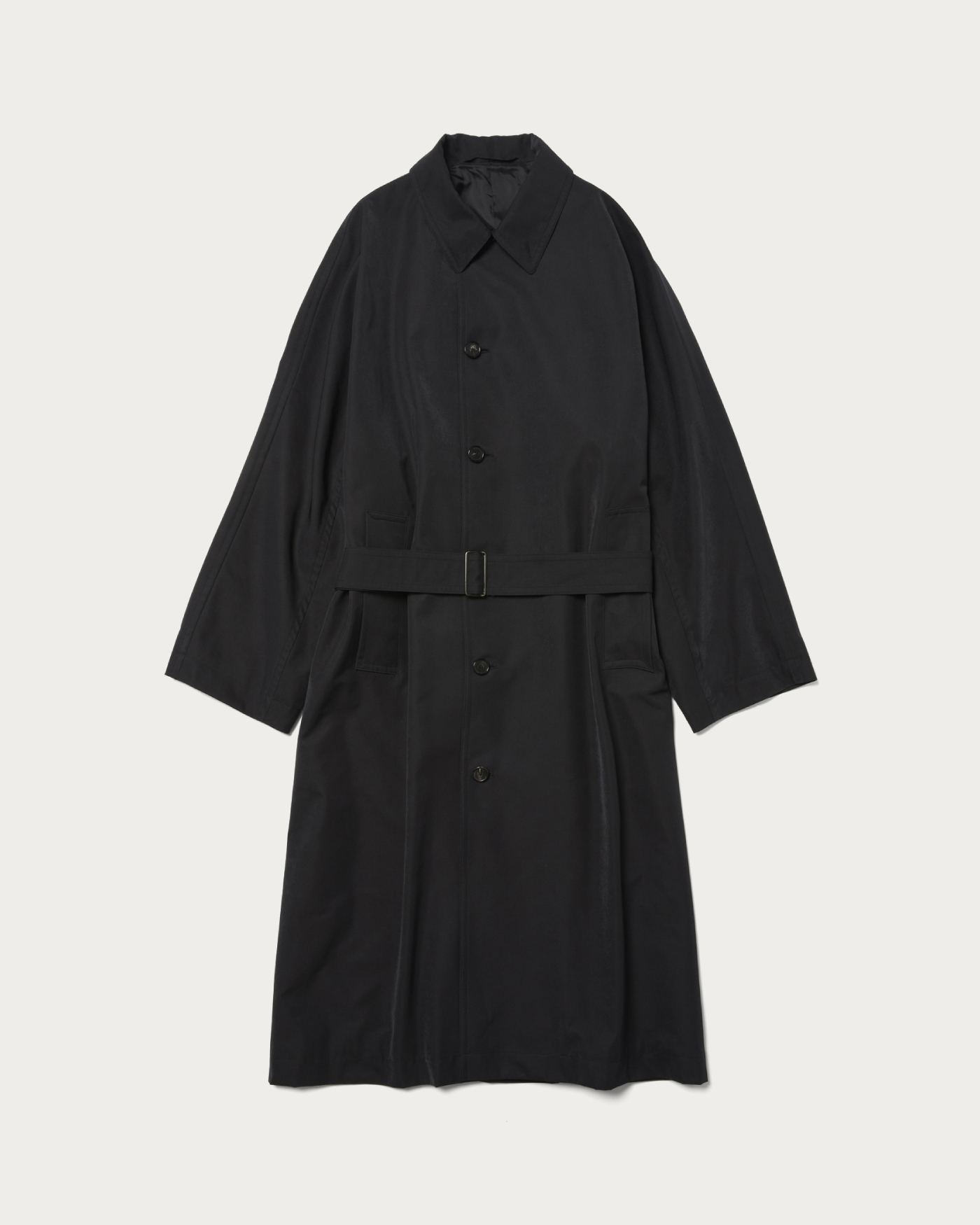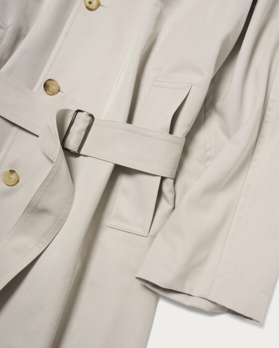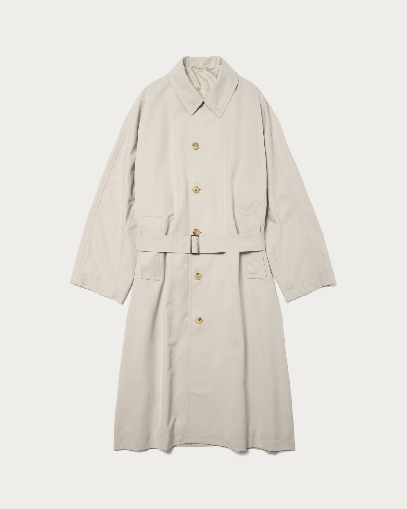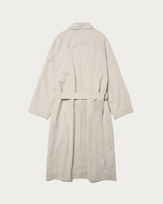 80年代のレディースコートを参考に作成したマキシレングスのバルカラーコートです。たっぷりとしたオーバーサイズで、ウエストベルトを絞って着たときの溜まりのボリューム感もとても雰囲気が良いです。身頃と袖が1枚続きになった変形スリーブを採用することで、製品のリラックス感を強調しています。