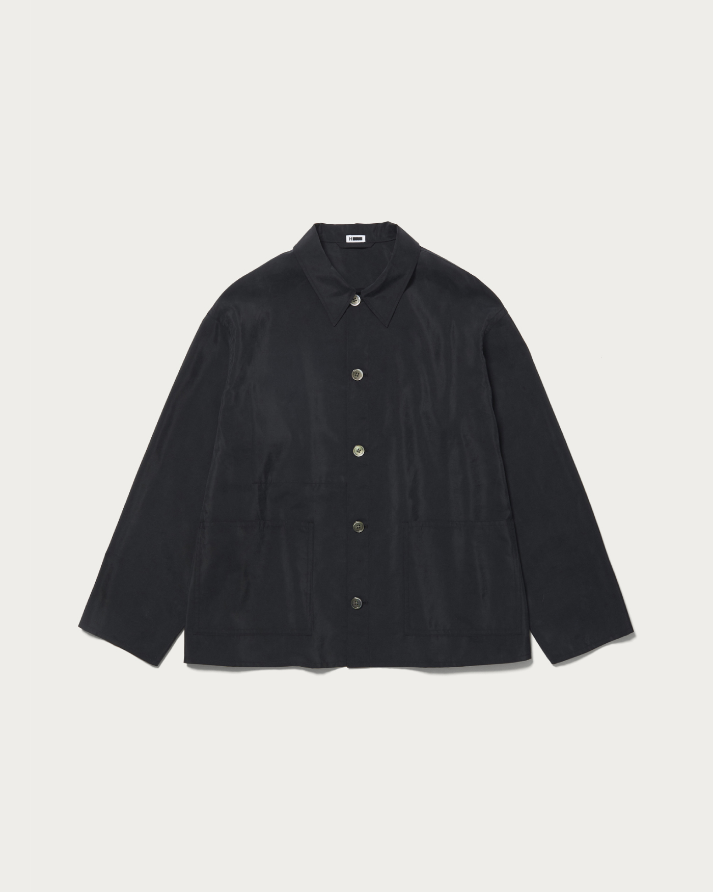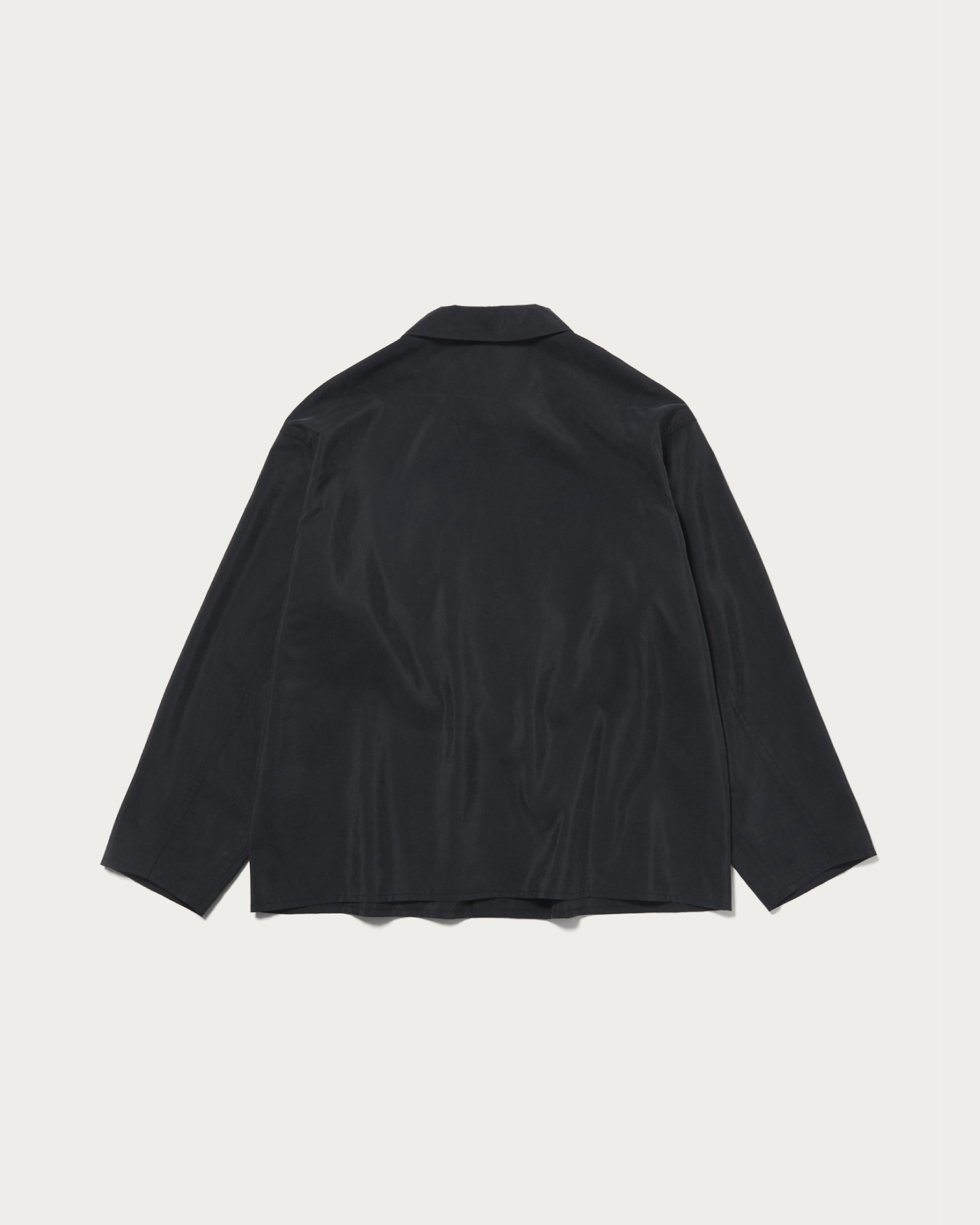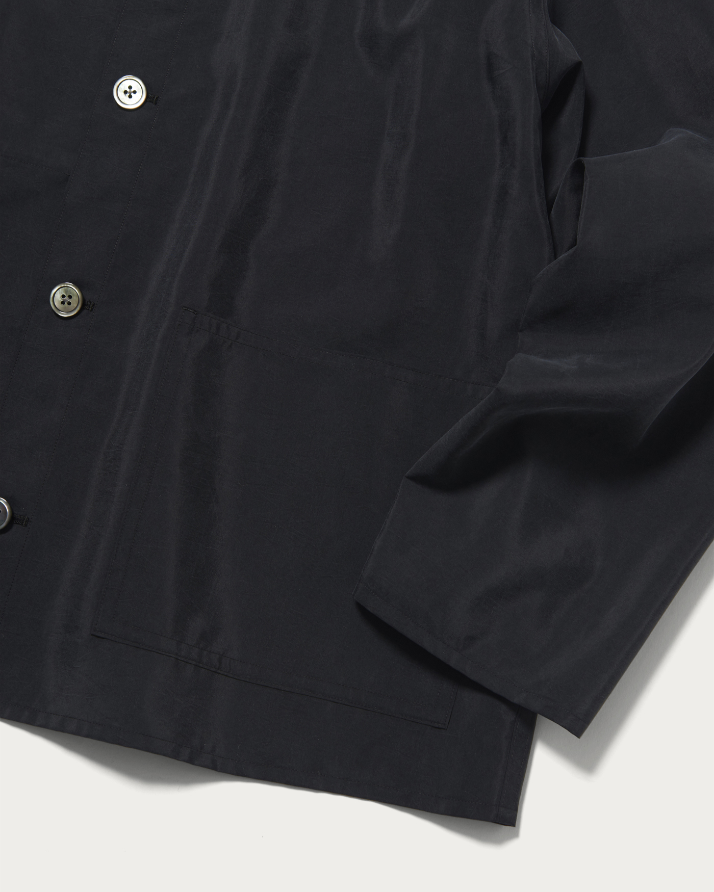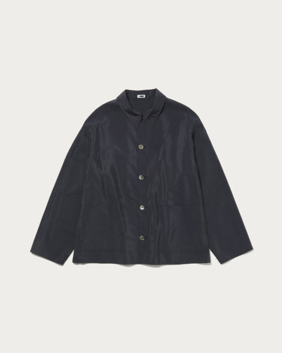 程良いショートレングスのカバーオールです。大きく象ったパッチポケットが特徴。とても軽く、シャツのように羽織れるライトウエイトアウターで、ボタンはホーンボタンを使用。シルクフィラメントとナイロンを交織して織り上げた高密度タフタ。仕上げに特殊加工を施しシルクがフィブリルして光沢が抑えられ、VINTAGEのような掠れた雰囲気に仕上がりました。男性でもカジュアル着として気軽に着やすい生地に仕上がっています。