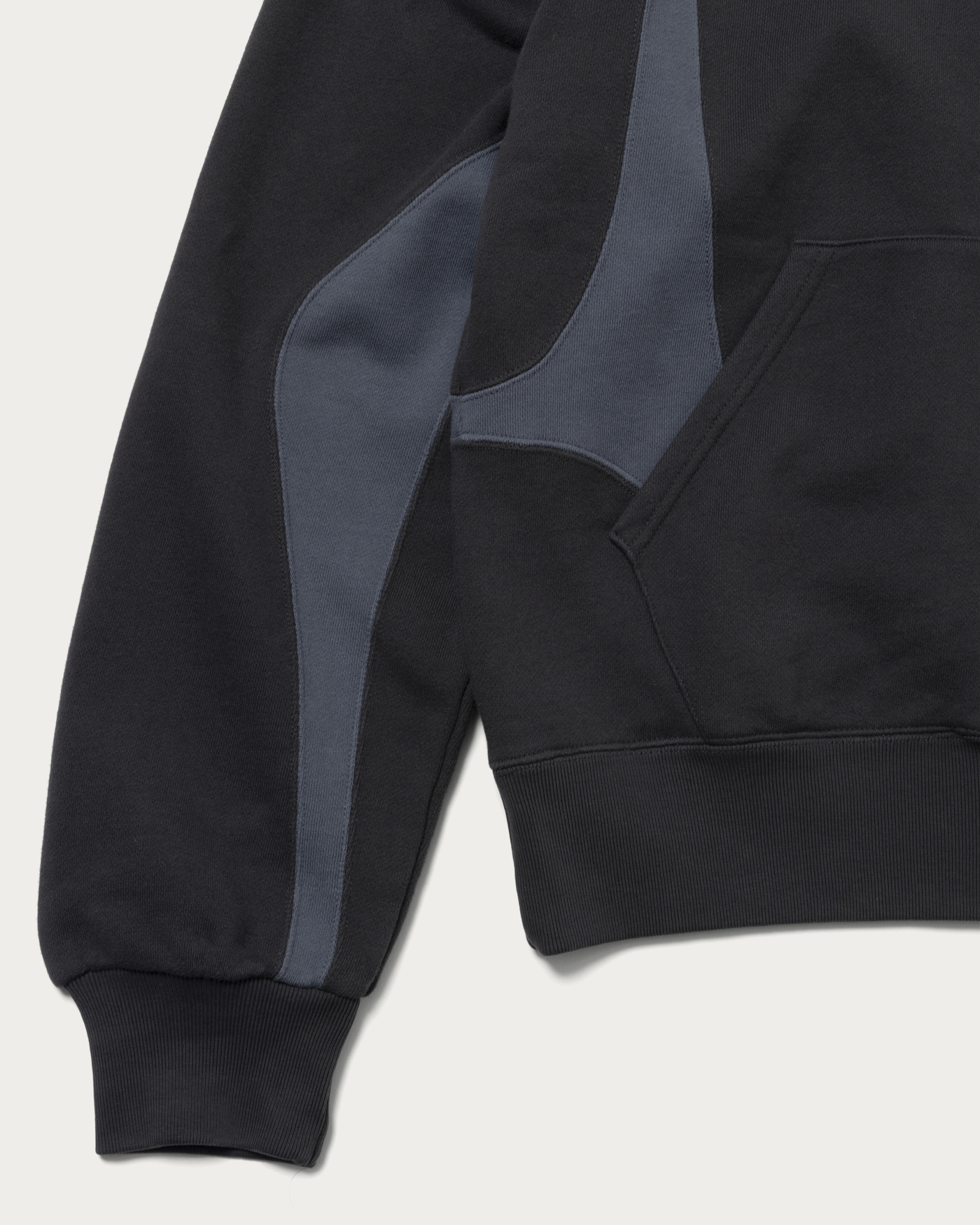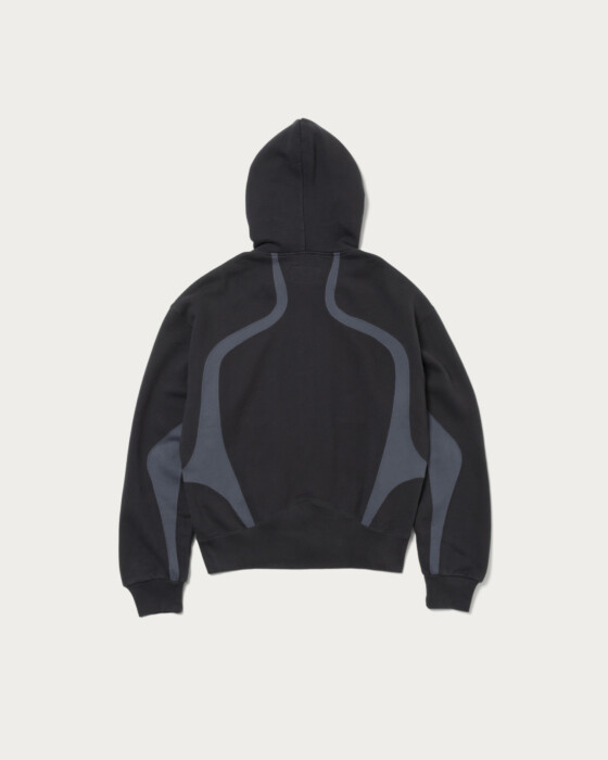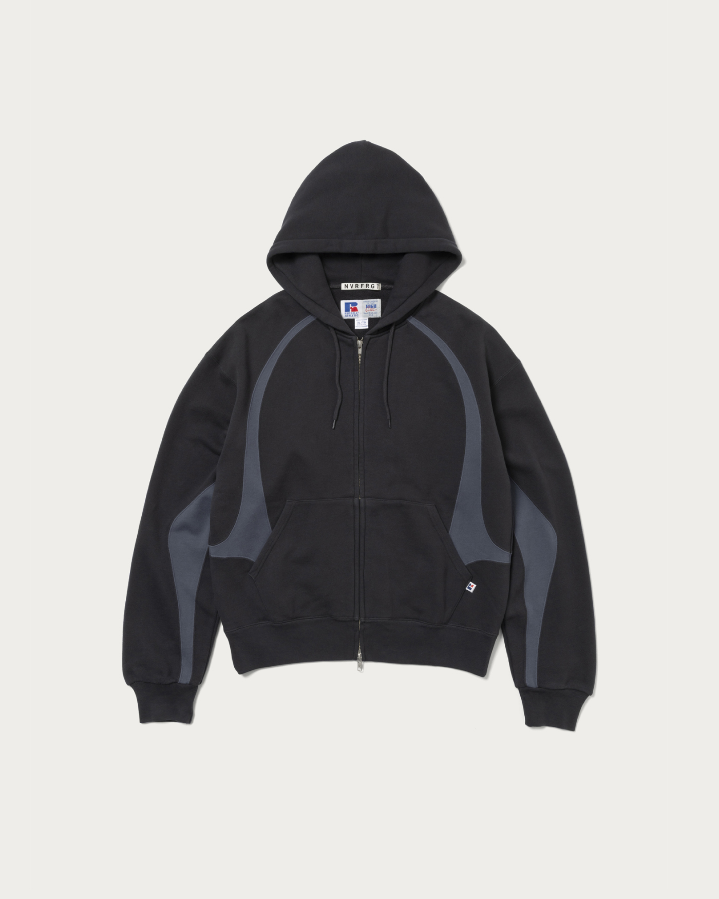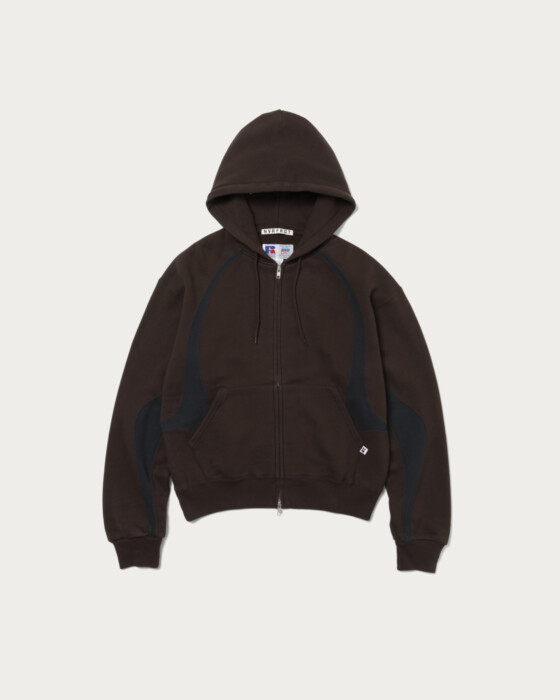 〈NVRFRGT〉と〈RUSSELL ATHLETIC〉との豪華トリプルネームコラボレーション。ヴィンテージ市場でも人気の高い1990~2000年代の〈RUSSELL ATHLETIC〉のジップフーディのシルエットをベースに、〈NVRFRGT〉の真骨頂でもある独自のパターンワークとカッティングをプラス。やや着丈が短いボックスシルエットのボディを2トーンカラーのパネルデザインが際立つ現代的な一着に再構築しました。