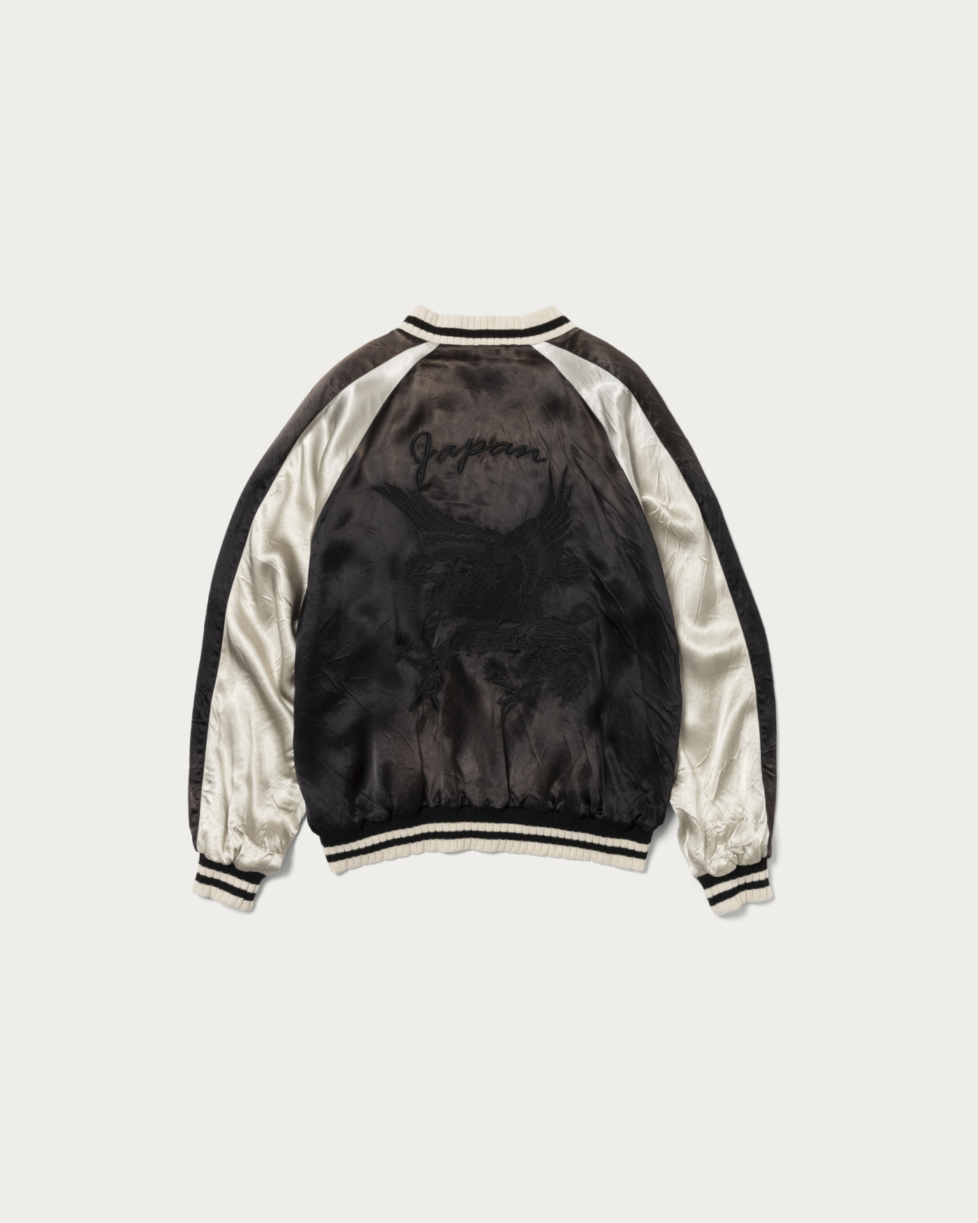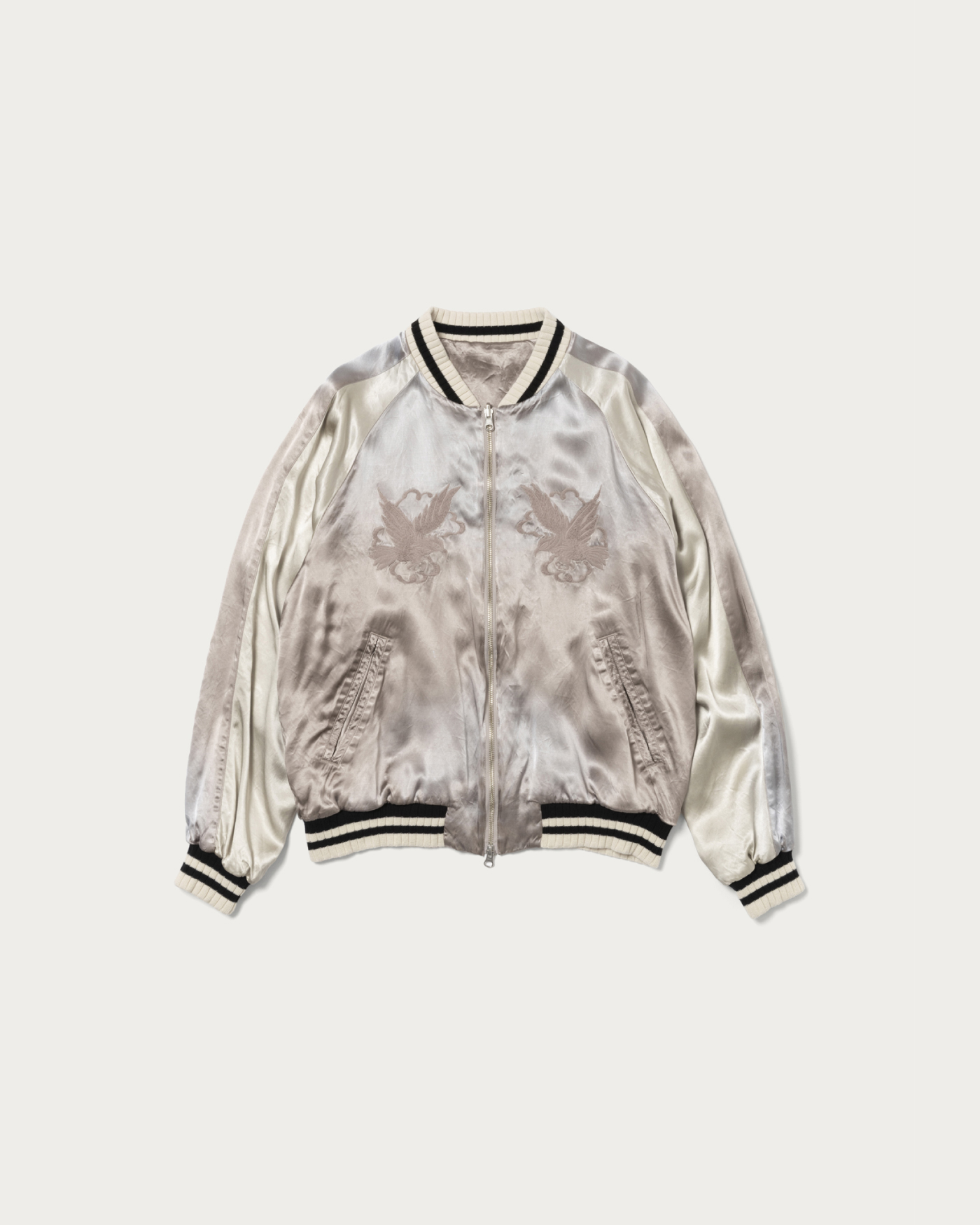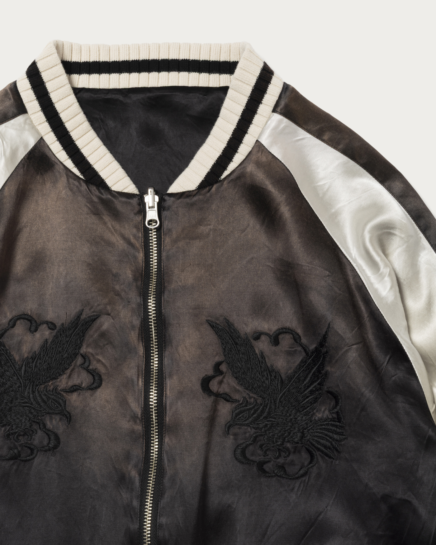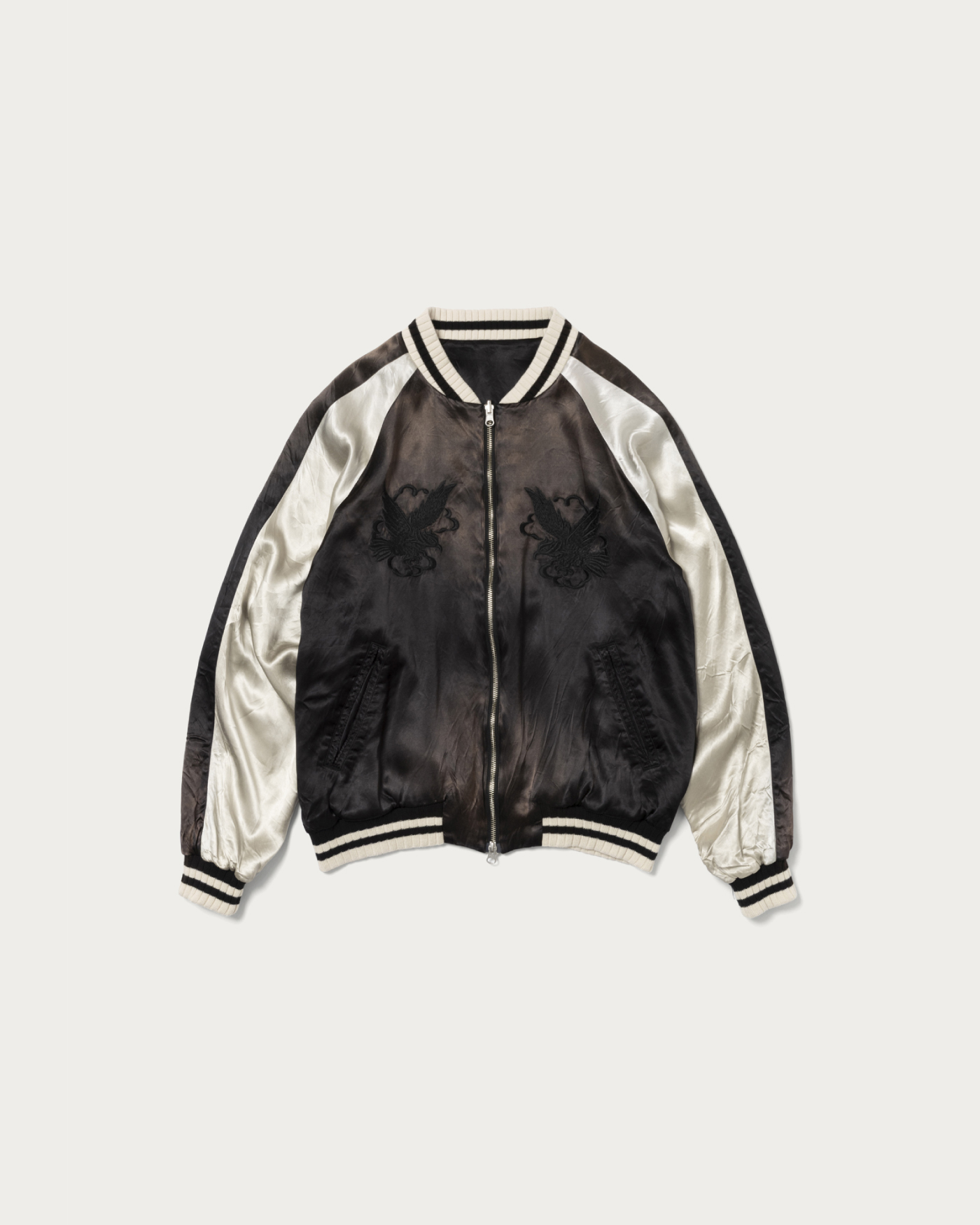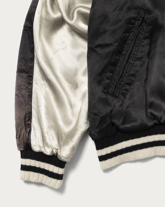 表面と裏面にレーヨンサテンを使用したリバーシブルのスーベニアジャケットです。表面のみ胸と背中に身頃と同色の刺繍入り。裏面は刺繍無しの為、全く違った印象で着用頂けます。また表面のみ随所に退色加工を施しビンテージアイテム風に仕上げています。