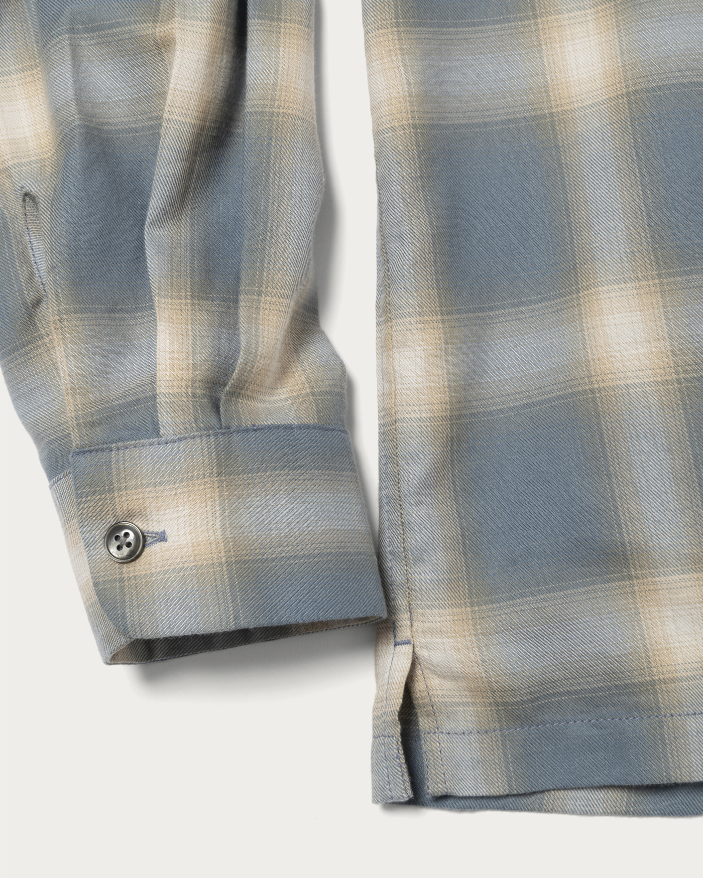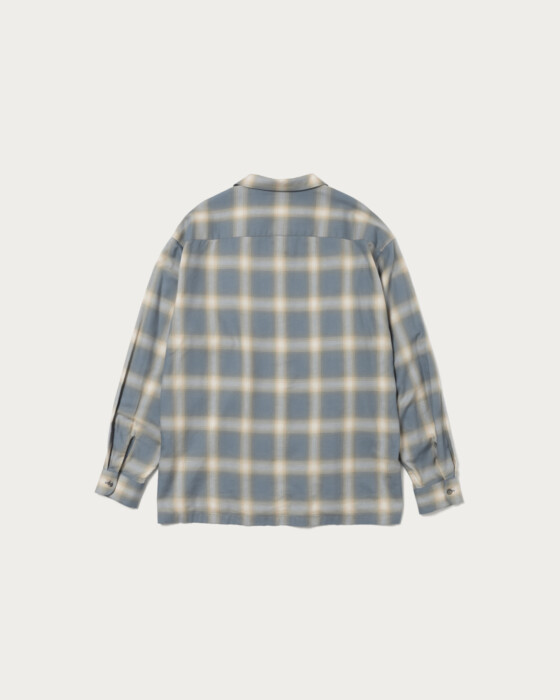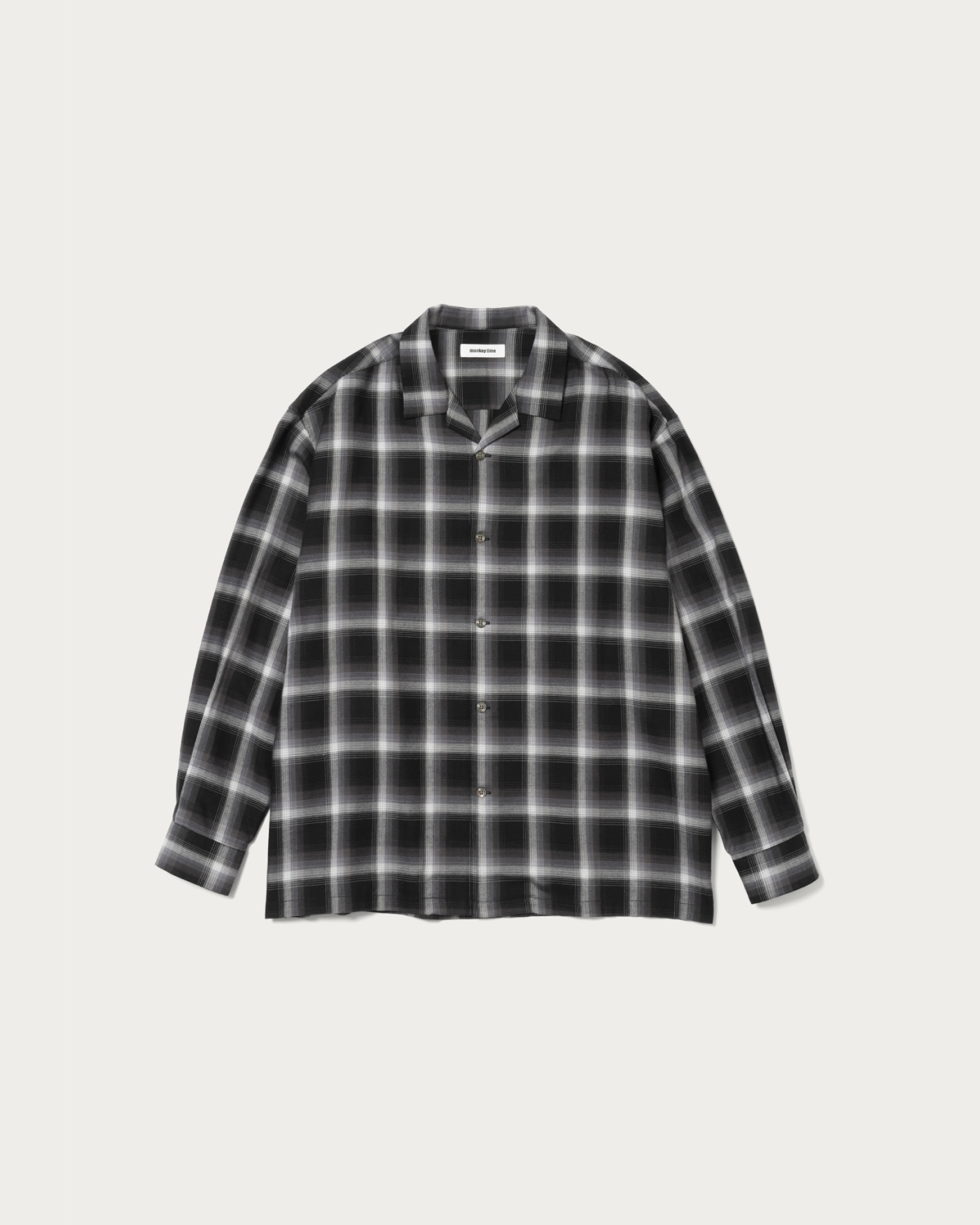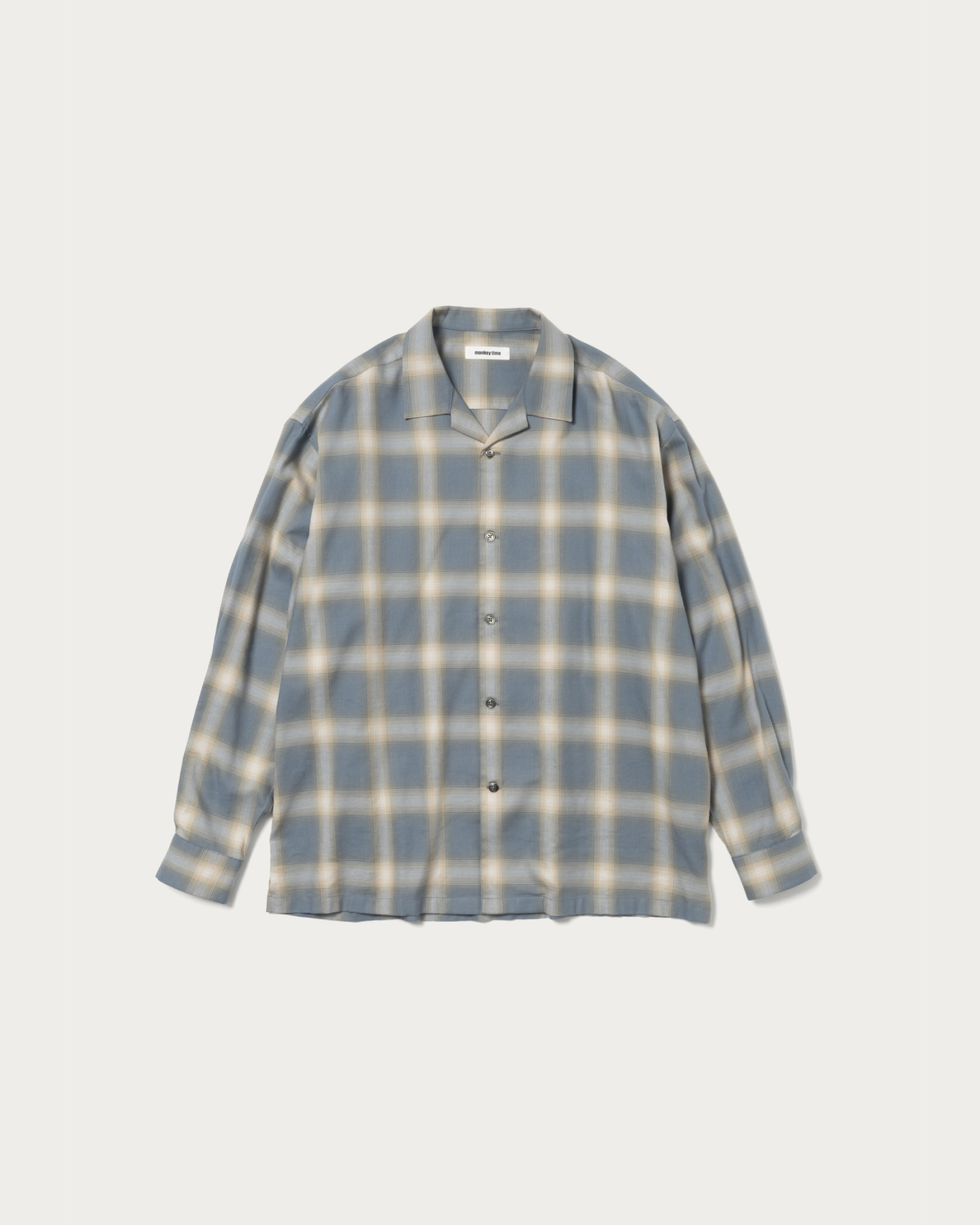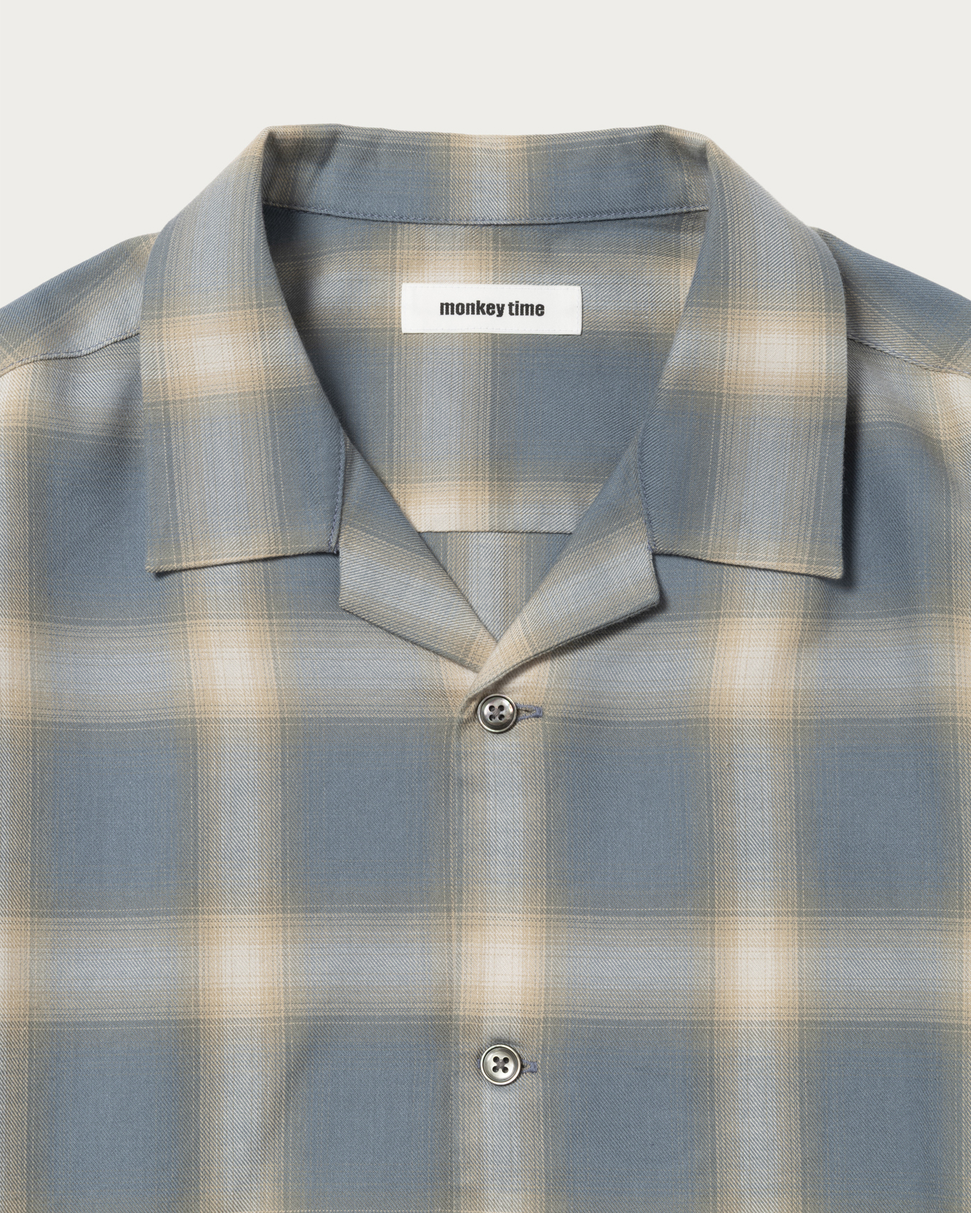 インナー使いから春の羽織まで活躍する肉感の綿/レーヨンオンブレチェック生地を使用したオープンカラーシャツ。光沢が少なくレーヨンの落ち感もありつつ、綿混の安心感もあり夏以外は活躍するアイテムです。