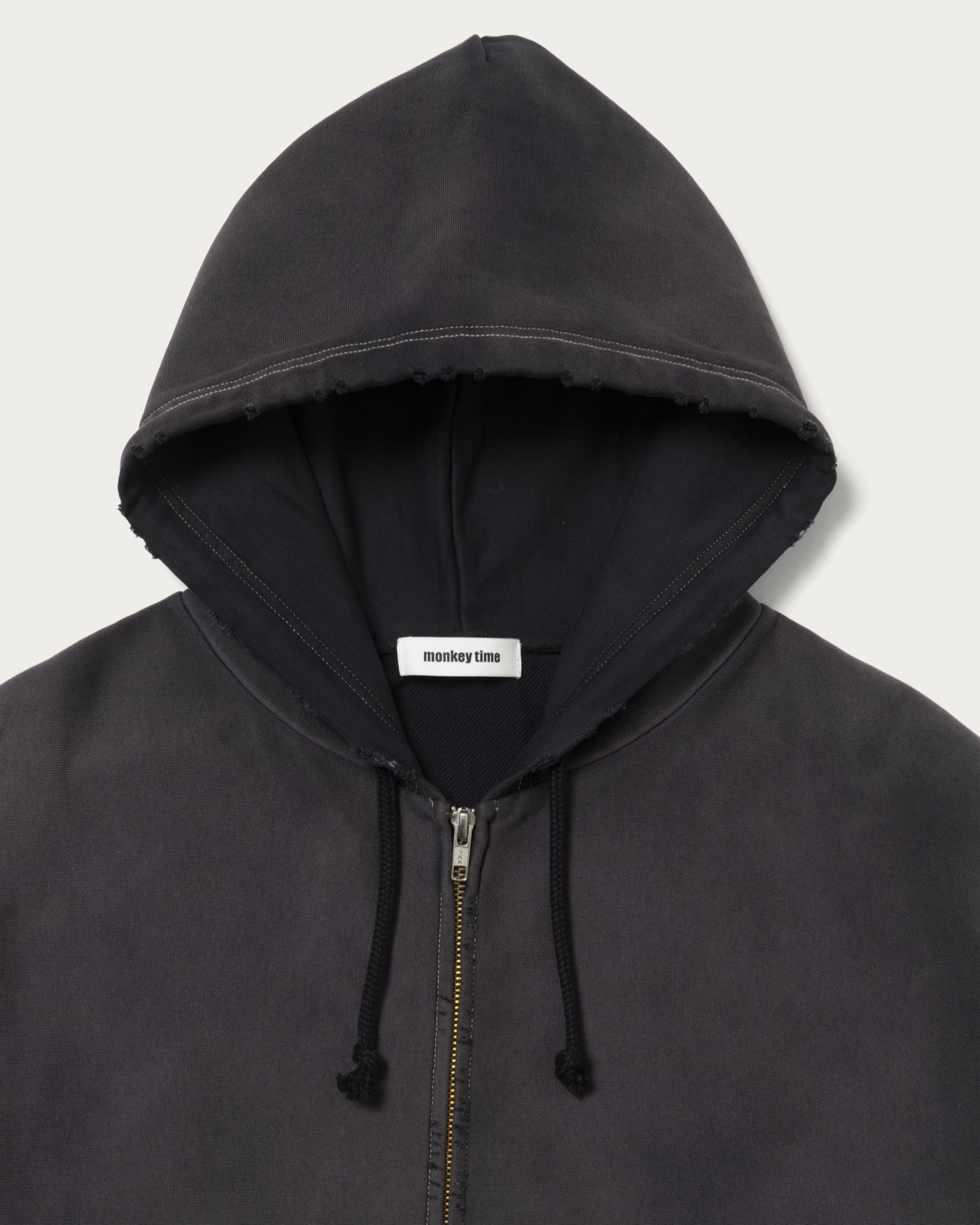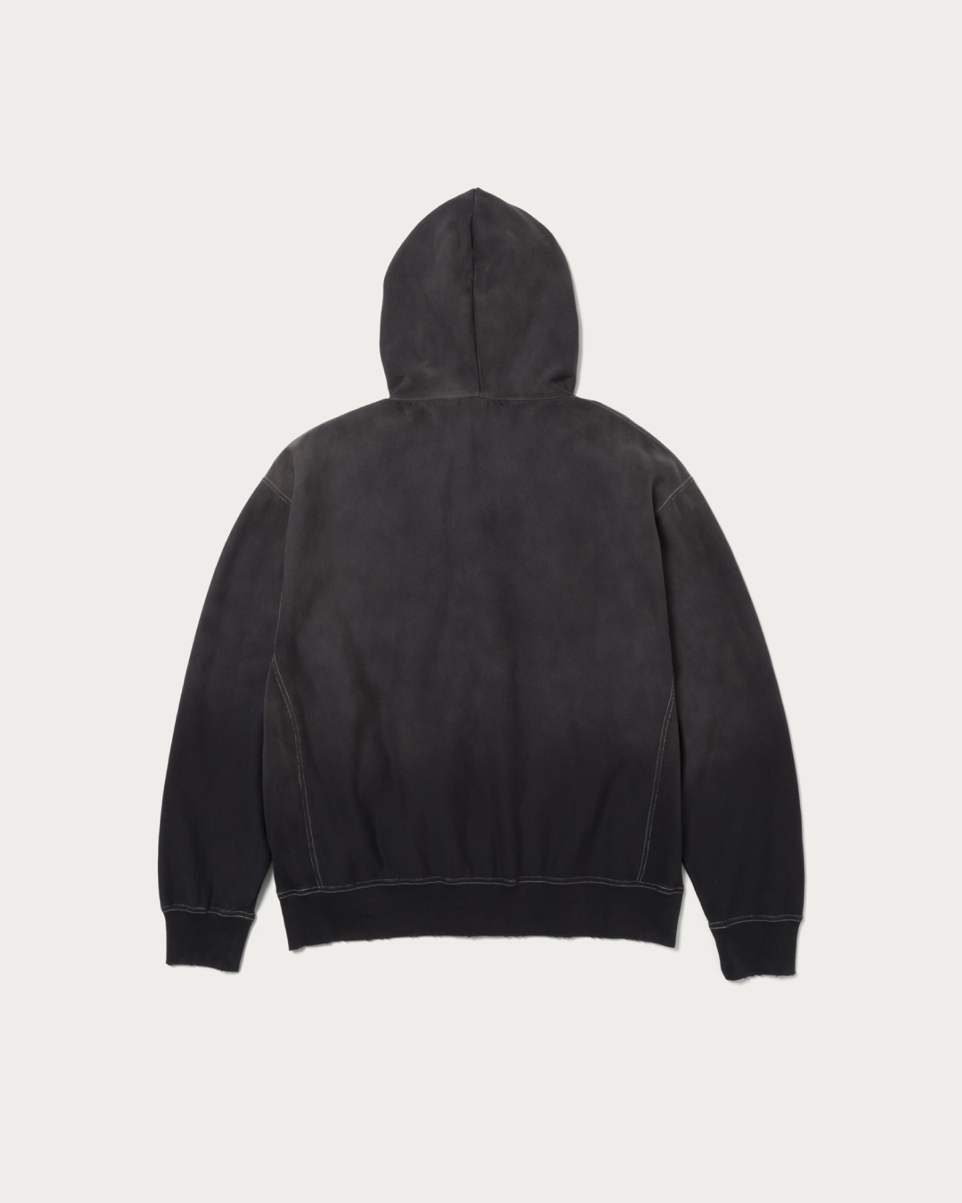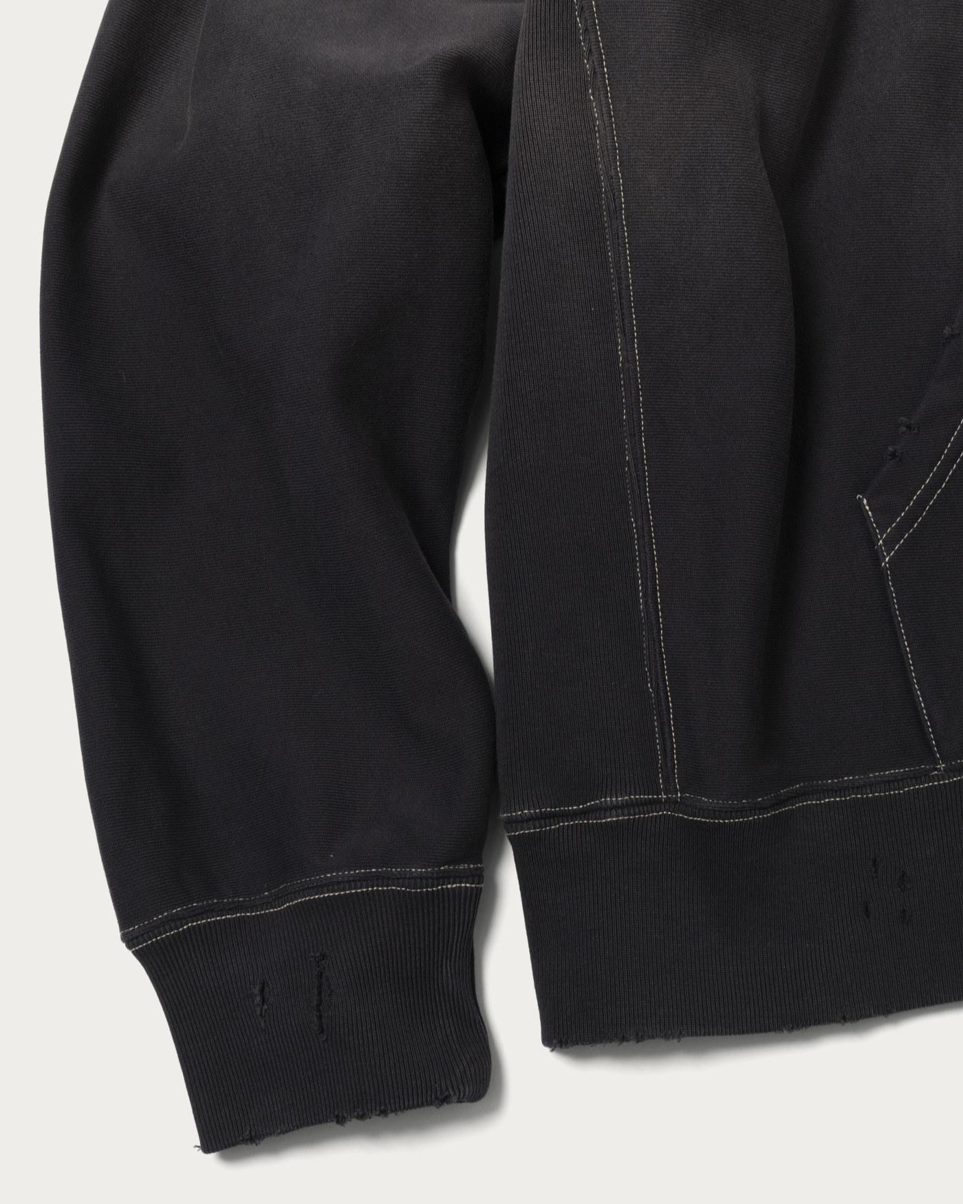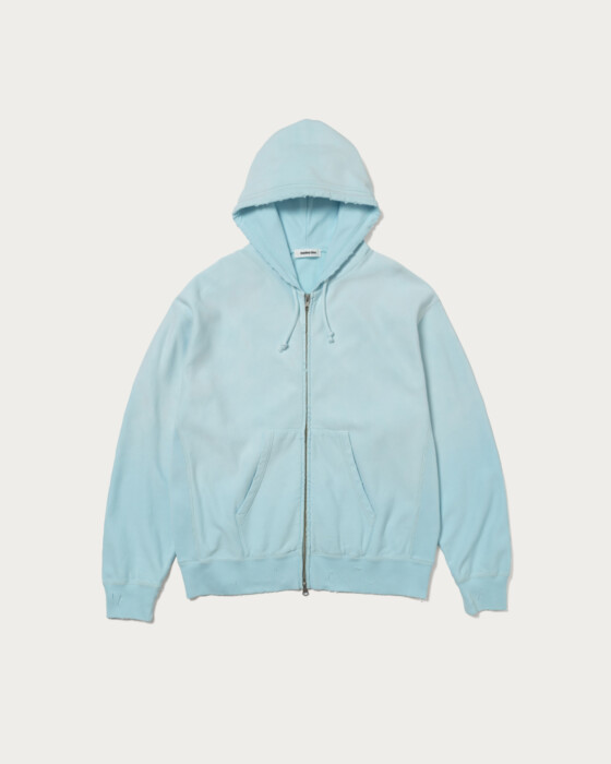 夏以外の3シーズン活躍するしっかりとした肉感の裏毛(裏起毛無し)を使用したフルジップパーカ。随所に入ったダメージ加工と日焼け加工による退色感が特徴です。ゆったりとしたサイズ感で春の羽織としても着映えのするアイテムです。