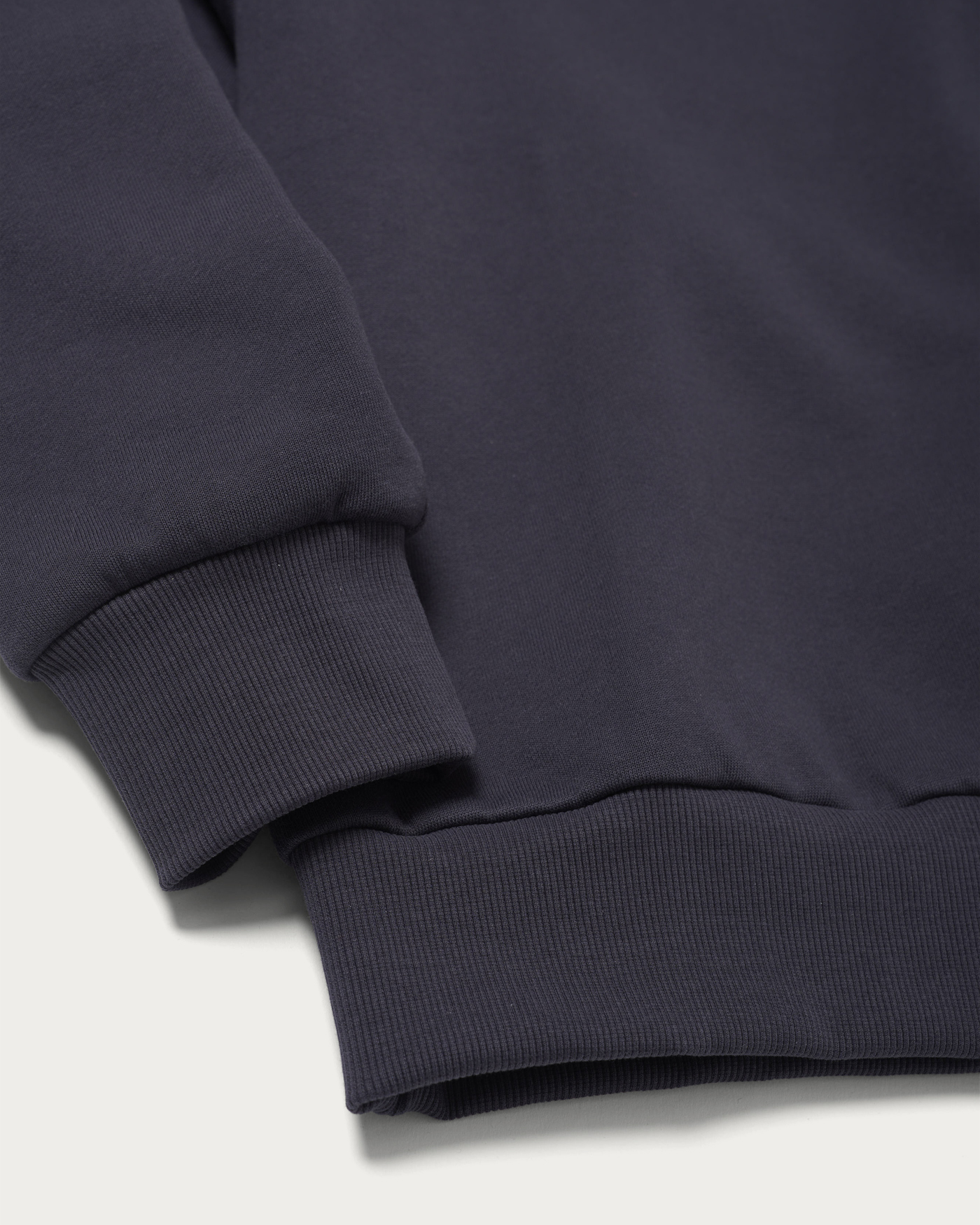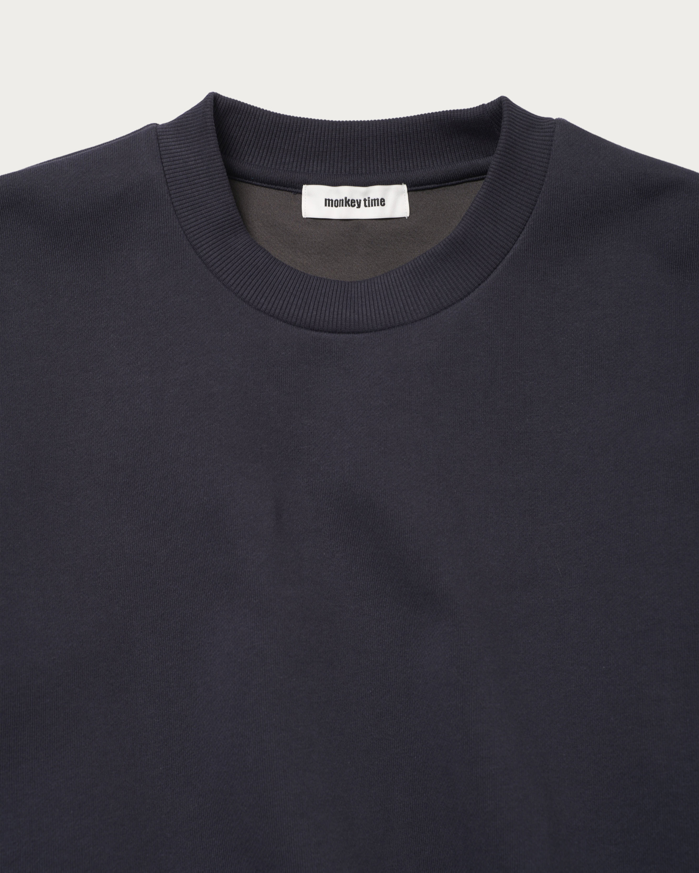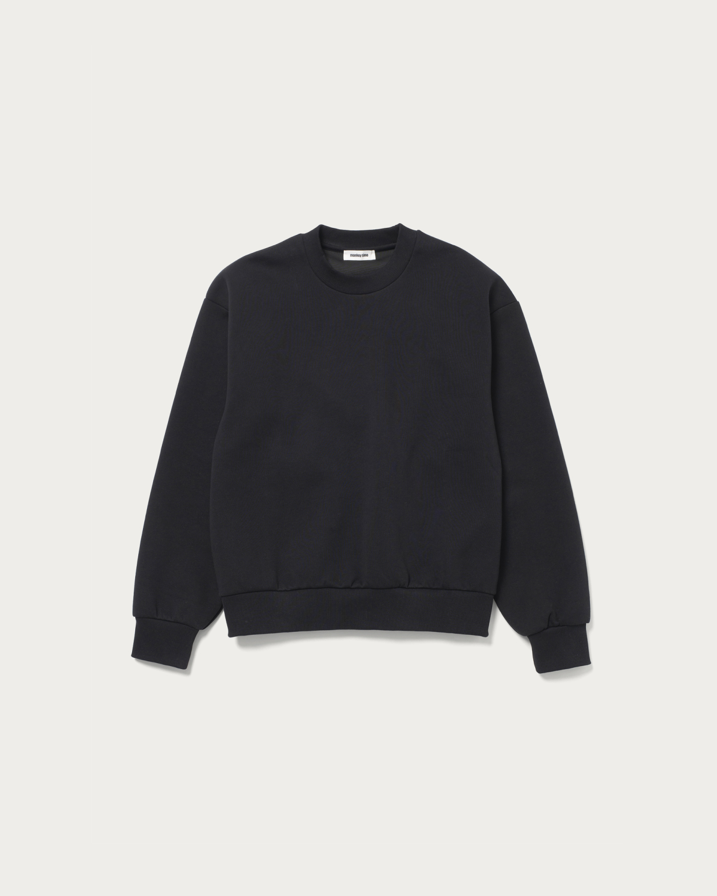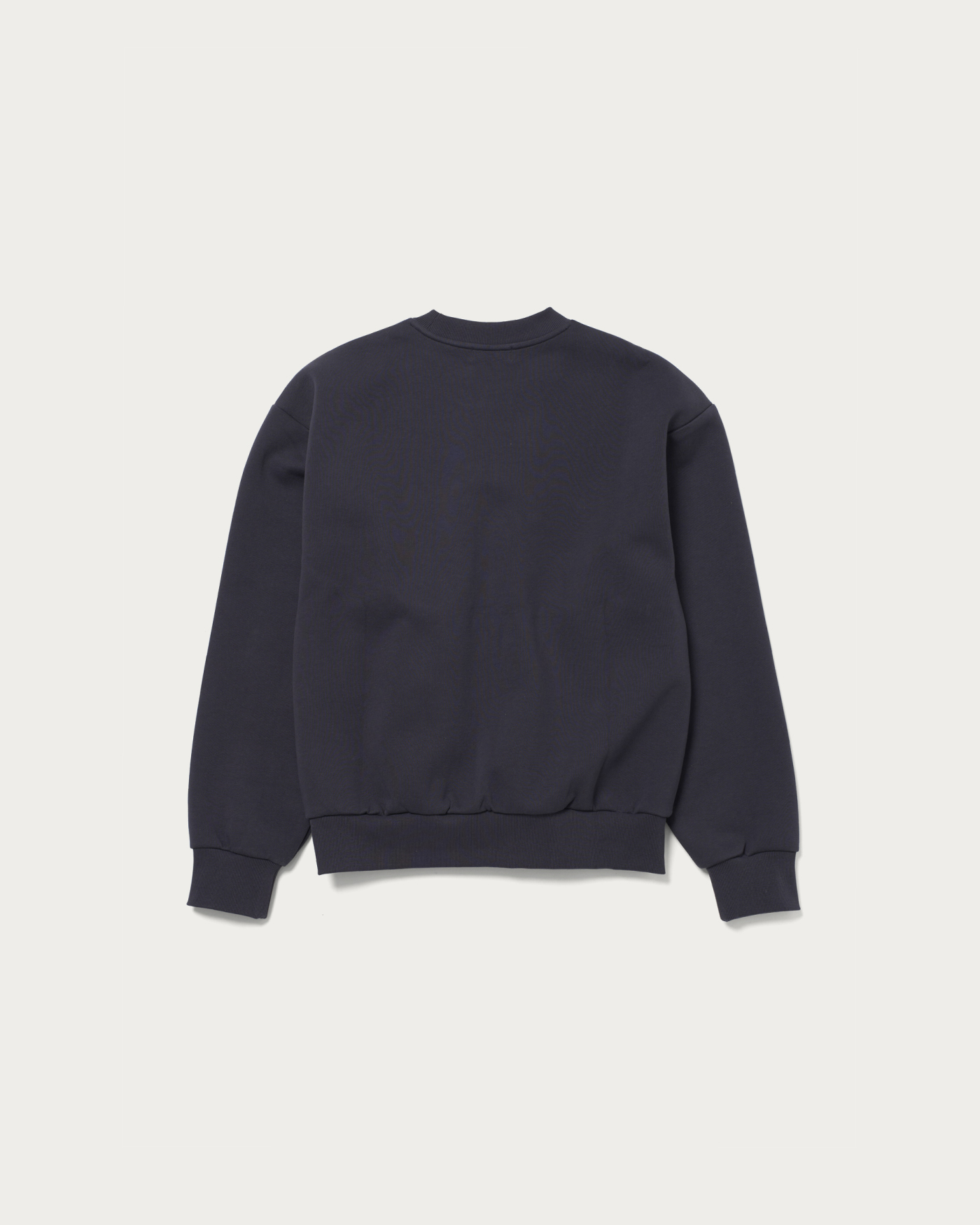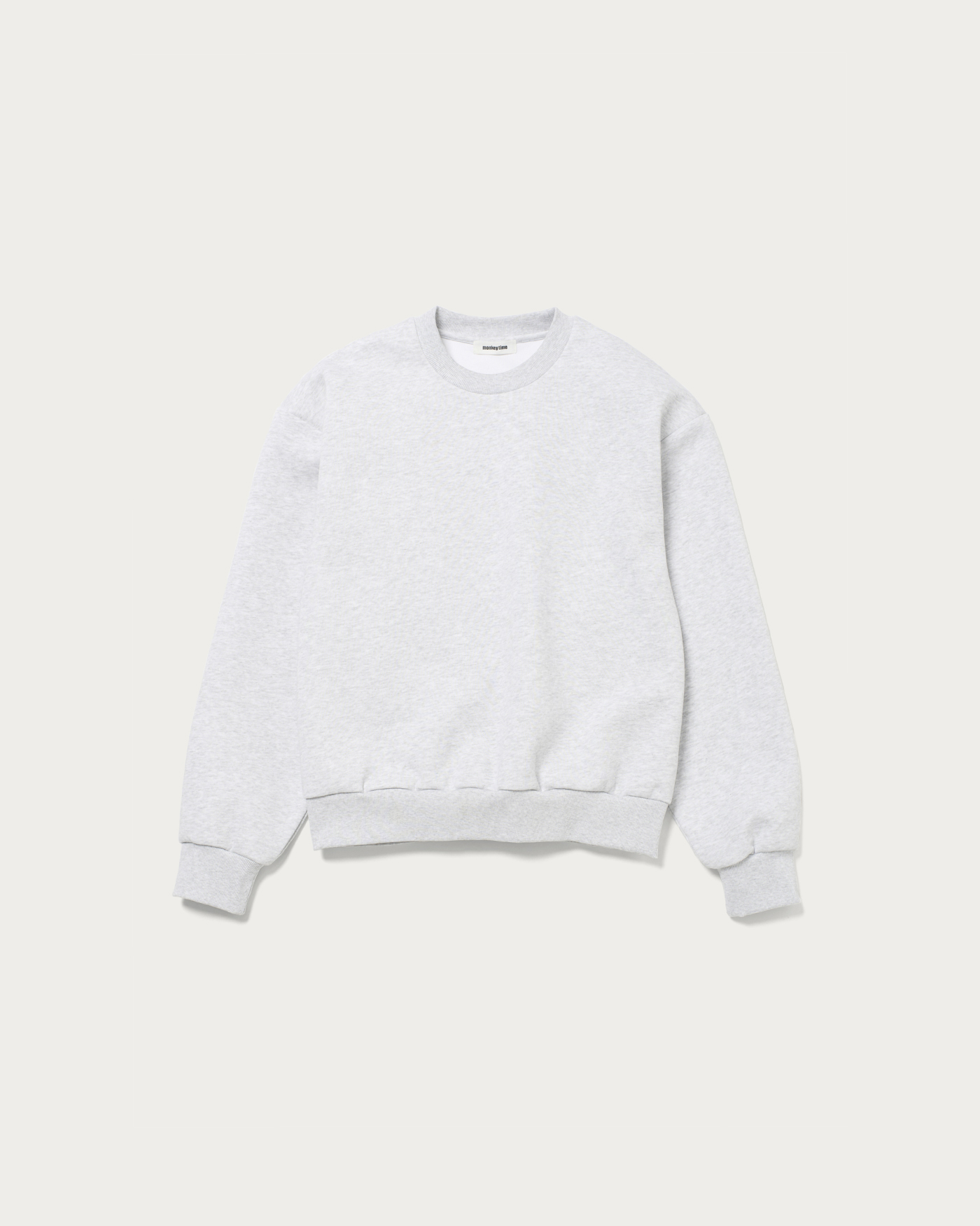 表面に裏毛、裏面に天竺のボンディング素材を使用したプルオーバークルーネック。表面と裏面の間にソフトで極薄のフィルムを挟み込む事で風の侵入を軽減させる仕様にしています。全体的に丸みを帯びたシルエットでセットアップで着用可能なボトムの展開もあります。