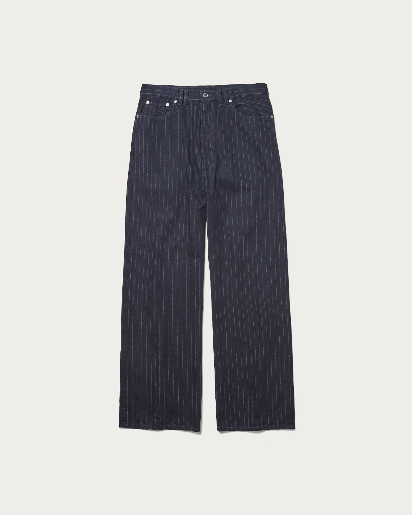 13oz程度のしっかりした肉感のドビーストライプのデニム素材を使用したバギーパンツ。ワイドシルエットにストライプが映えるおすすめのアイテムです。