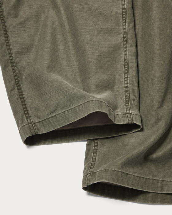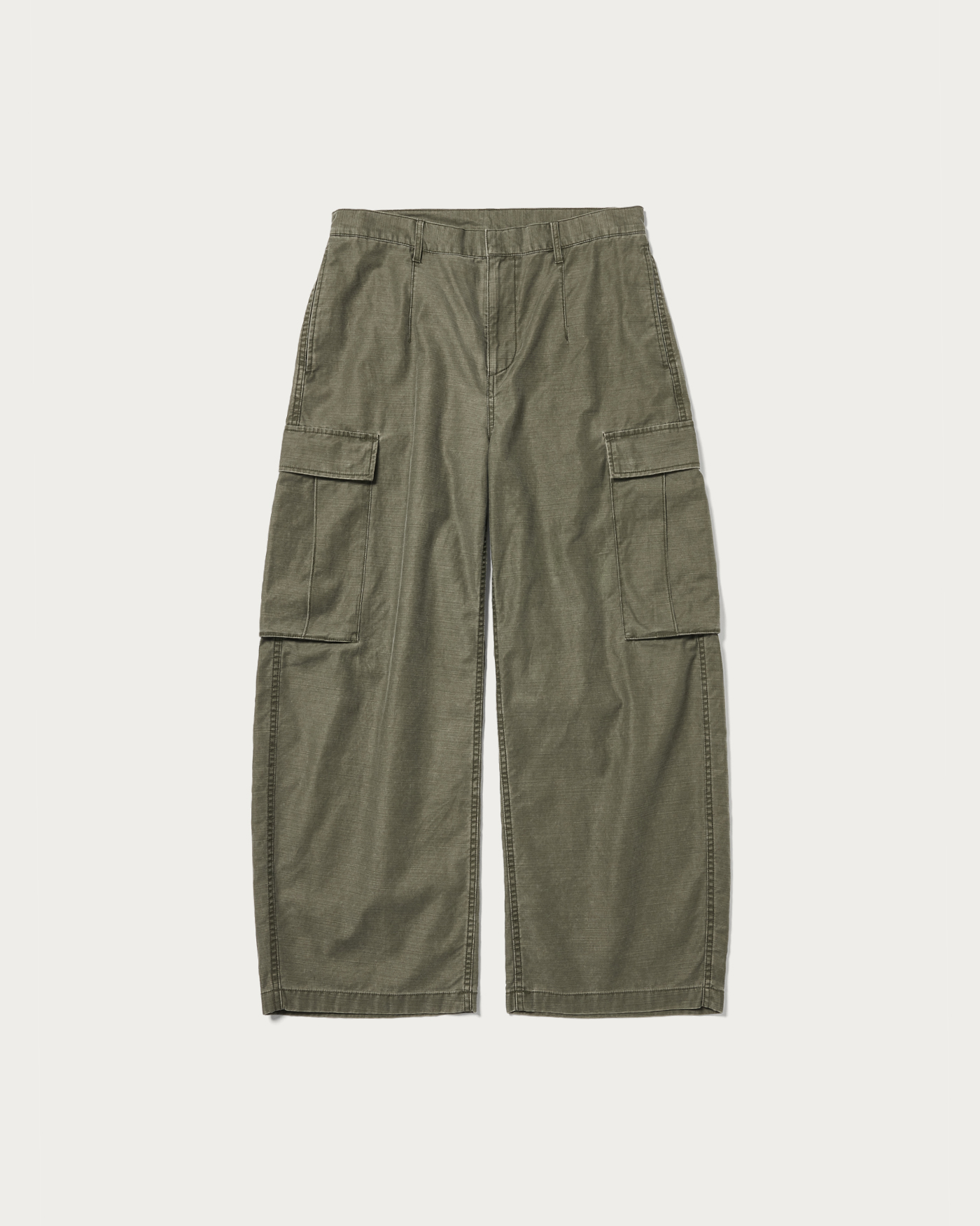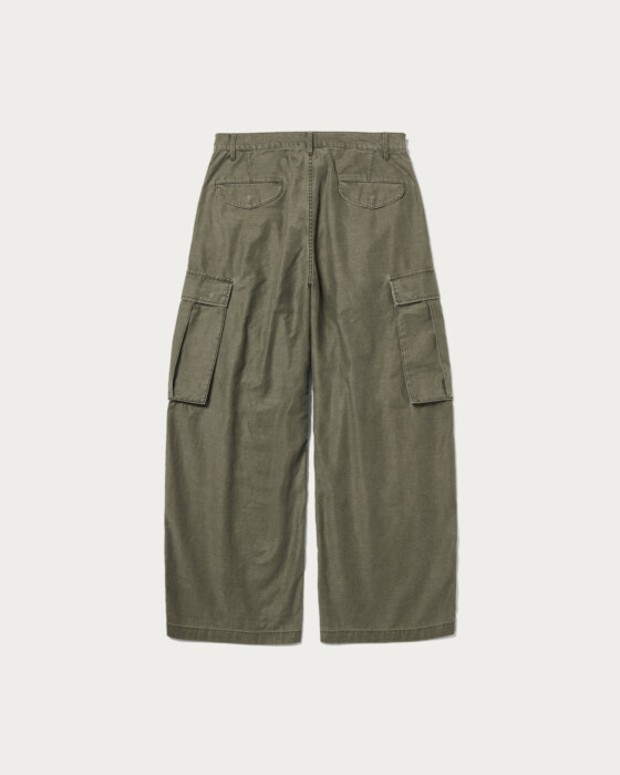 バックサテン生地にピグメント加工を施した素材を使用し、製品洗いで退色感を出したカーゴポケット付きカーブパンツ。脇線に沿って描くアウトカーブのシルエットが特徴です。