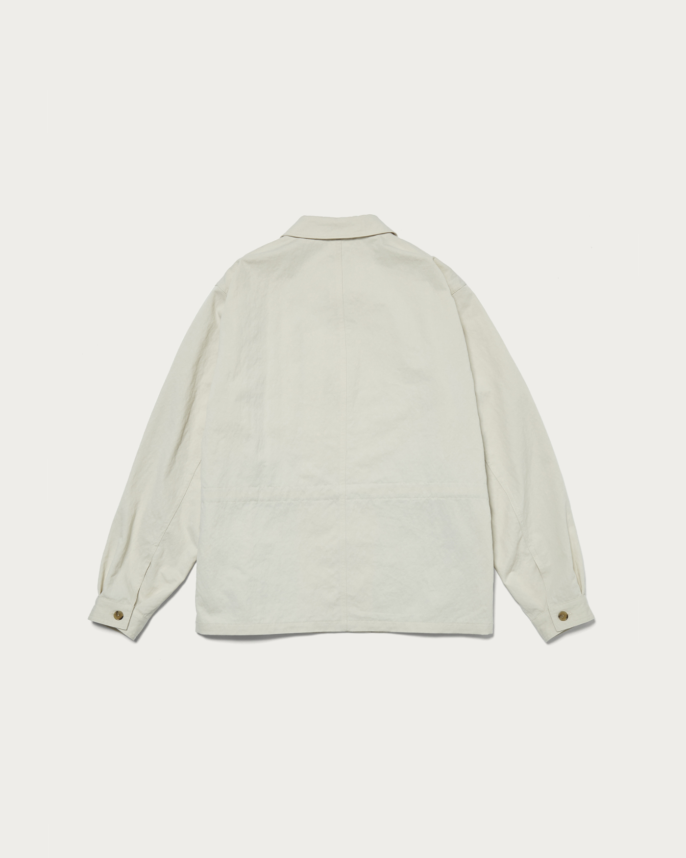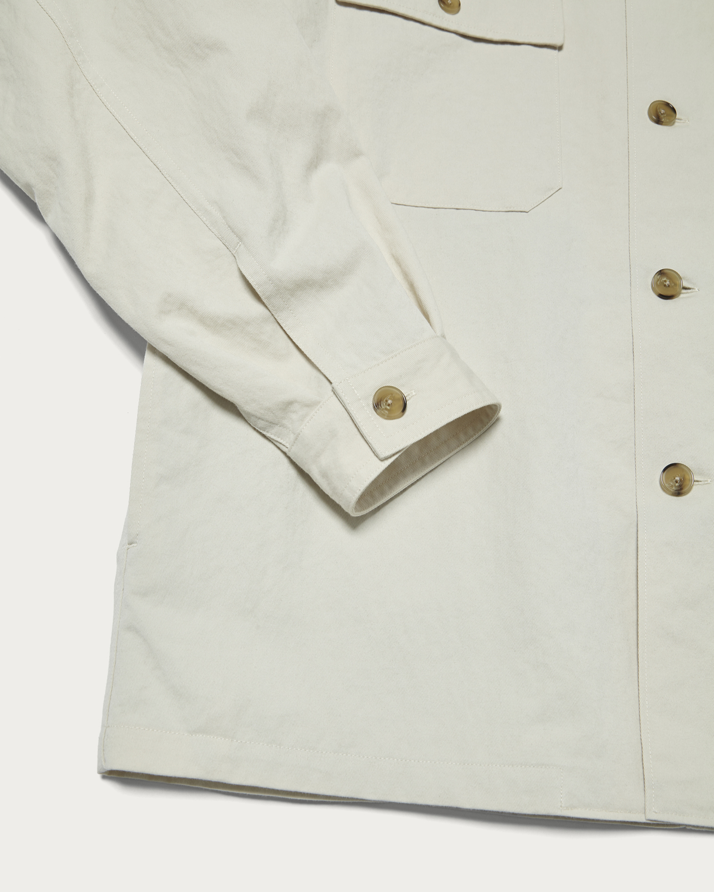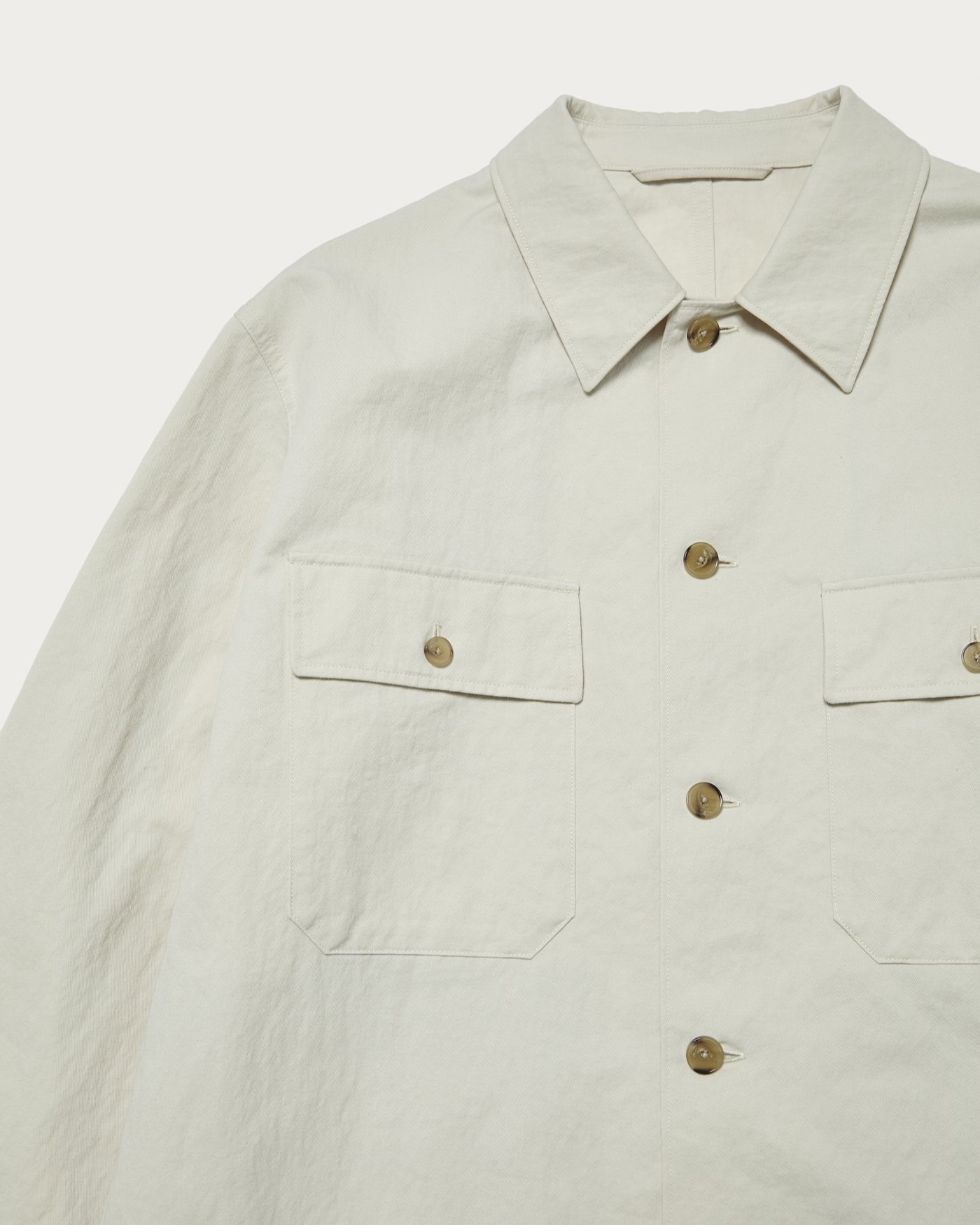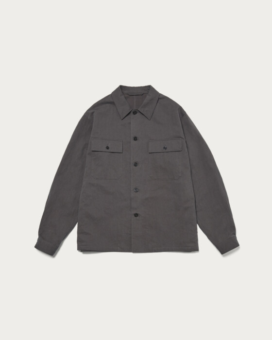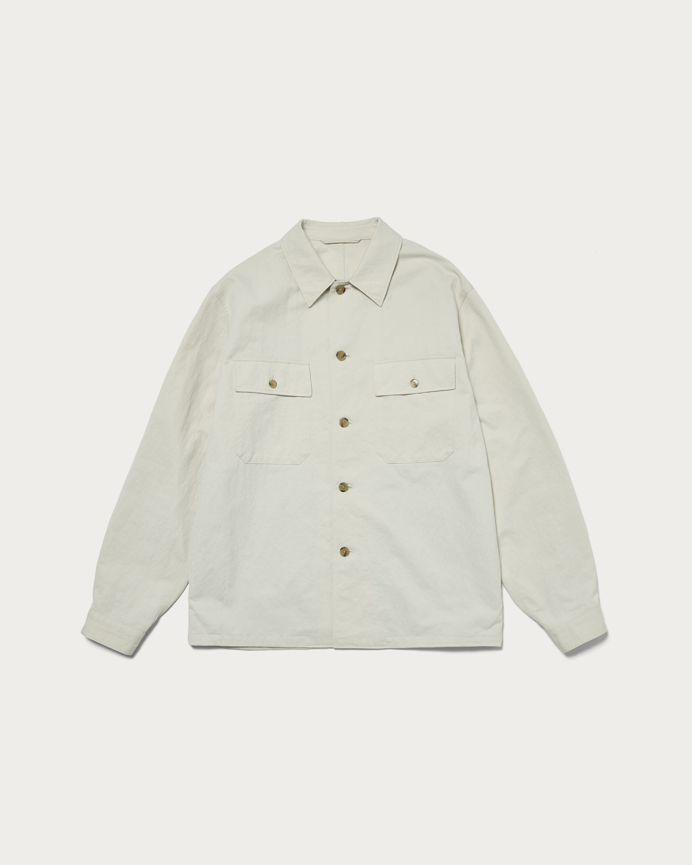 ミリタリー由来のCPOシャツを、現代的なバランスでモダナイズした一着。大きめに配した胸ポケットがデザインのアクセントとなり、脇シームを活かした腰ポケットを備えることで、アウターとしても活躍する仕様に昇華しています。素材には、揉み込むように洗いをかけることで表面にワッシャー感と微起毛感を与えたツイル生地を使用。こなれた表情に加え、ナイロンを混紡することで見た目以上の軽さと程よい光沢を実現しました。反撥感のある素材特性により、着用時には立体感と丸みのあるフォルムが生まれます。