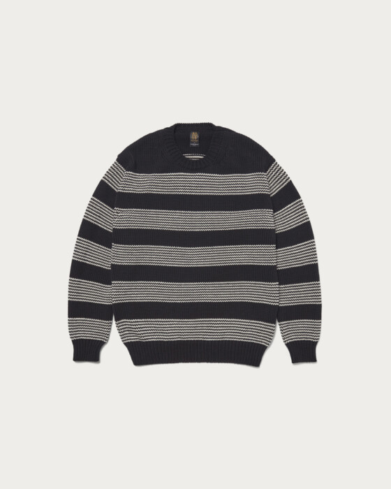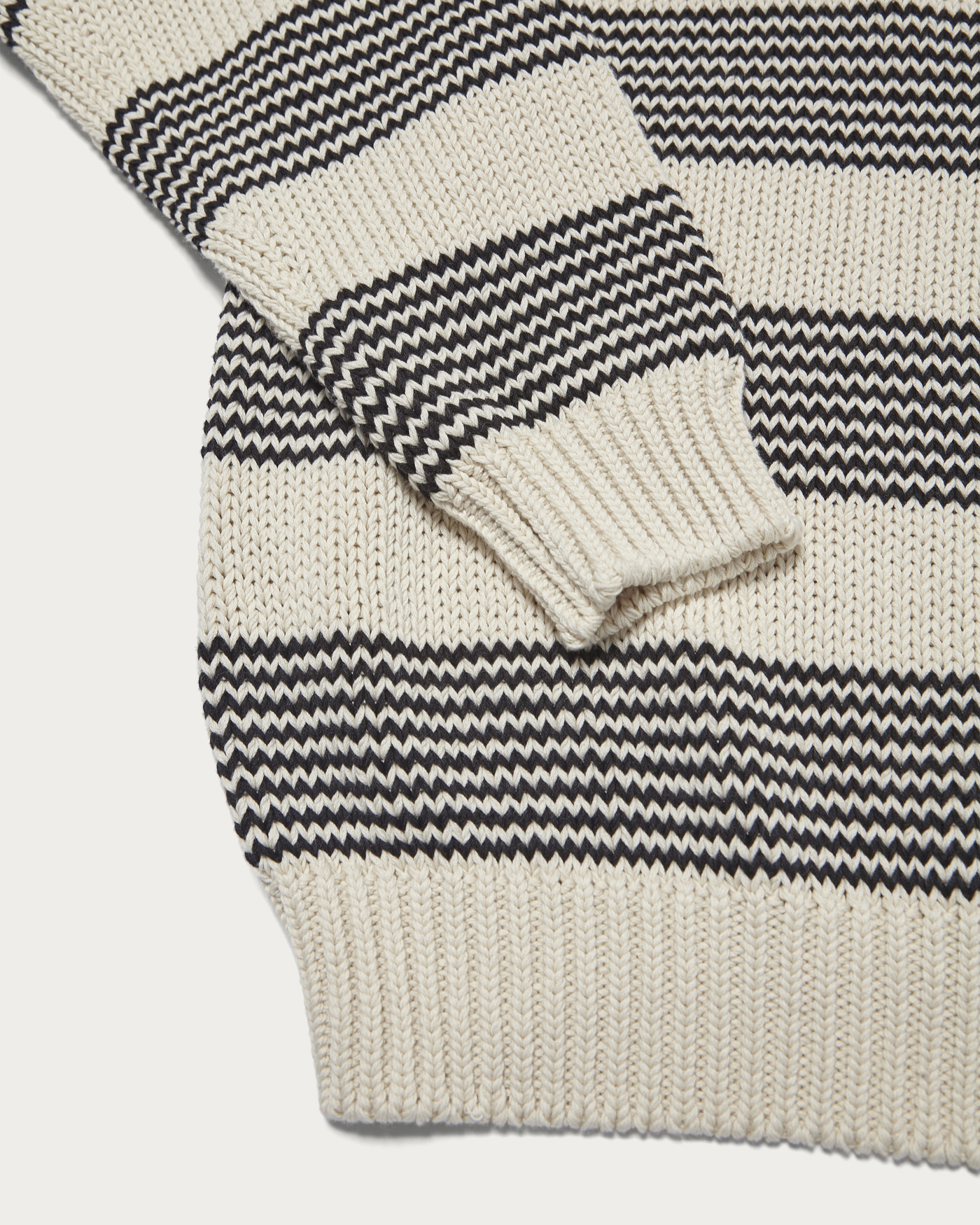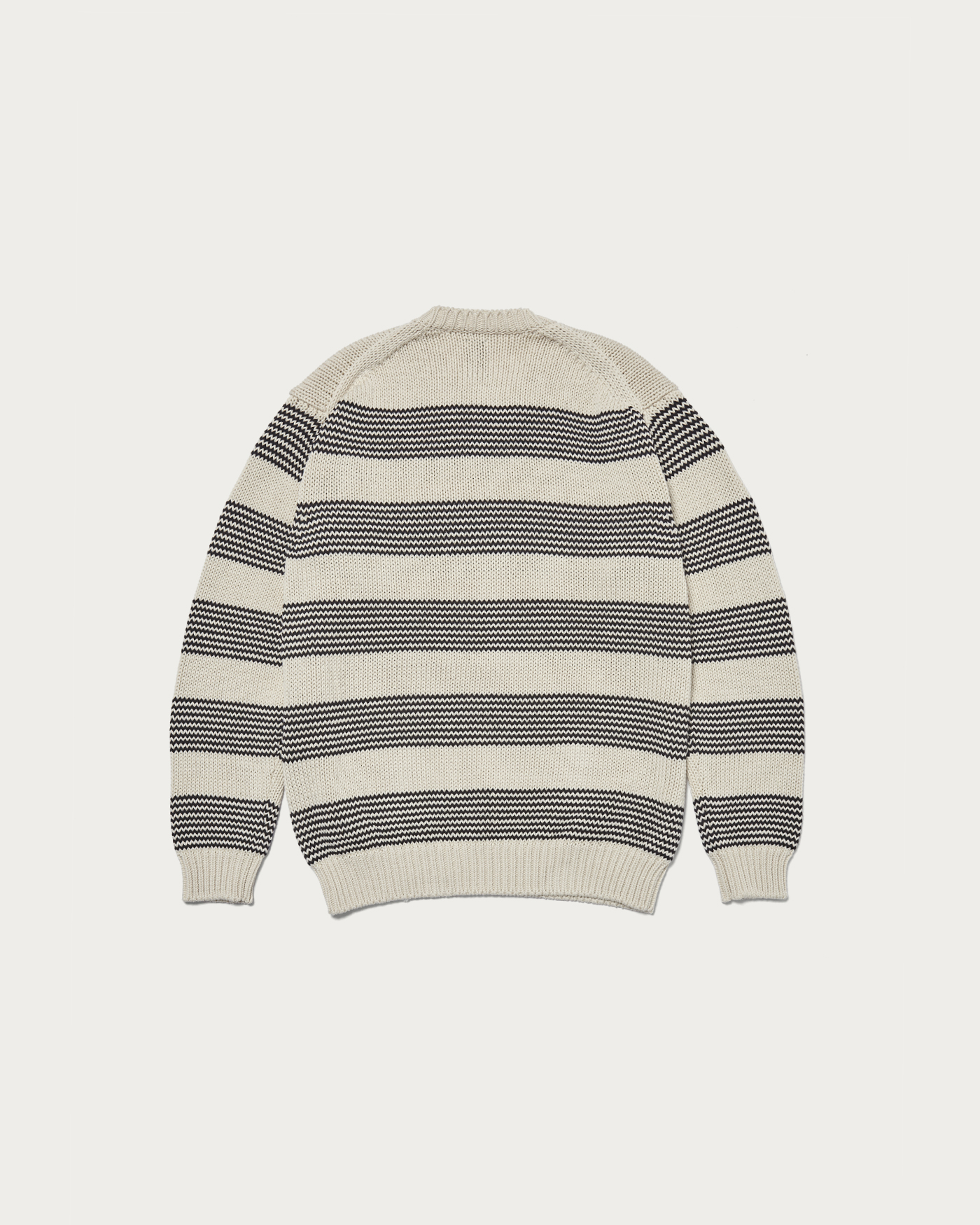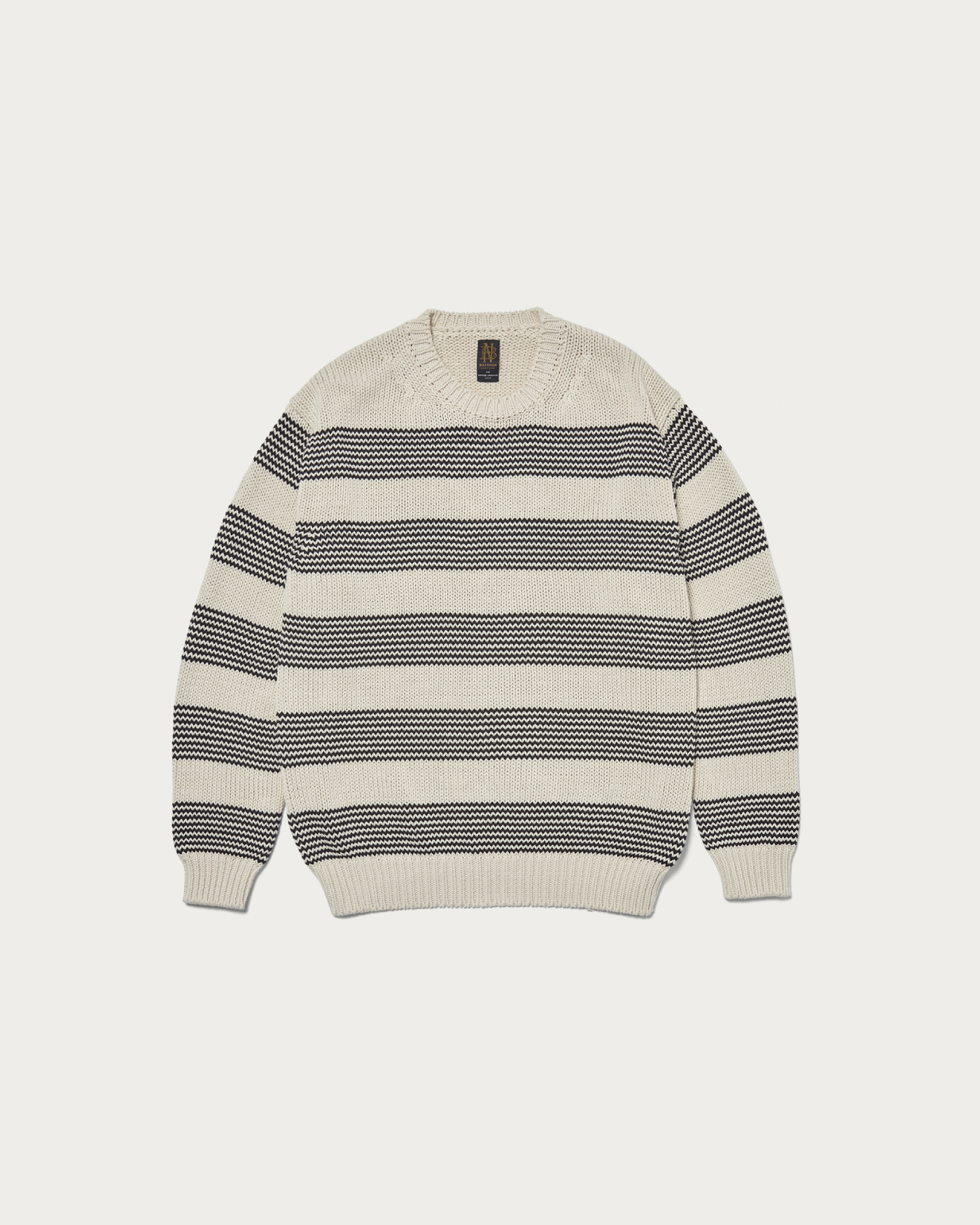 ワイドピッチのボーダーに、さらにボーダーを重ねたダブルボーダー柄。ありそうでないグラフィカルな表現が、ポップさと個性を感じさせる一着です。オフホワイト×ブラックのモダンな配色により、クールで洗練された印象に仕上げています。