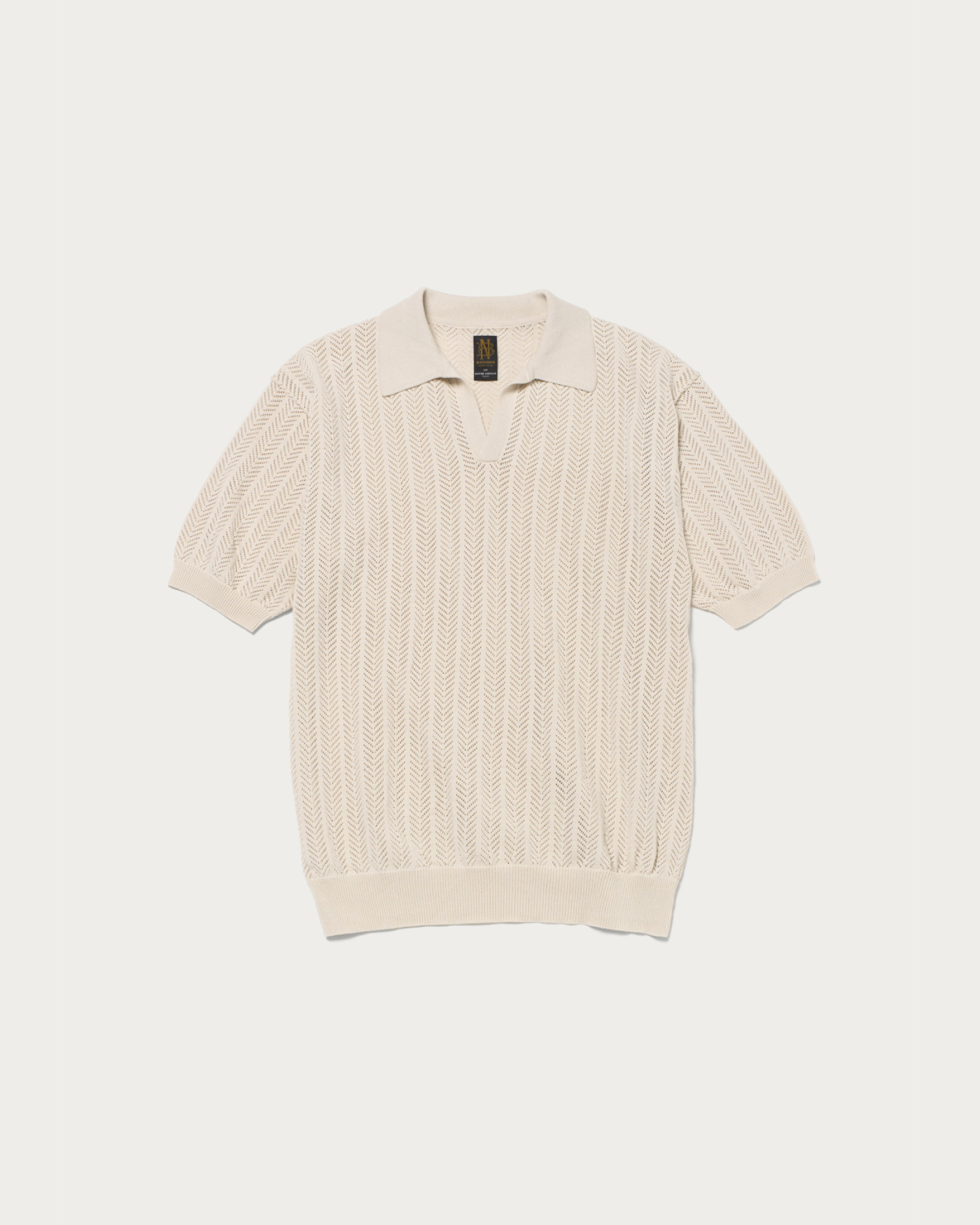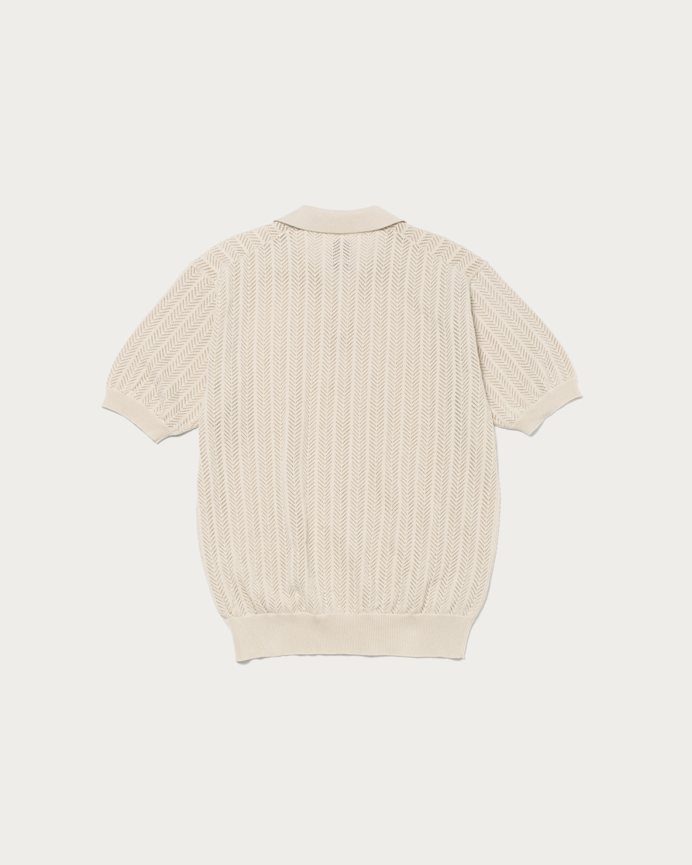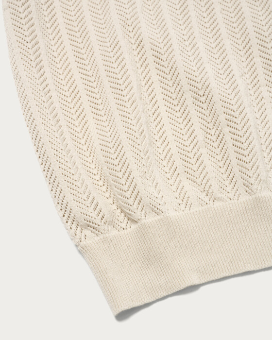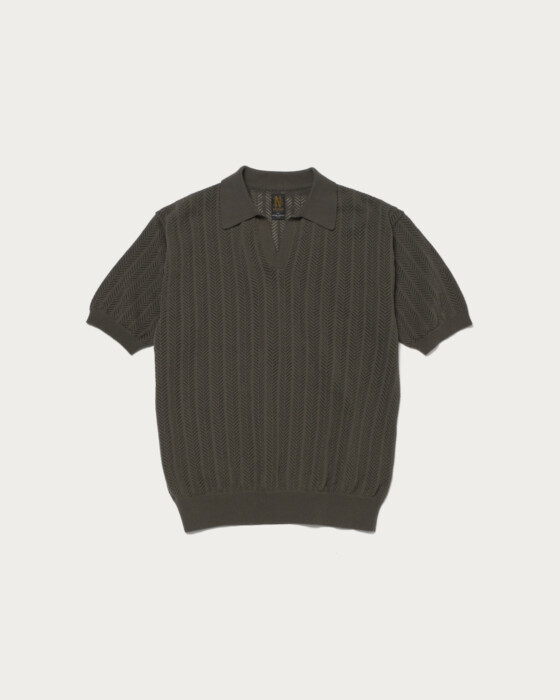 ヘリンボーン編地が特徴的な、スキッパーを別注。細かなヘリンボーン柄は透けすぎることがなく、男性でも取り入れやすい透かし編みのデザインです。肌離れの良い強撚素材を使用しており、暑い時期でも涼しく快適に着用できます。抜けのある襟周りが特徴で、襟の角度を浅くすることで軽快さと収まりの良さを両立し、リネンジャケットや羽織りのインナーとしてもおすすめです。
