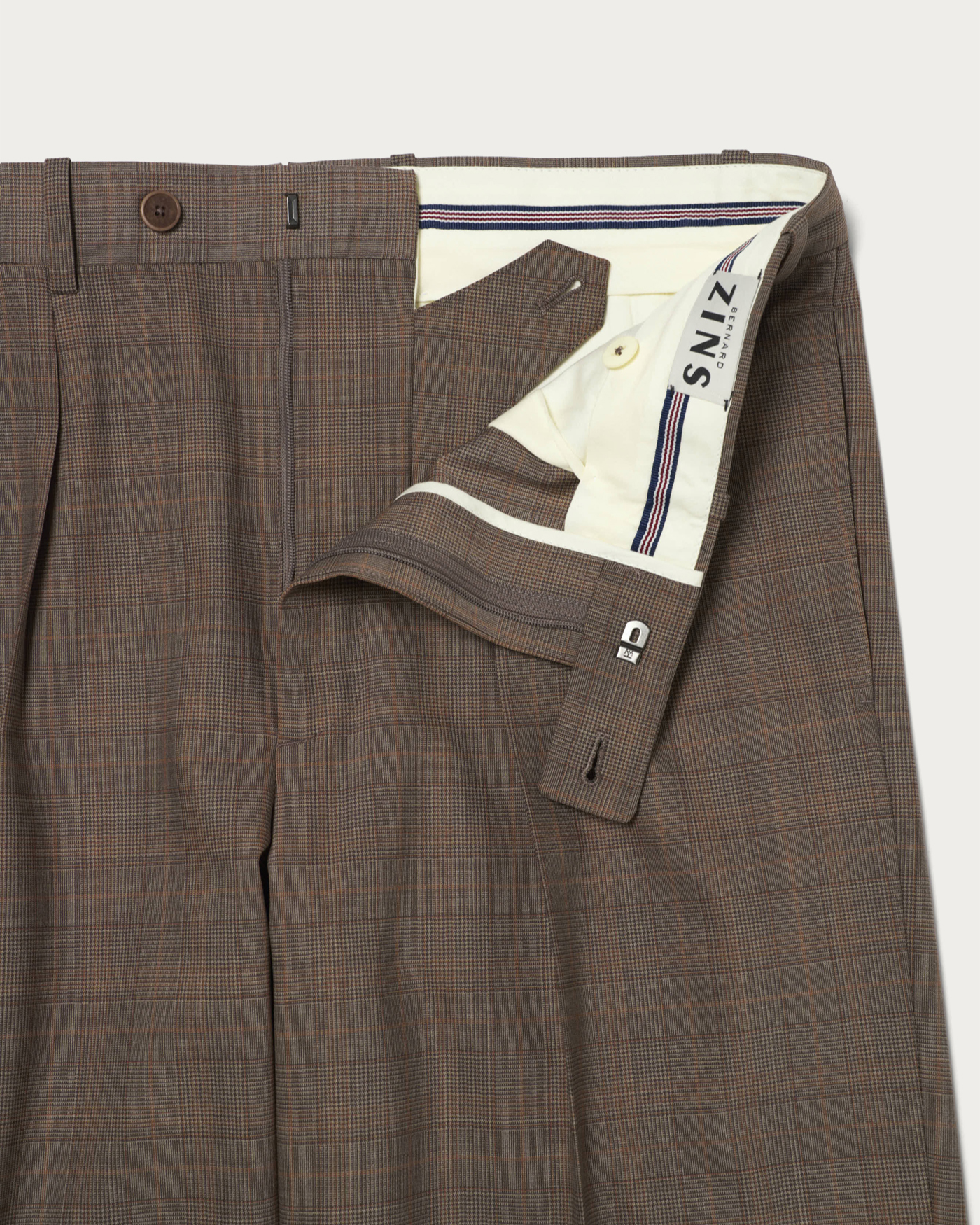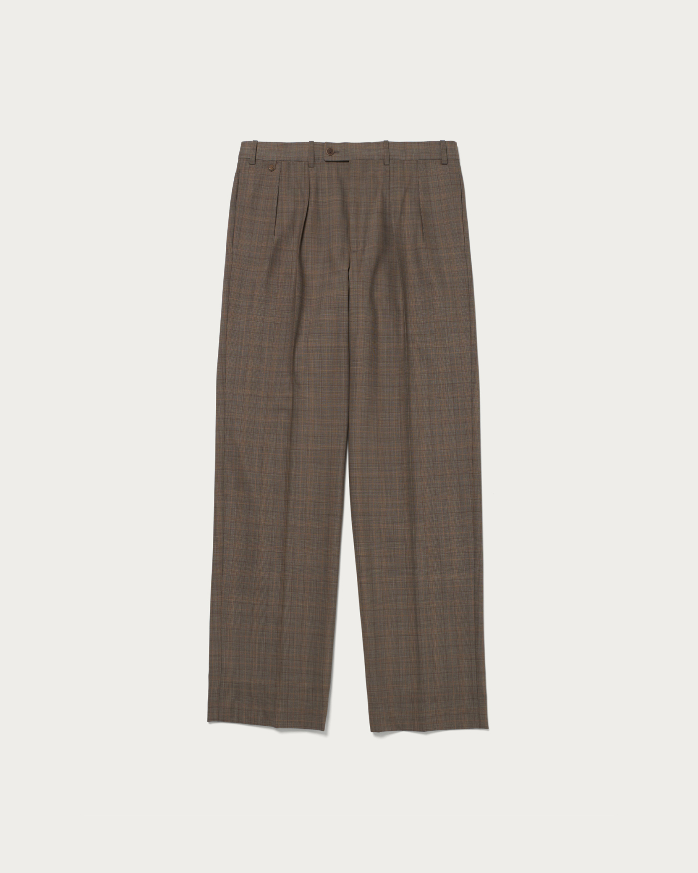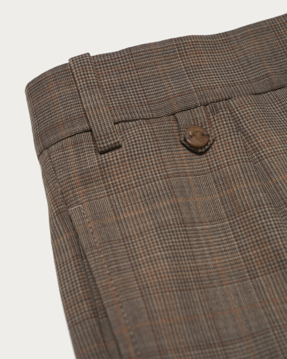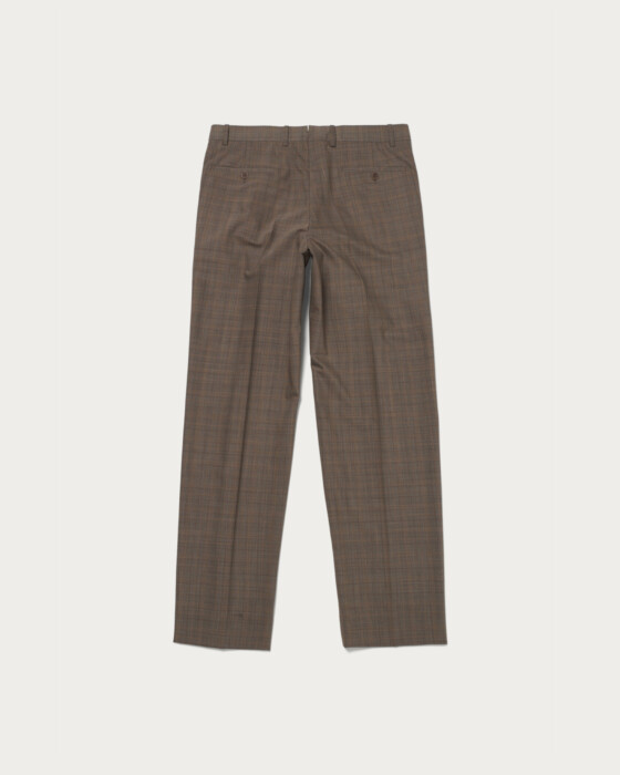オレンジのペーンがアクセントとなるチェック柄のワイドパンツ。ツーインプリーツ仕様でしっかりとした太さを持たせつつ、裾に向かって緩やかにテーパードを効かせたシルエットが特徴です。