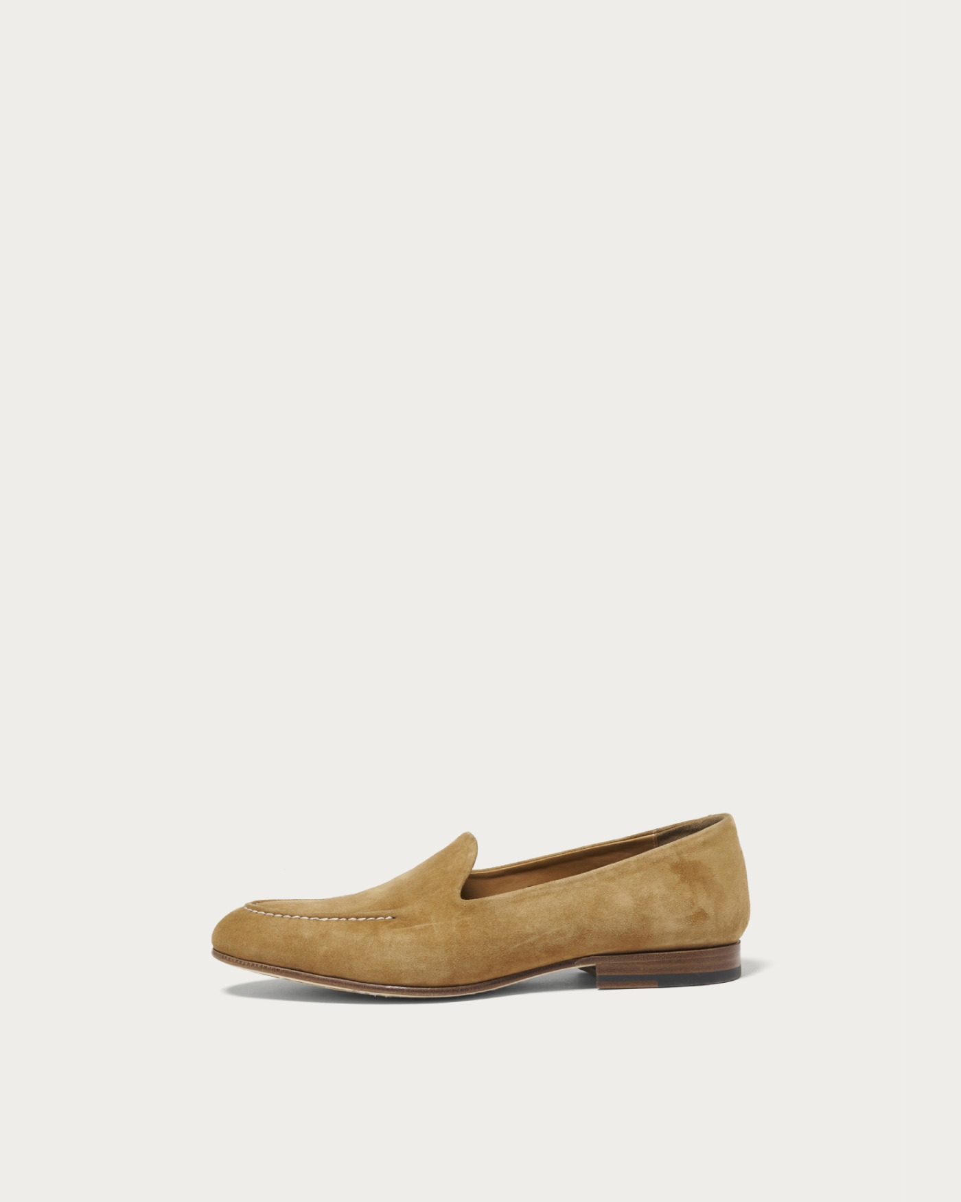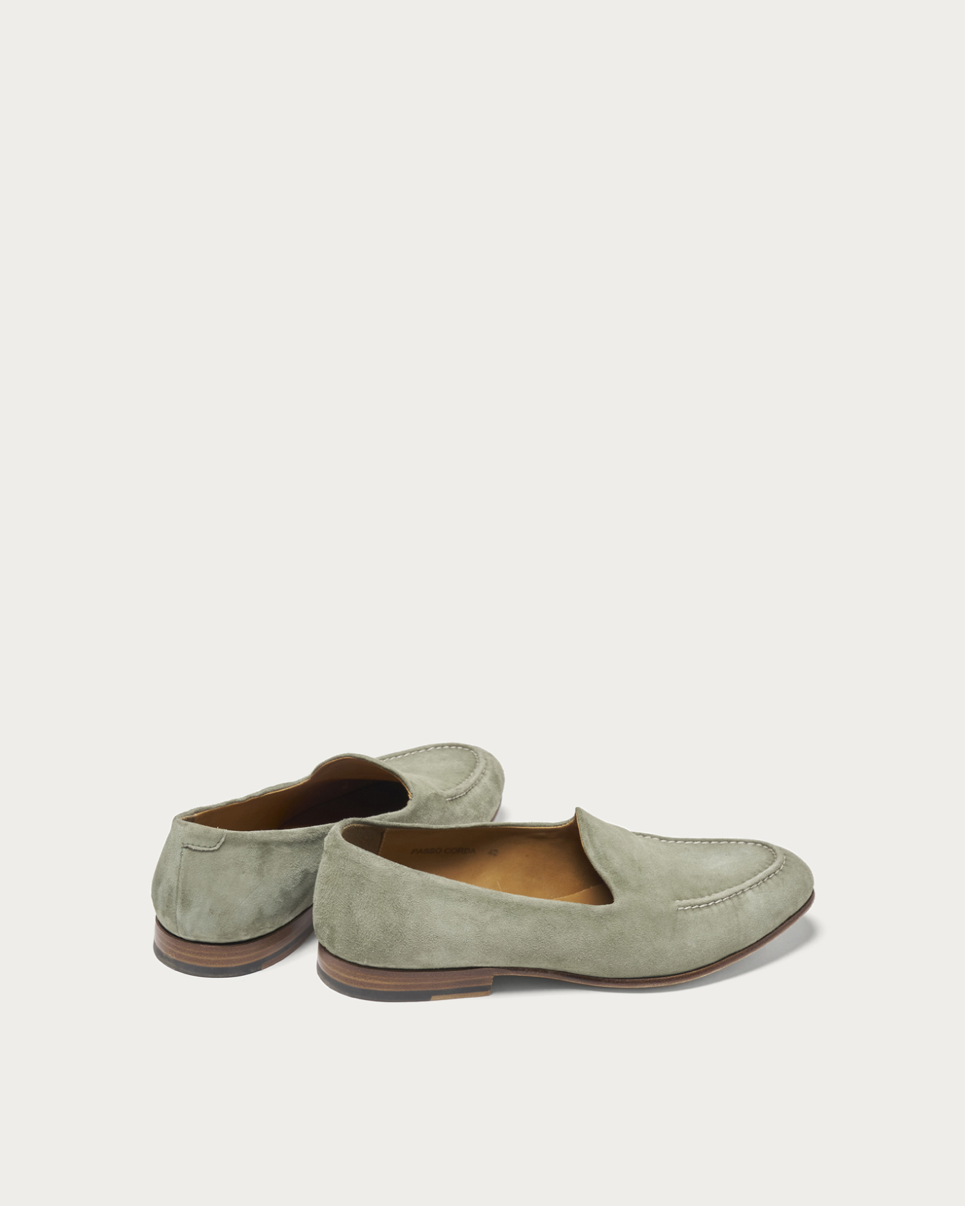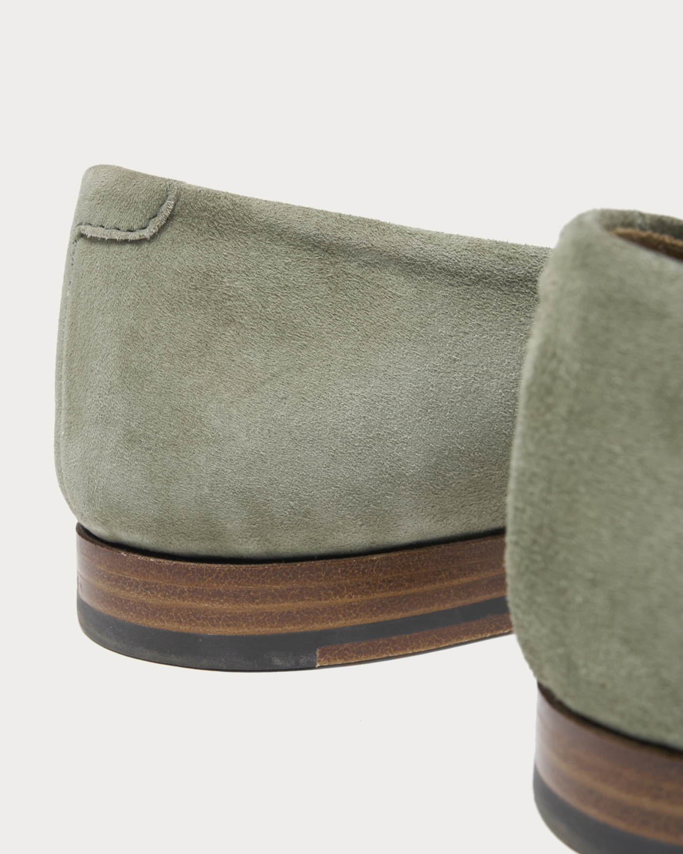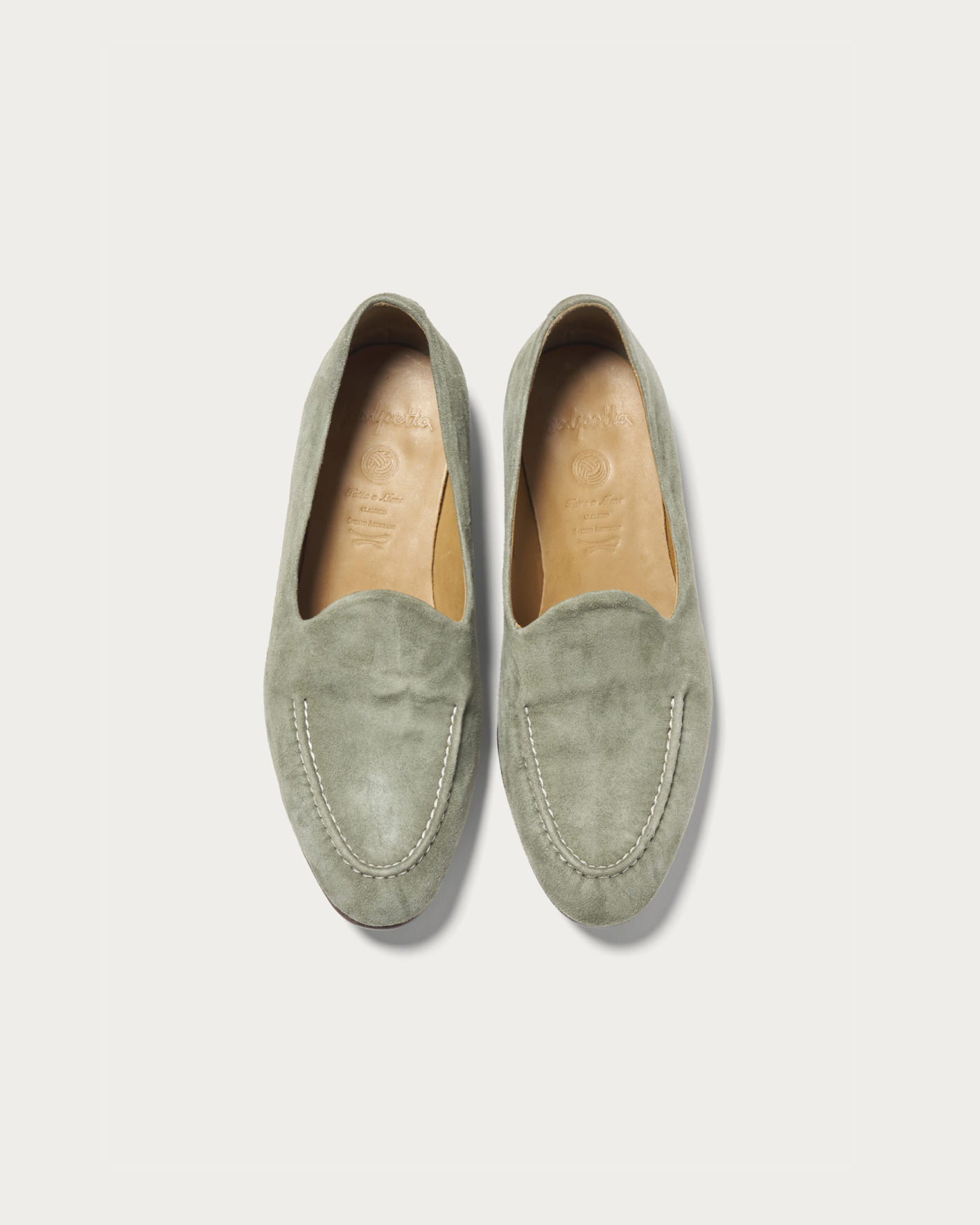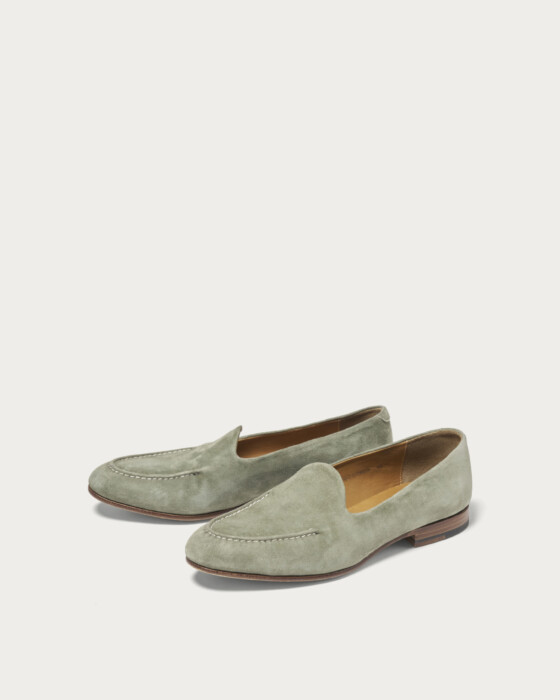 〈POLPETTA〉を代表する木型「PASSO」を用いた別注ローファー。ゴートスウェード特有のしなやかなレザーを使用し、手縫いによるモカステッチがさりげないアクセントとなっています。シンプルなデザインながら、素材とディテールによって豊かな表情を醸し出す一足です。履き口まわりはあえてステッチを省くことで、モダンで軽快な印象に仕上げています。