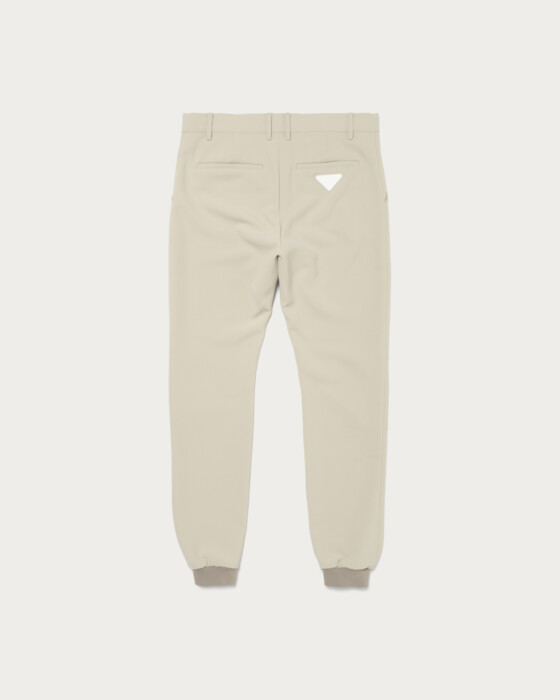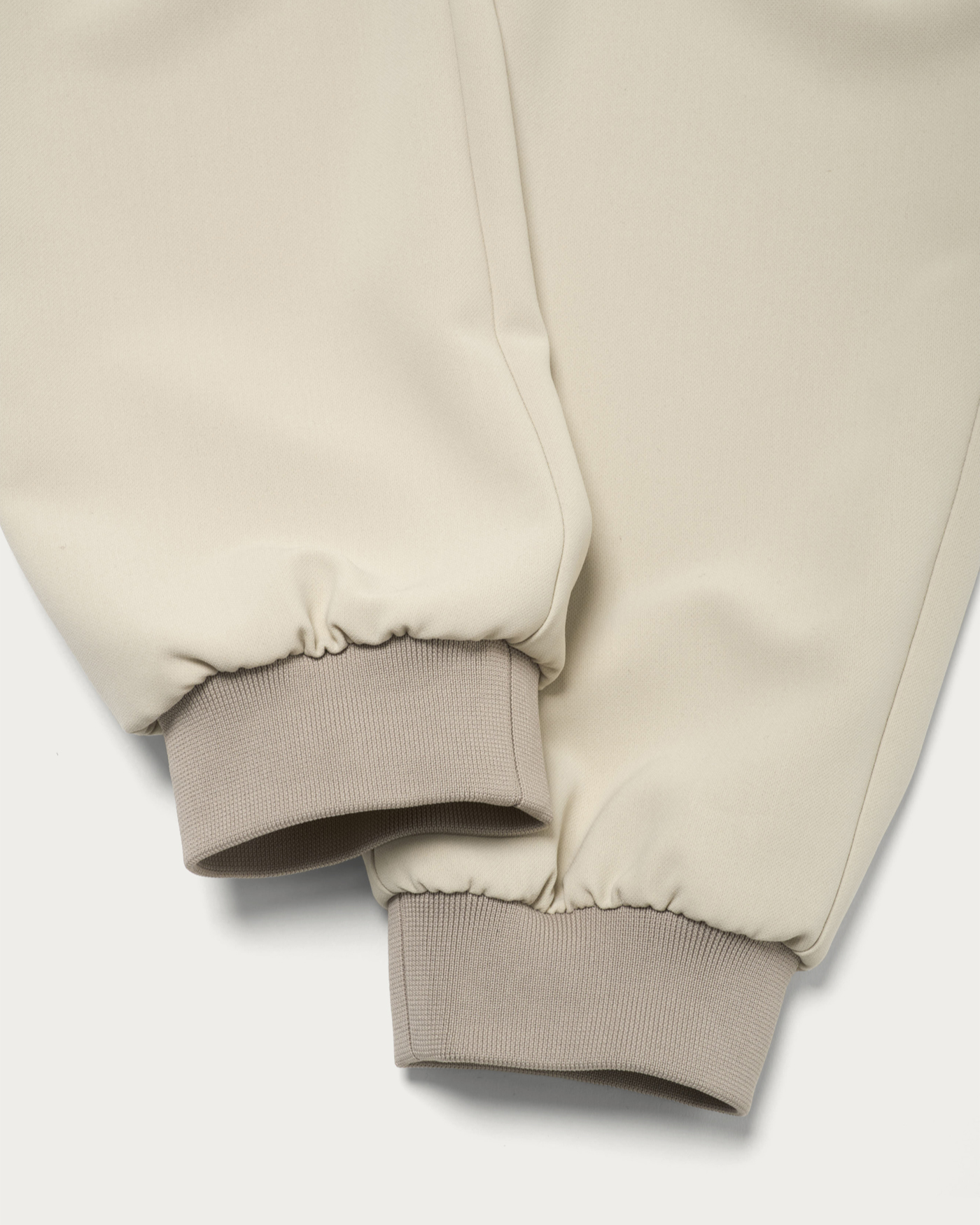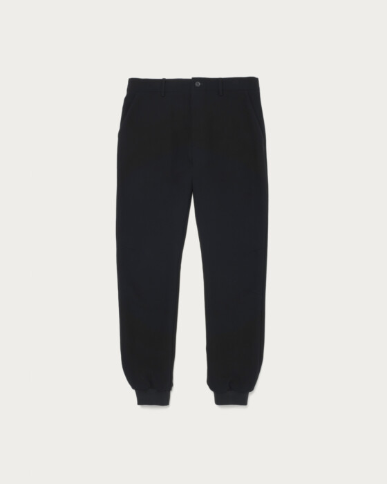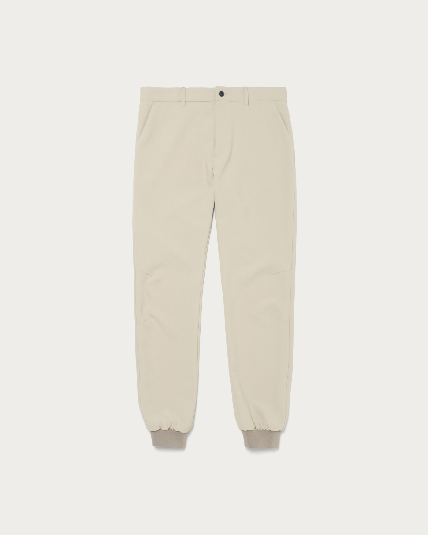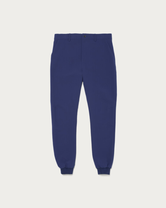 なめらかなタッチに、強撚糸ならではのシャリ感がプラスされた素材を使用したジョガーパンツ。スポーティなジョガータイプを採用し、膝のダーツによる立体パターンでスムーズな足運びを実現しました。ウエストには程よい伸縮性を備えたジャガードゴムを採用しブランドロゴを上品に表現。滑り止め効果のあるプリントで、シャツのずり上がりを防ぎます。
