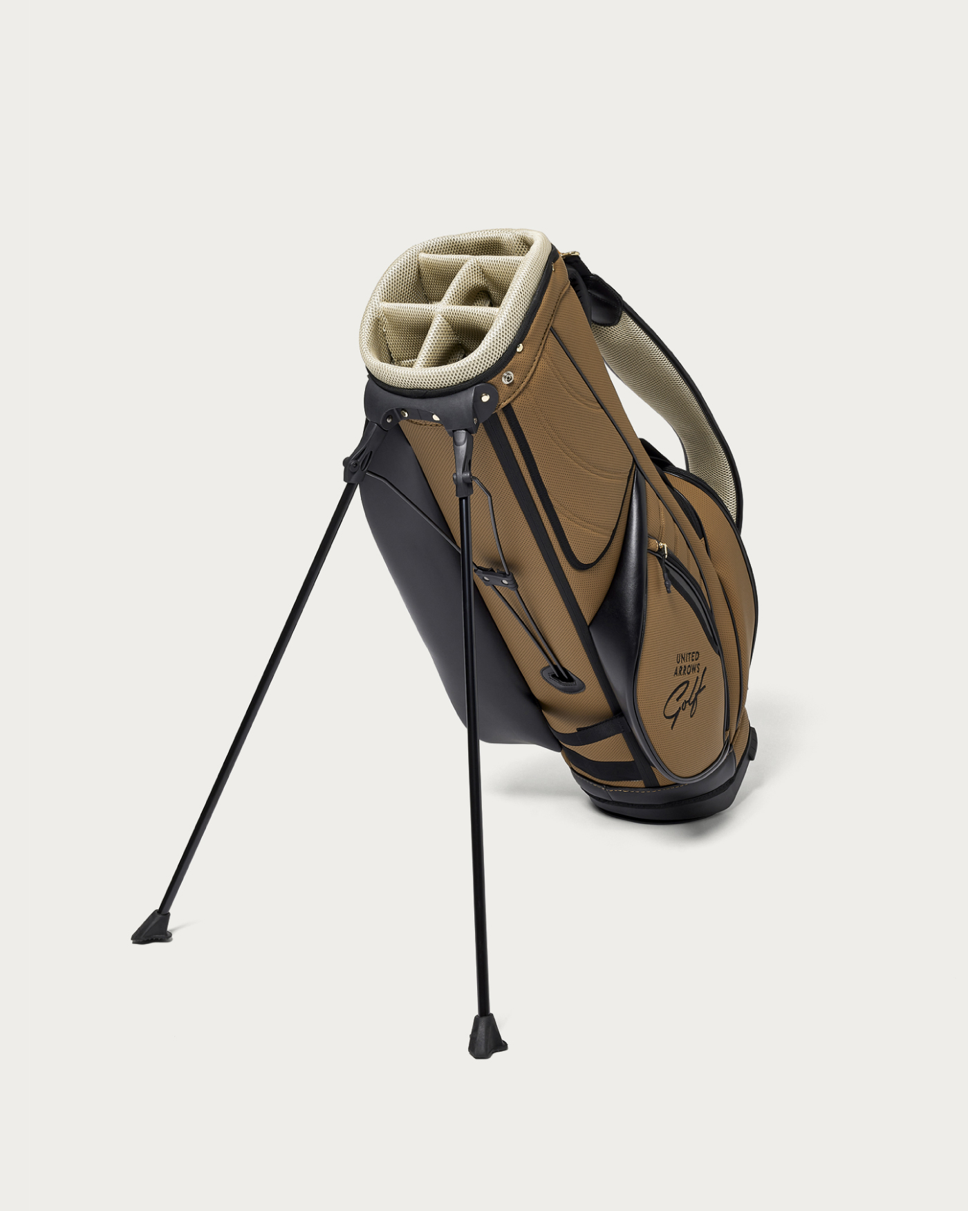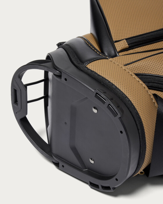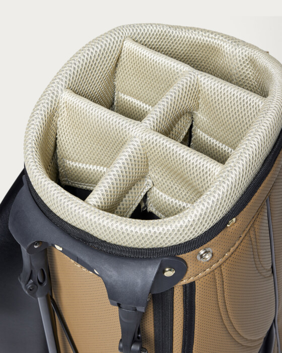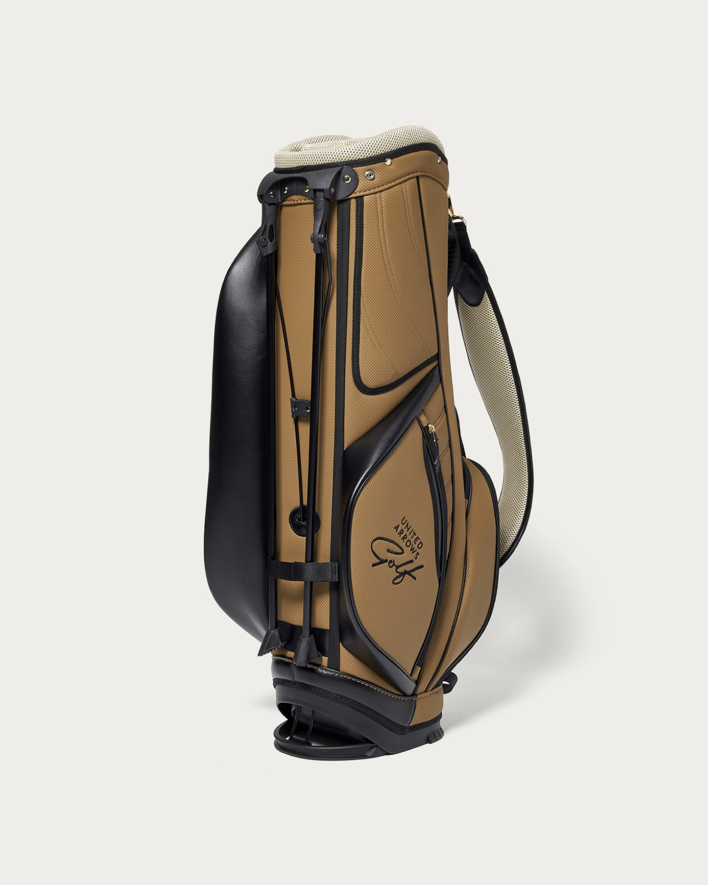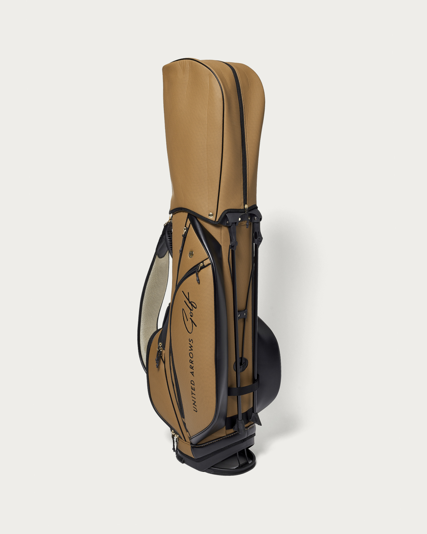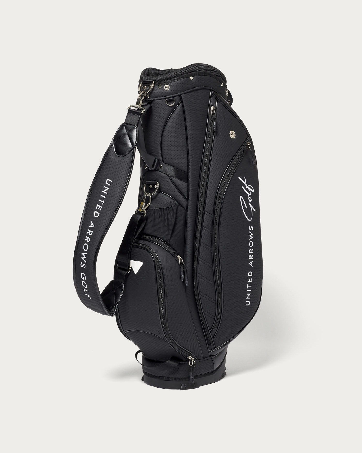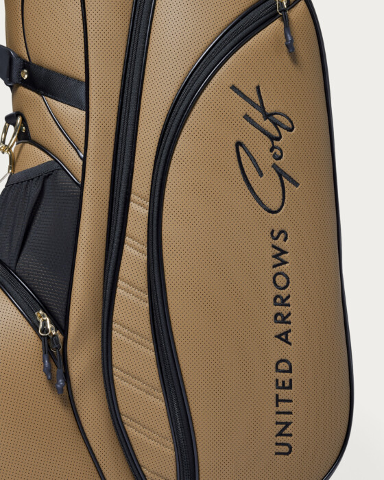 細かいパンチングを施した合成皮革素材を使用し両サイドに大きくブランドロゴを配したスタンド型のキャディバッグ。ブラックにはシルバーのパーツ、ブラウンにはゴールドのパーツを使用した上品で洗練されたデザインが特徴です。