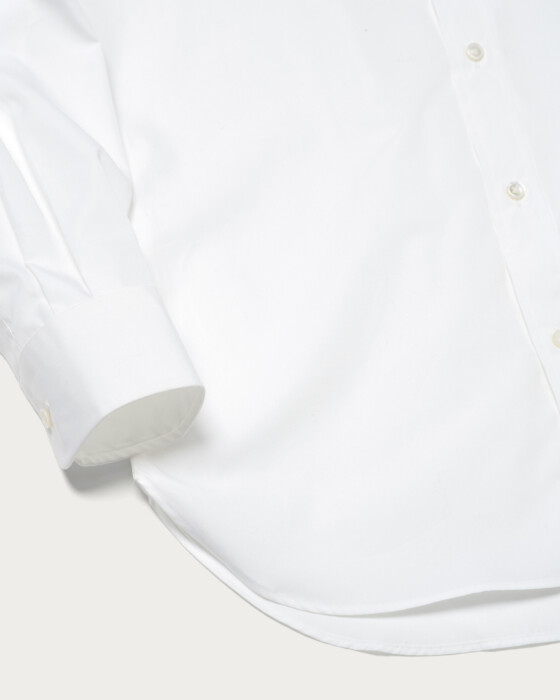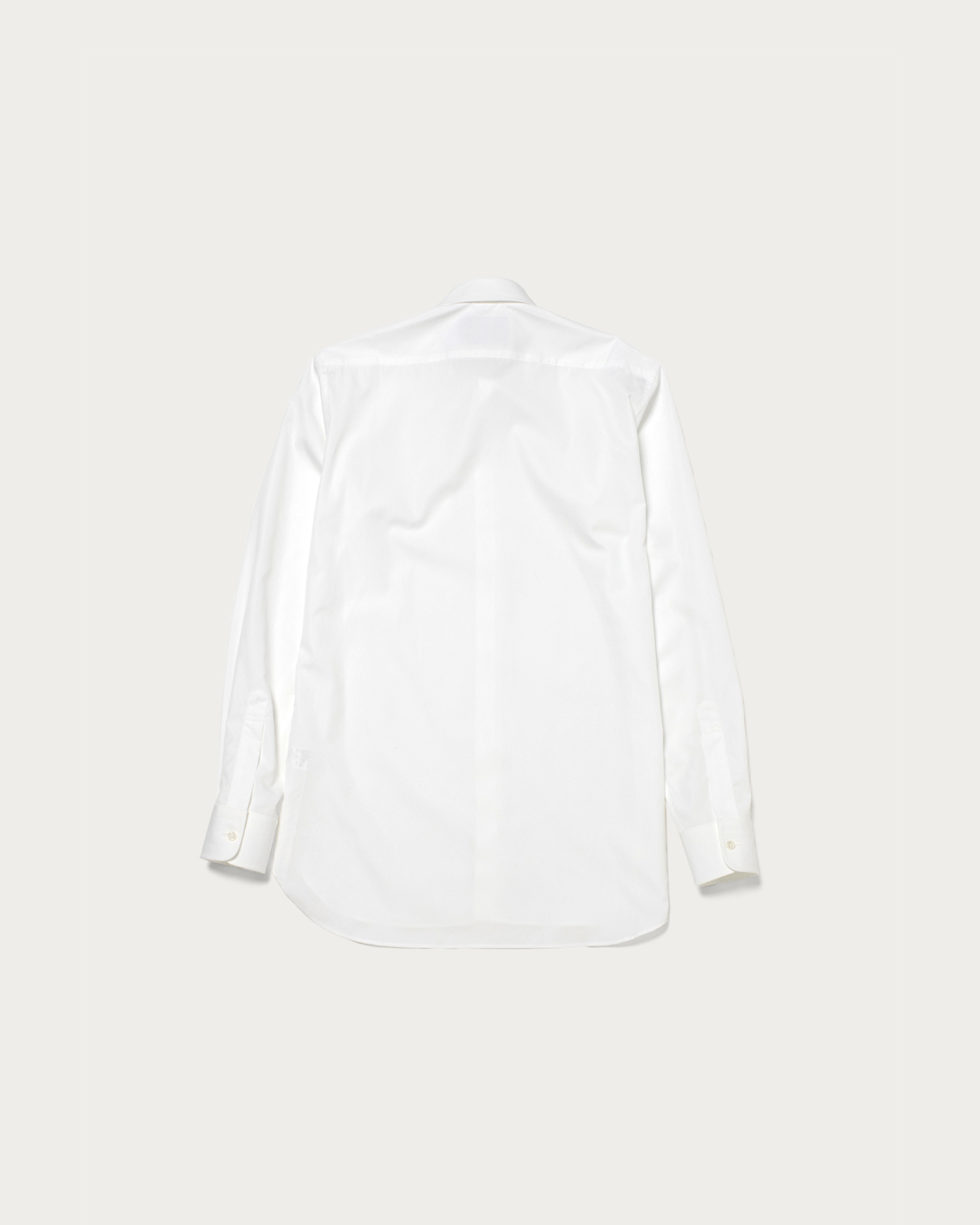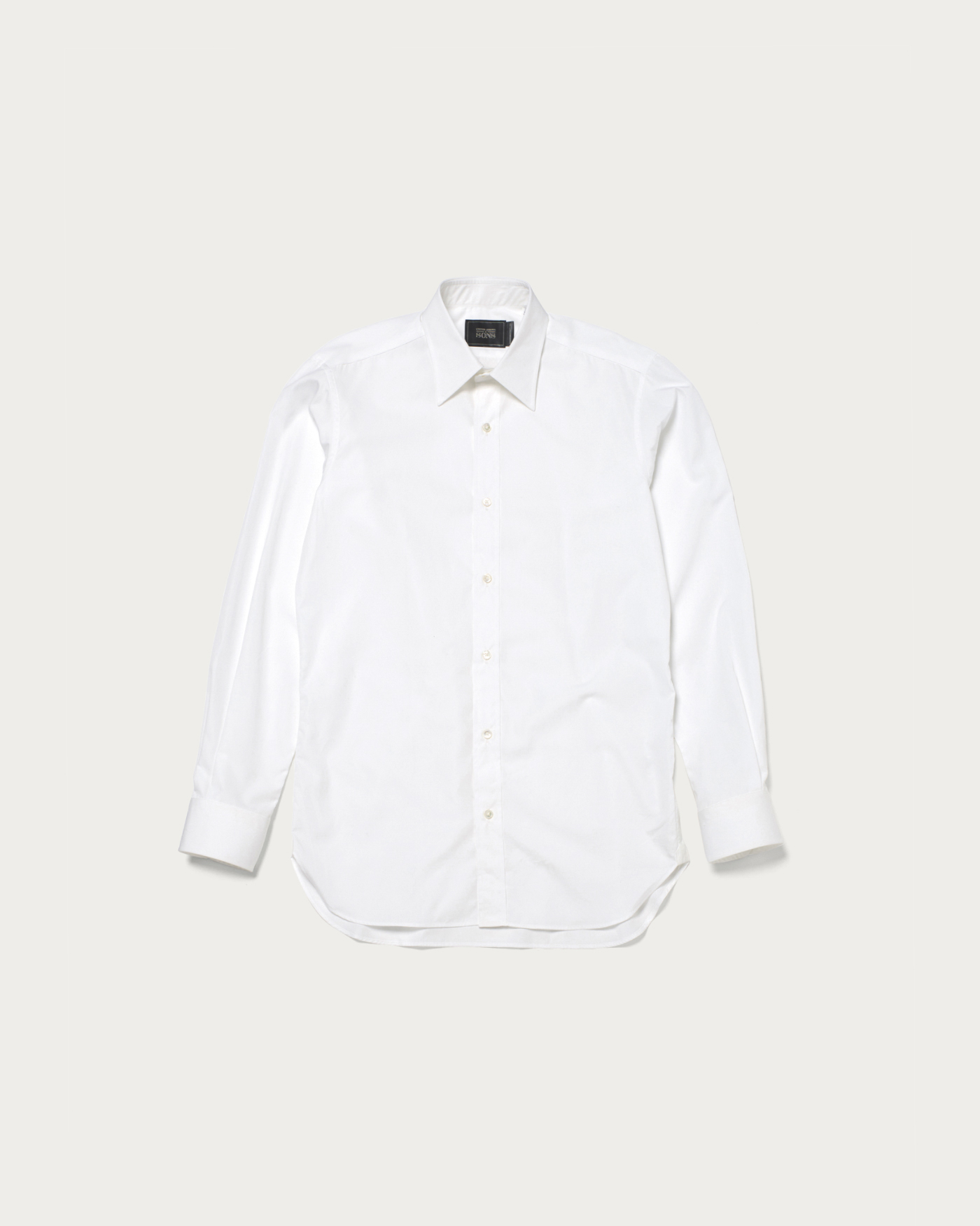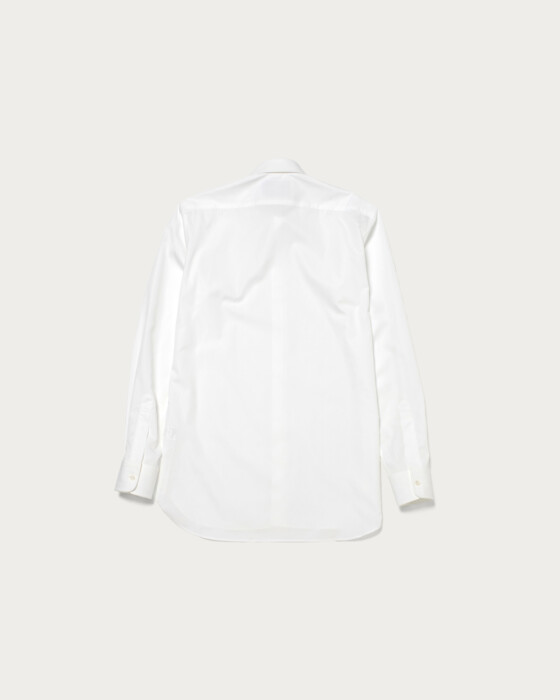 スタイリスト・服部昌孝氏監修のコレクション。レギュラーカラーを採用したドレスシャツ。ロングポイントで衿の開きが少なく、カラーバーを使用することで首元を立体的に引き締め、優雅な着こなしを楽しめます。程よくゆとりを持たせたベーシックなサイジングに、バックスタイルはノータック仕様。胸周りからウエストにかけて緩やかに描くラインが、端正で上品な印象を演出します。
