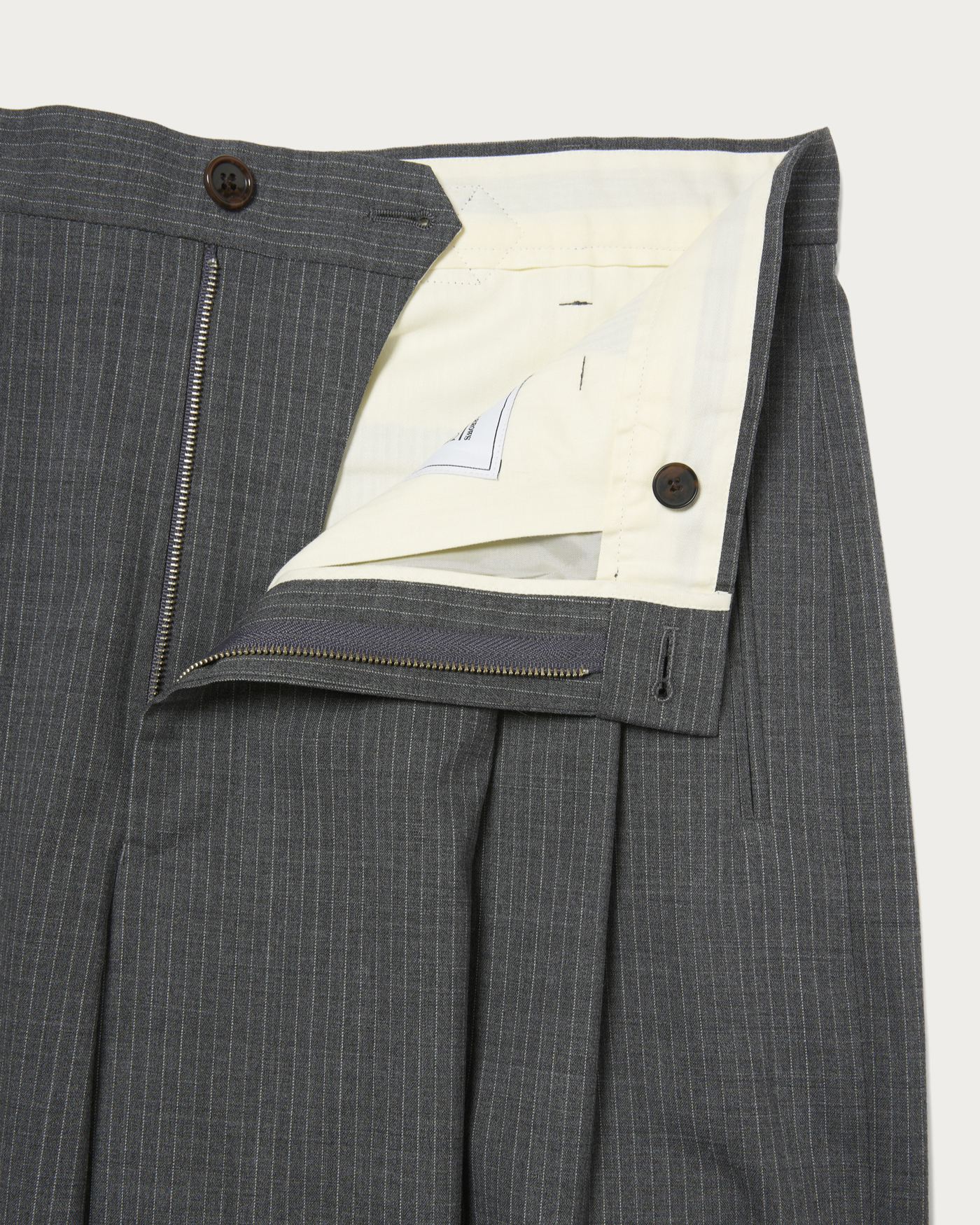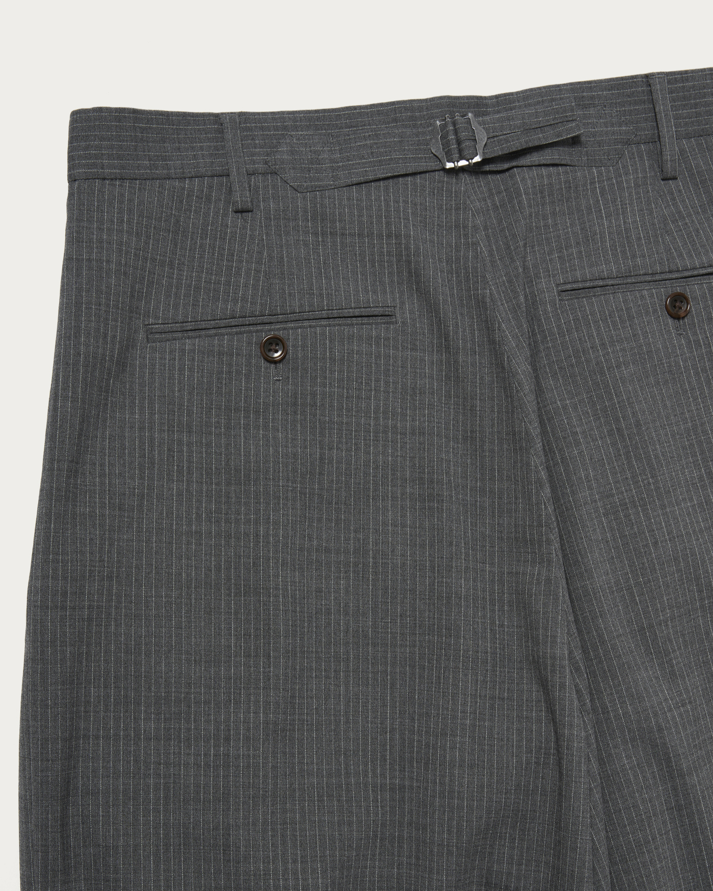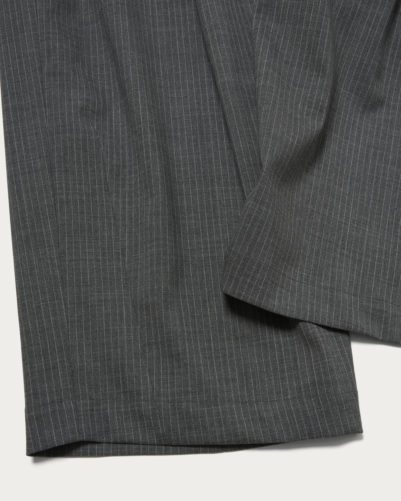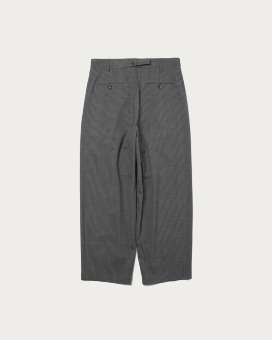 程よいボリューム感のあるシルエットが特徴の、グレーストライプの2プリーツスラックス。あえてクリースを入れない仕様とすることで、スラックスでありながらもカジュアルに着用できる一本に仕上げています。