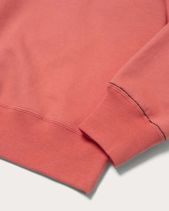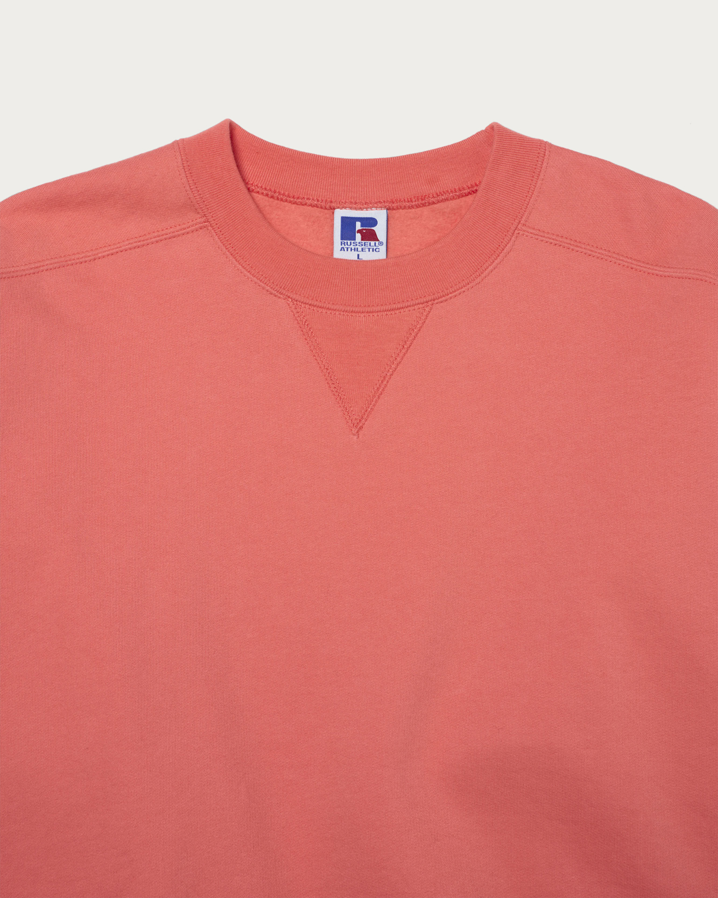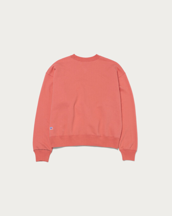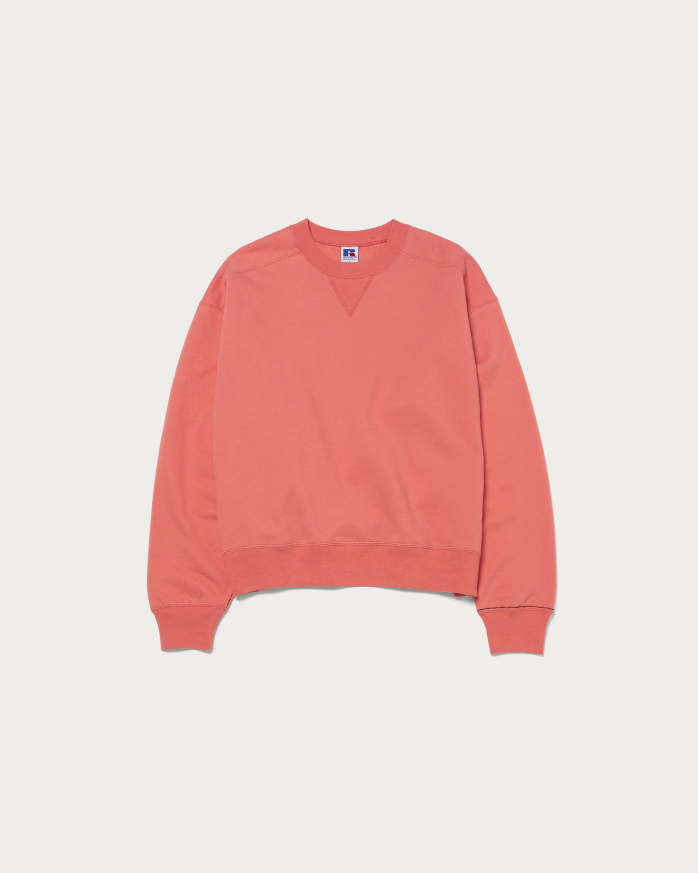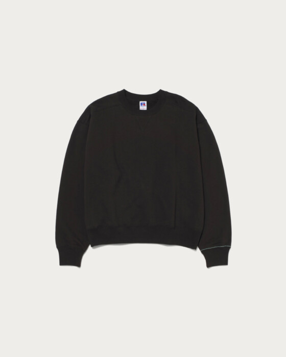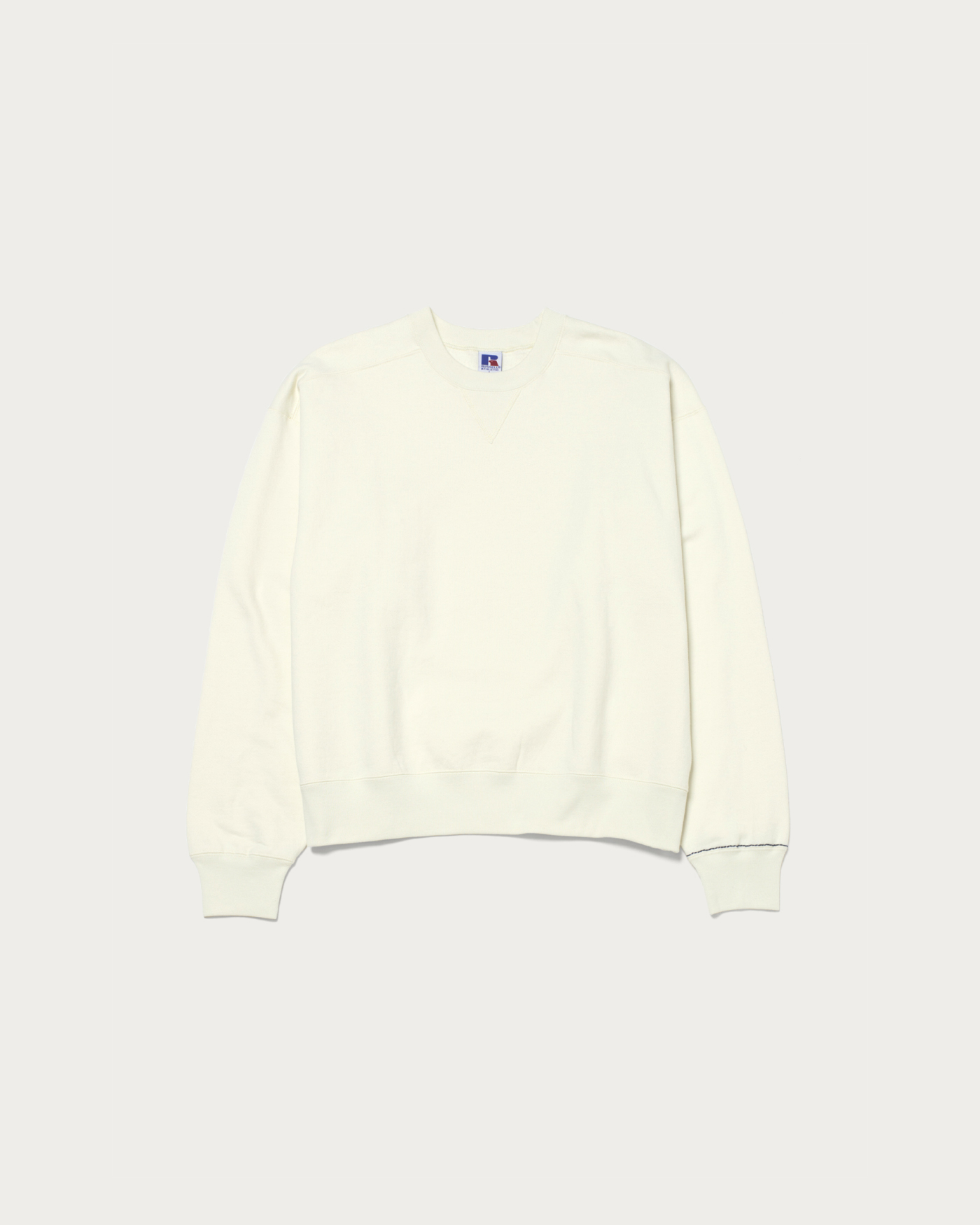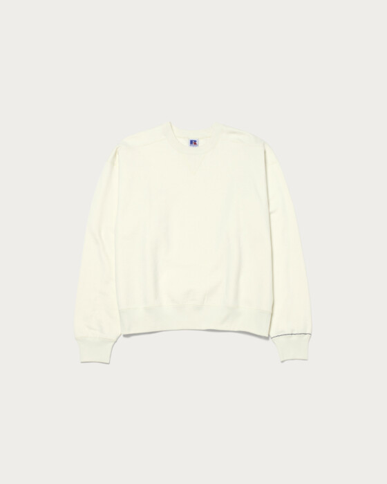 〈RUSSELL ATHLETIC〉に別注したクルーネックのスウェットシャツ。身幅にゆとりを持たせつつ、着丈はコンパクトに仕上げたボクシーフィットが特徴です。ソリッドでベーシックな佇まいをベースに、袖口や脇、袖下の一部に配色のハンドステッチを施し、さりげないクラフト感をプラス。素材にはコットン100%の裏起毛生地を使用し、着古して程よくやせたようなヴィンテージ感のある風合いを表現しています。