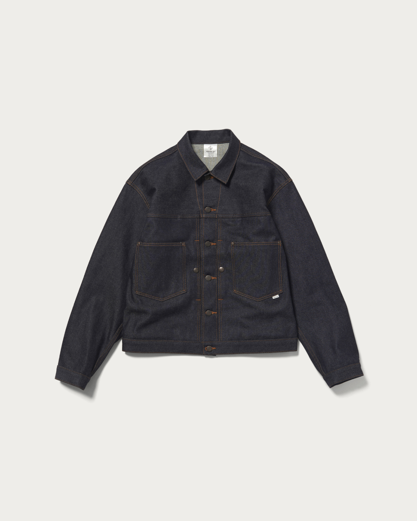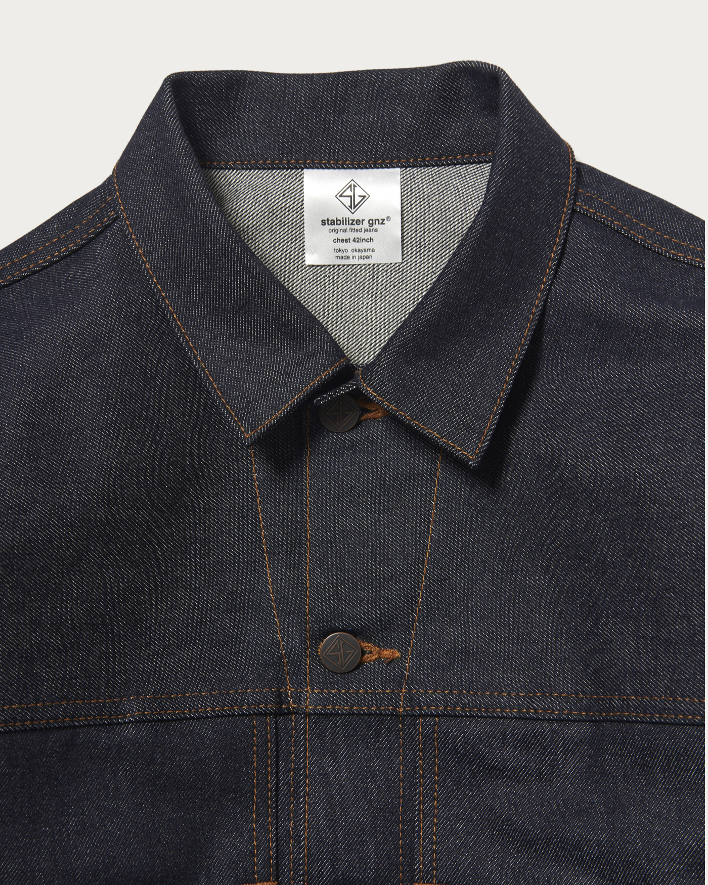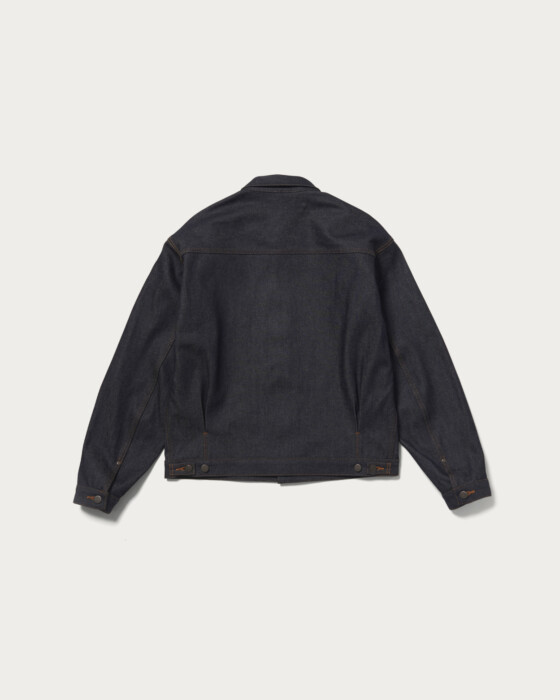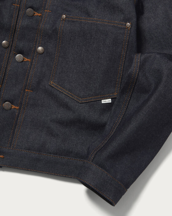 〈STABILIZER GNZ〉との別注コレクションで目指したのは、ドレスアップ感覚で着用できるデニムアイテム。たっぷりとした身幅に短めの着丈を組み合わせた、クラシカルなボックスシルエットのレギュラーカラーデニムジャケットです。胸元にはシンプルなパッチポケットに加え、これまで〈STABILIZER GNZ〉のトップスにも採用されてきた、ミルスペックアイテムを思わせるシームポケットを配置。素材には、リジッドの風合いを長く保てるよう縦落ちしにくい特別なデニム生地を採用しました