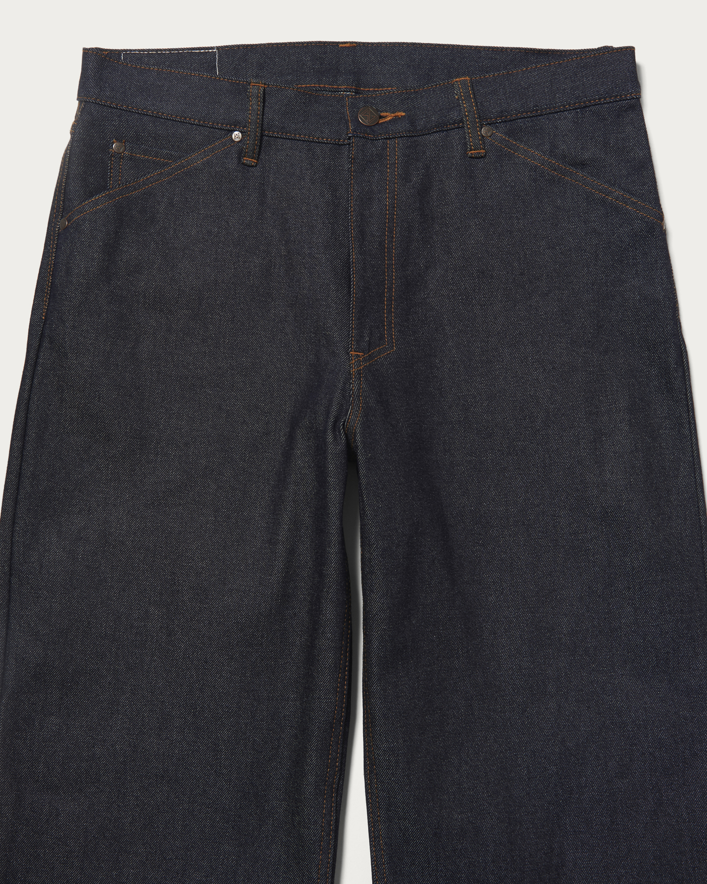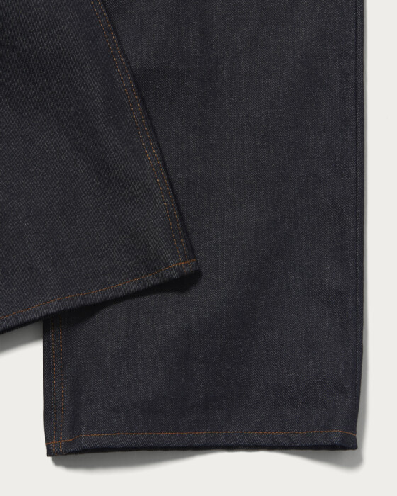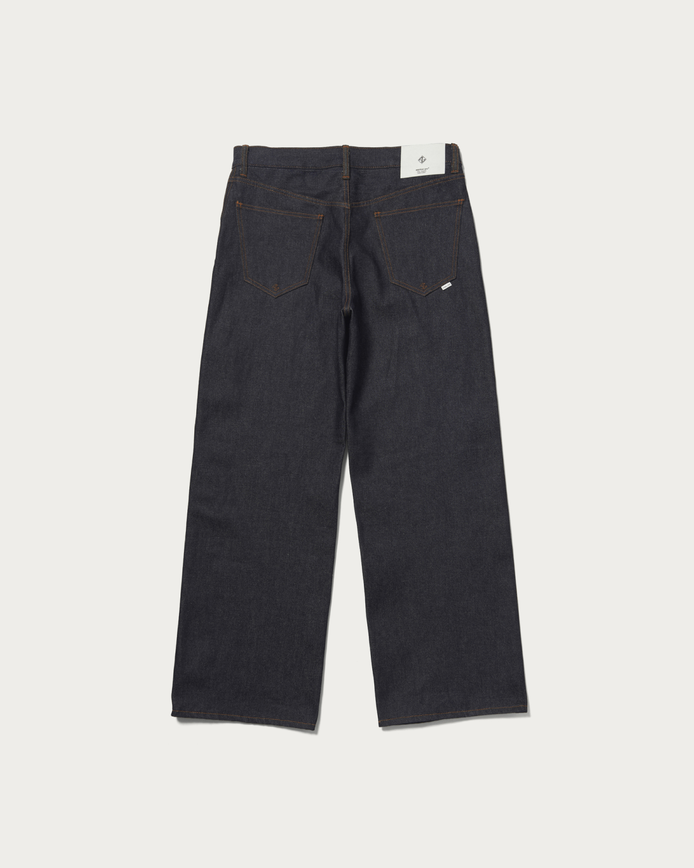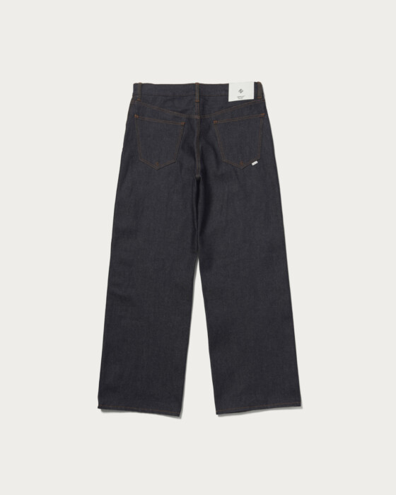 〈STABILIZER GNZ〉の別注コレクションで目指したのは、ドレスアップ感覚で着用できるデニムアイテム。マリンパンツを彷彿とさせる、脇をセルヴィッチ仕様としたバギーシルエットが特徴です。程よい深さの股上に、すっきりとした腰周りから膝、裾にかけて大胆に広がる極太のストレートラインが、力強くも洗練された存在感を演出します。