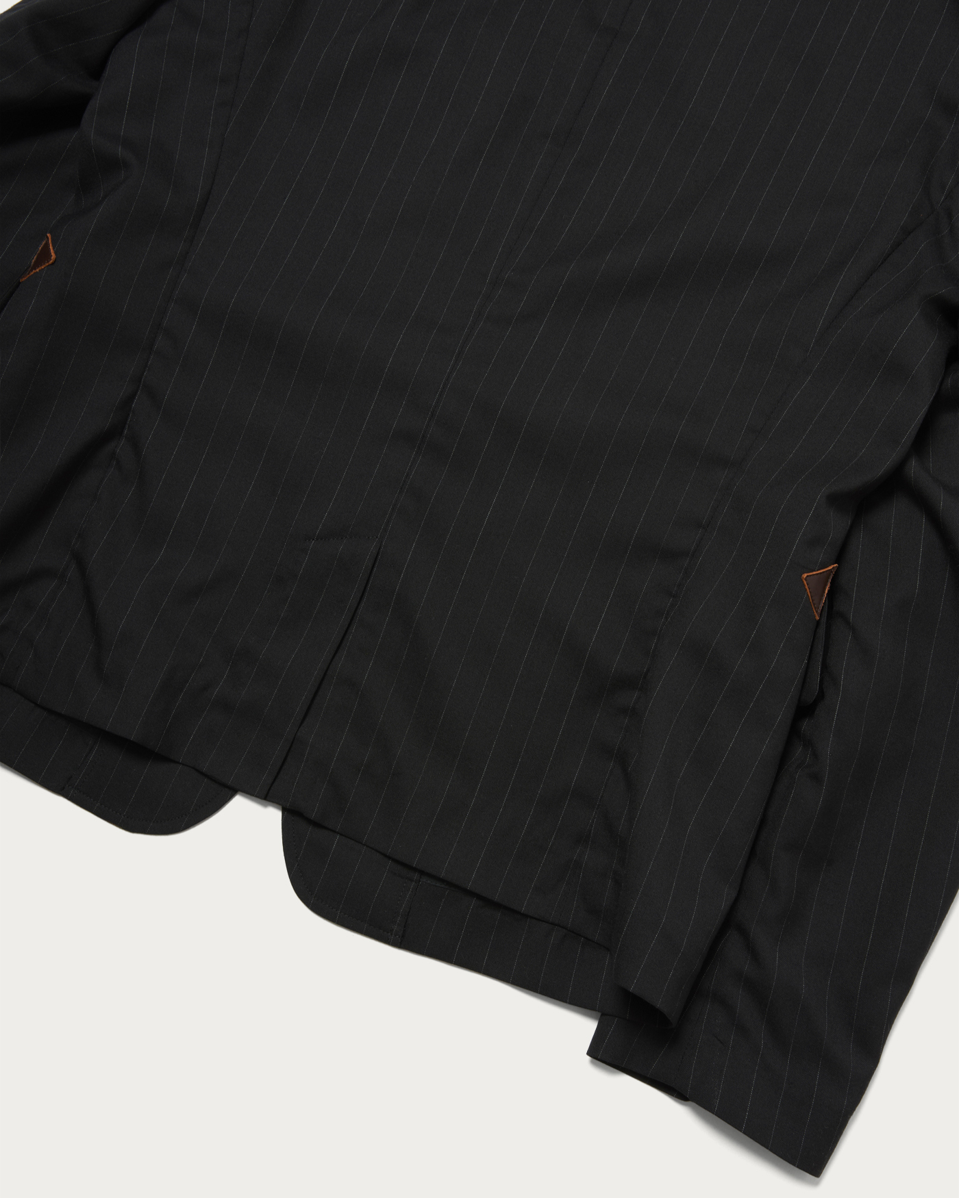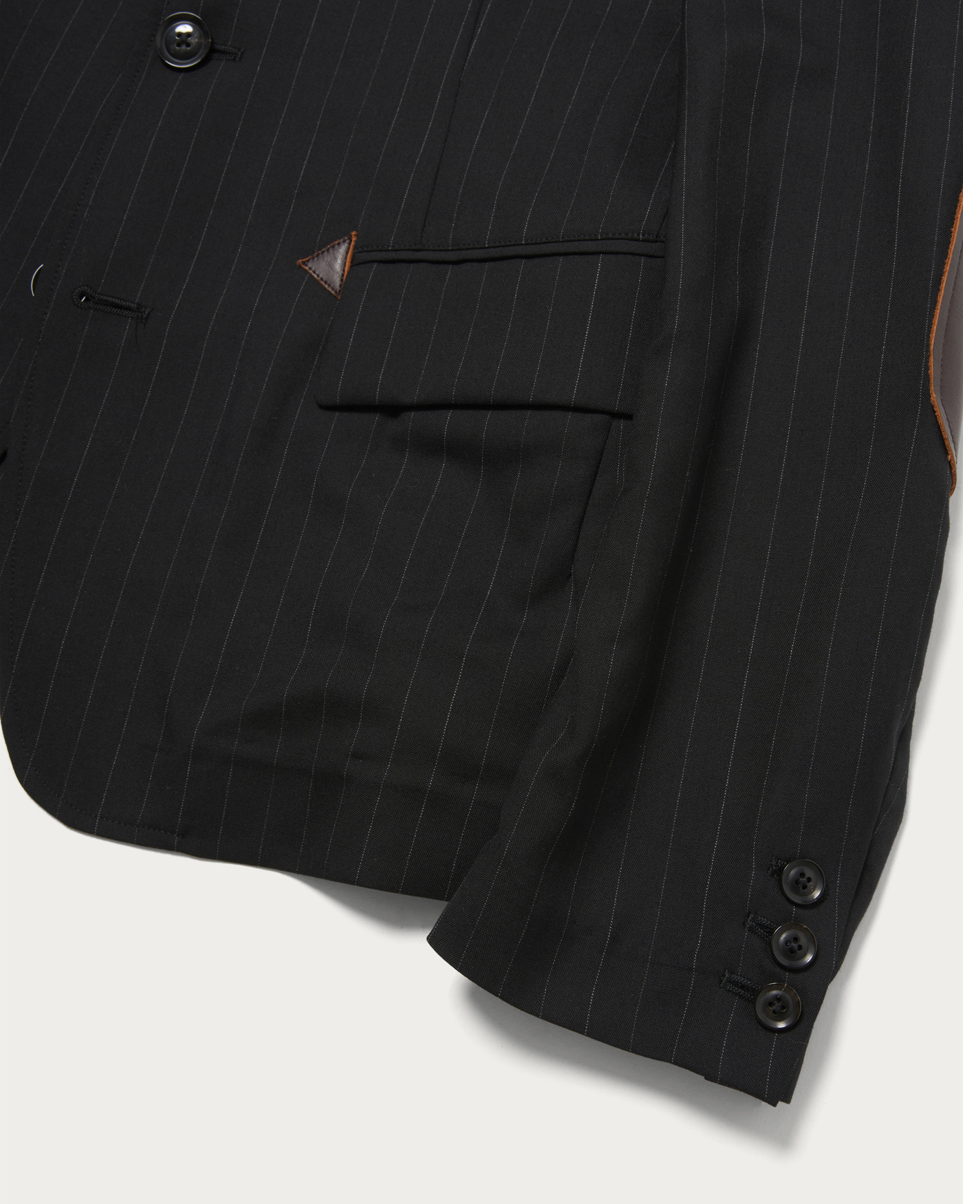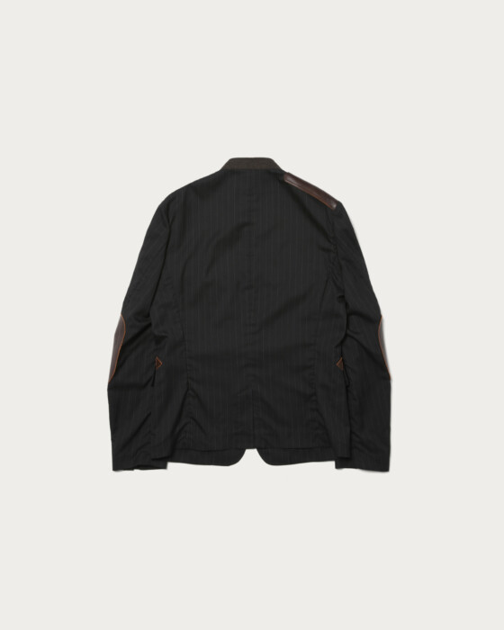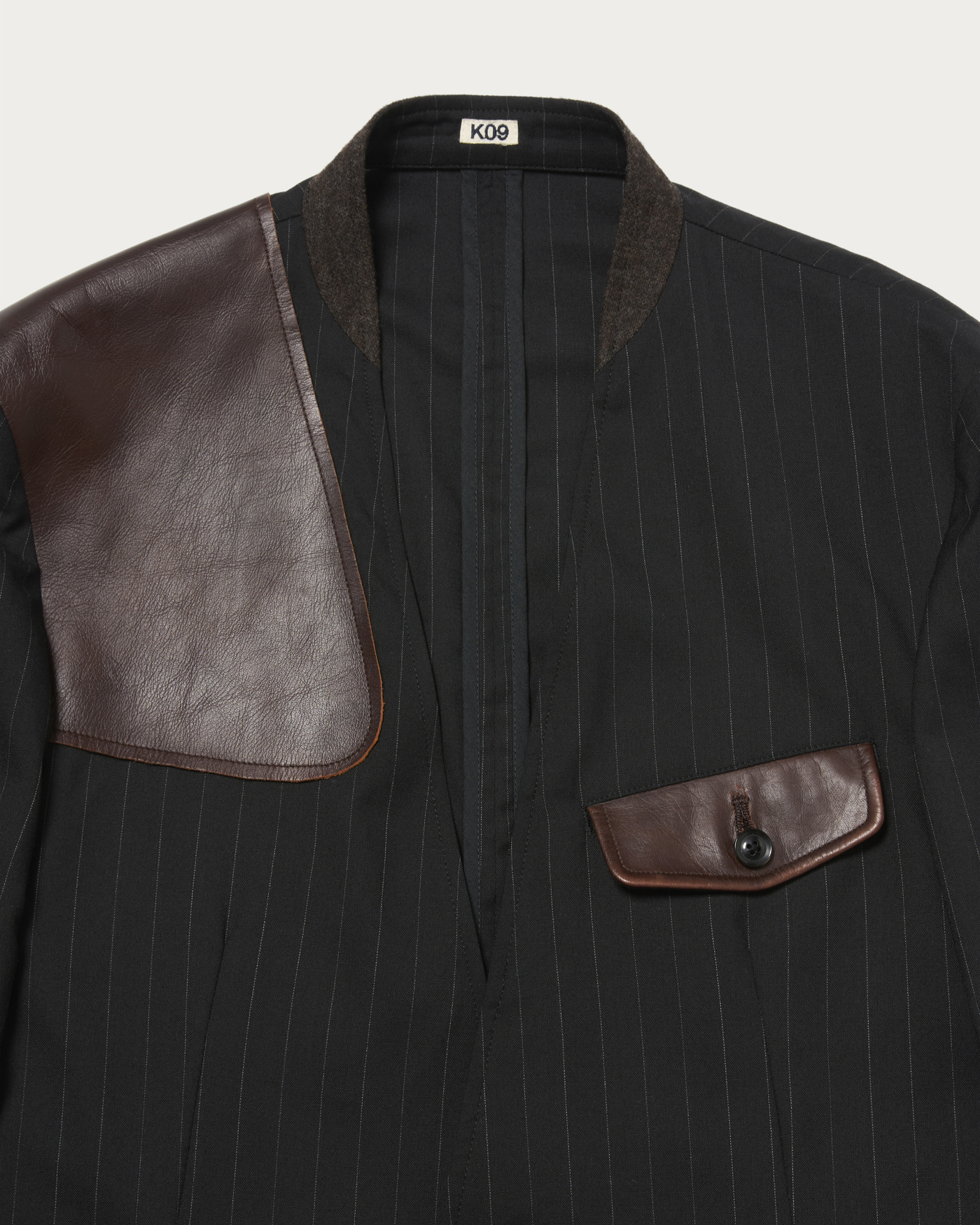 ストライプ柄にレザーパッチを施したノーカラージャケット。ドレッシーなアイテムを、〈KHOKI〉らしい視点で再解釈した一着です。端正な佇まいの中に素材使いでアクセントを効かせ、クラシックとモダンが共存する表情に仕上っています。