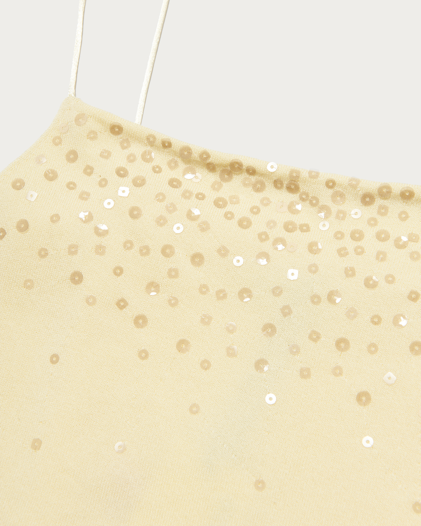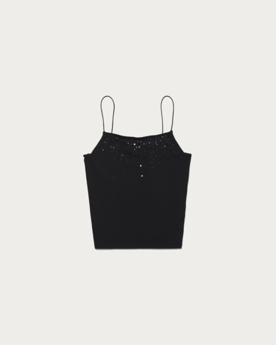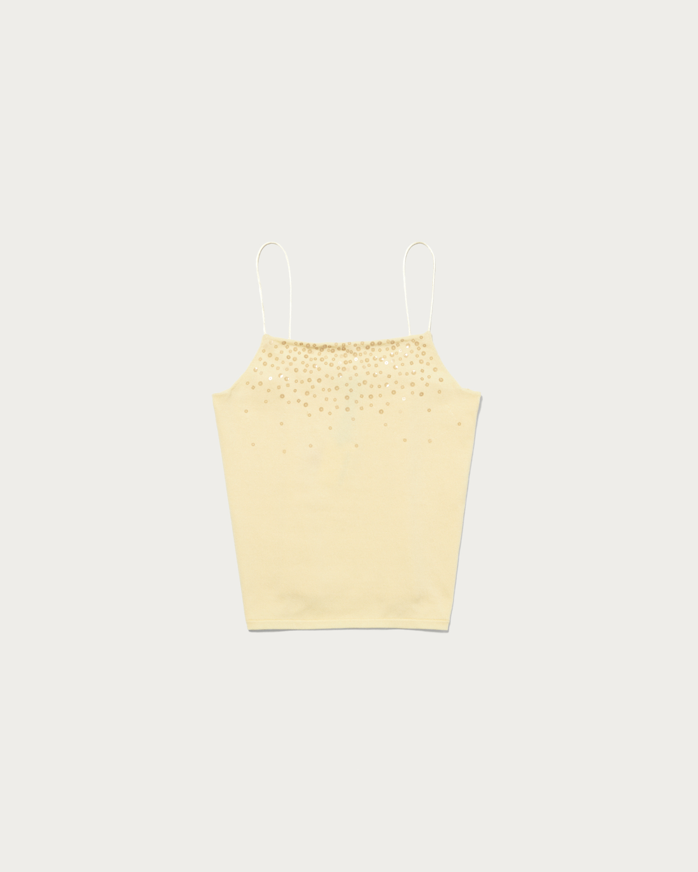 胸元にスパンコールをあしらったニットキャミソール。華奢なサテン調ストラップが上品なポイントです。さらりとしたコットンポリエステル素材で快適な着心地。インナーとしてはもちろん、レイヤードやジャケットの中にも映える万能アイテムです。
