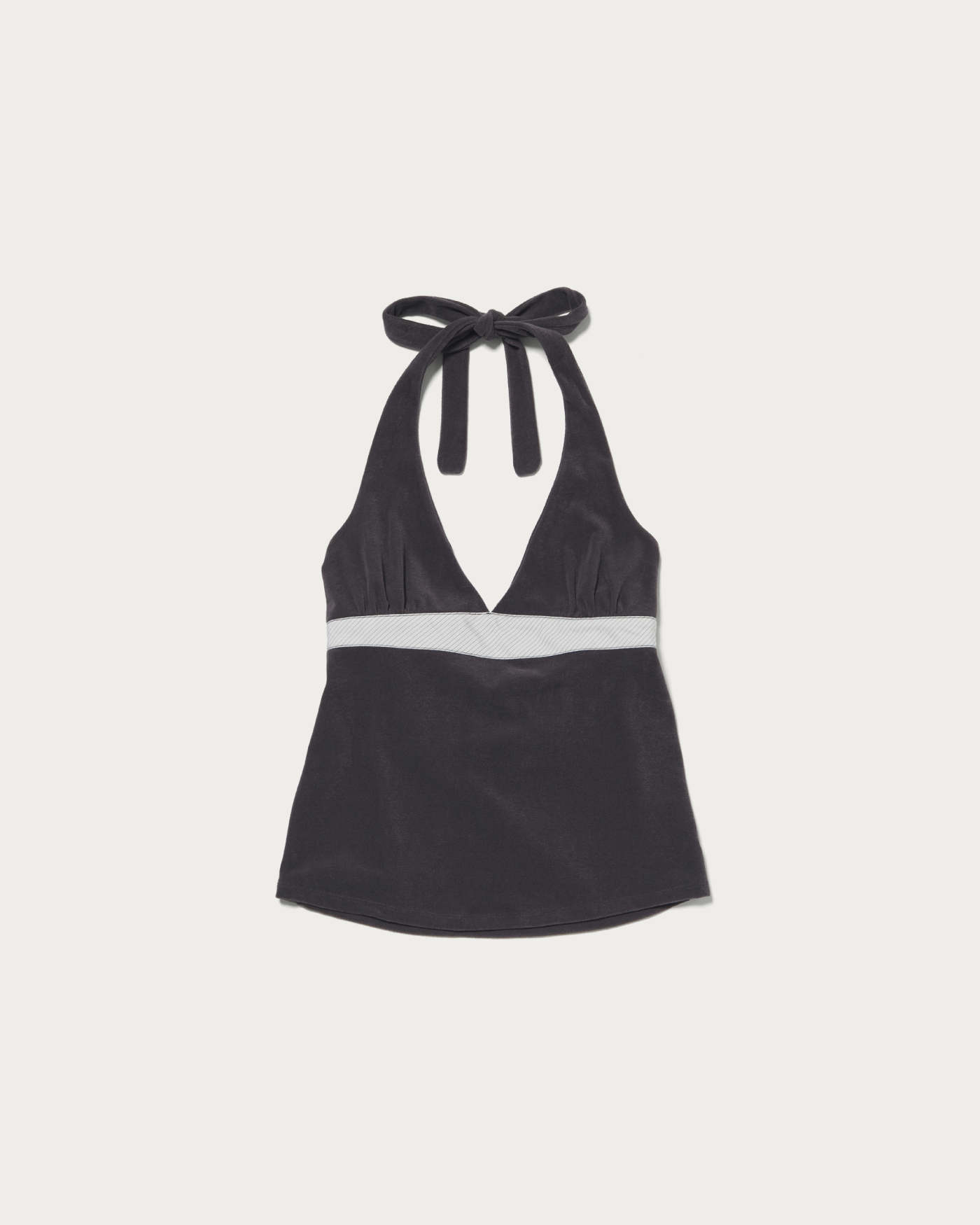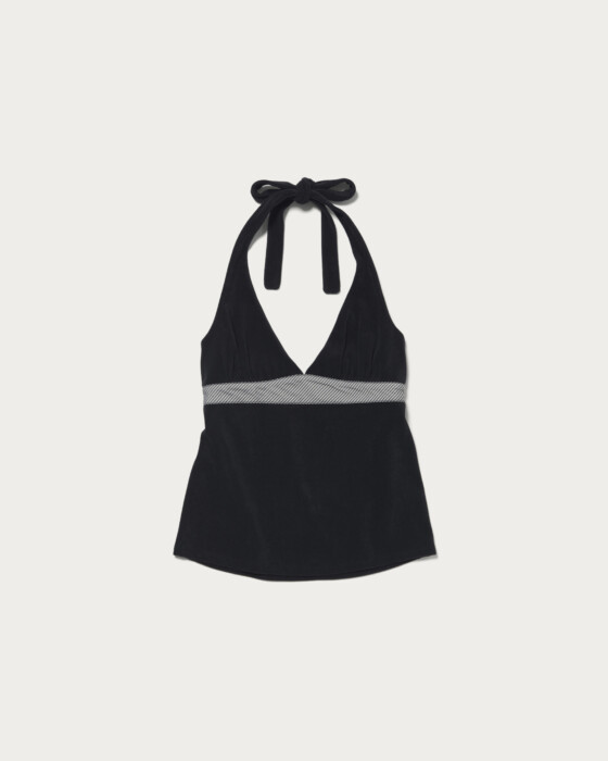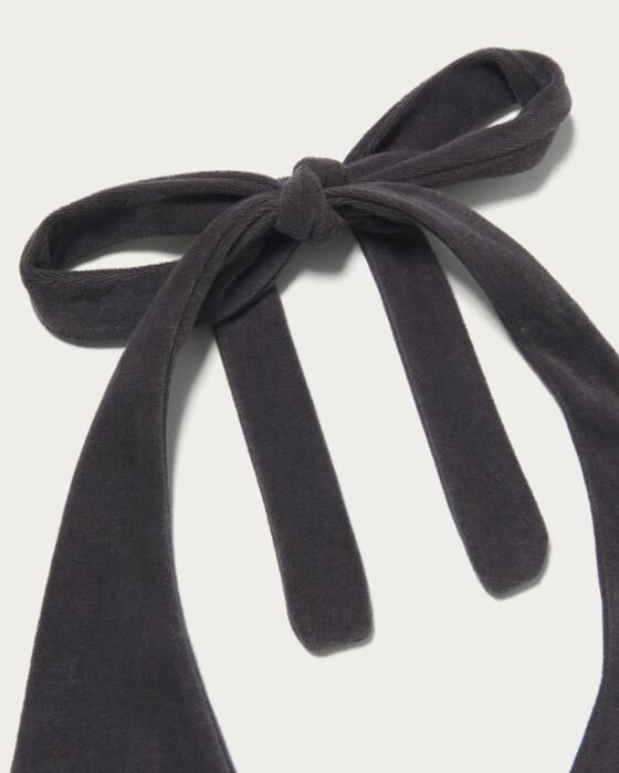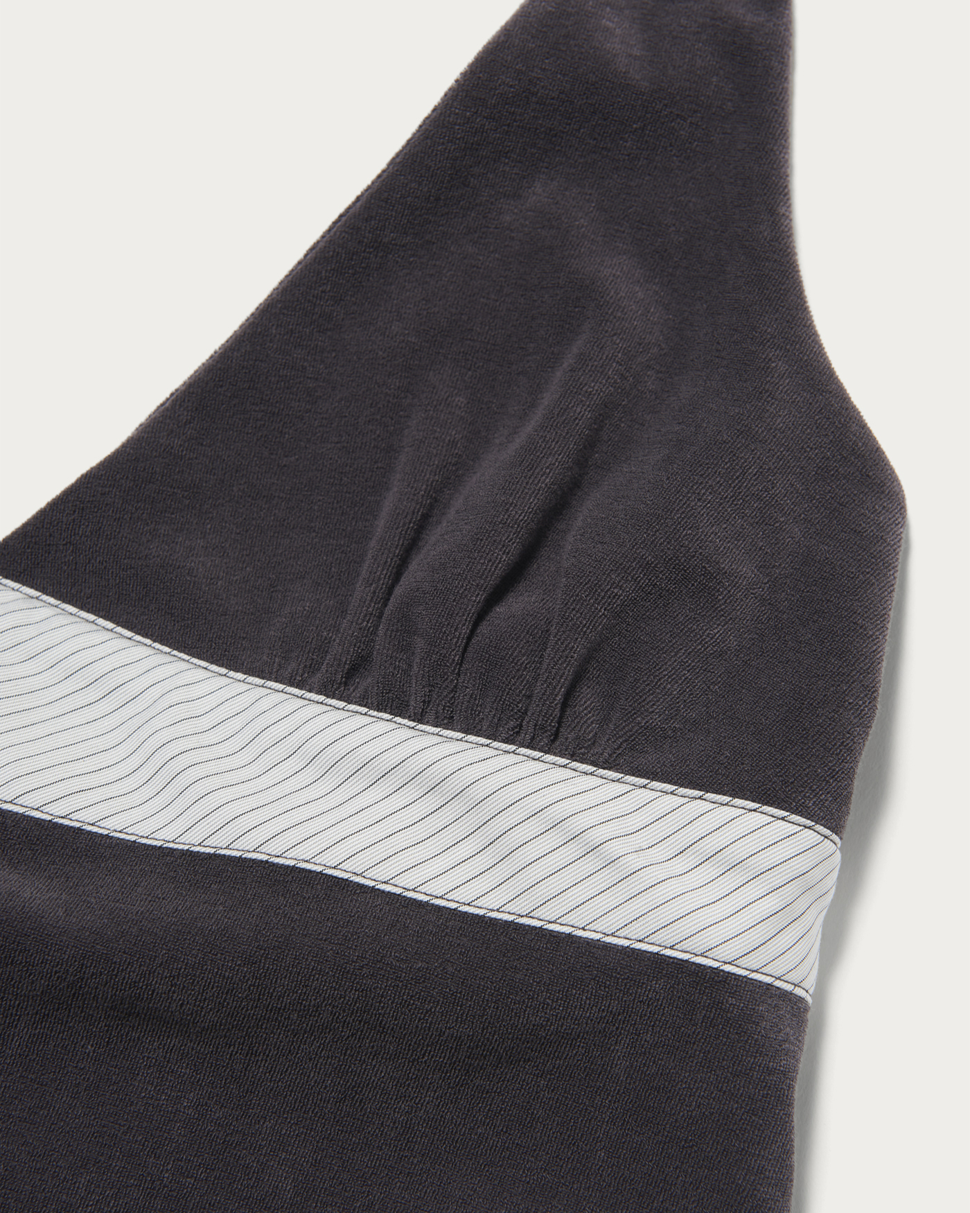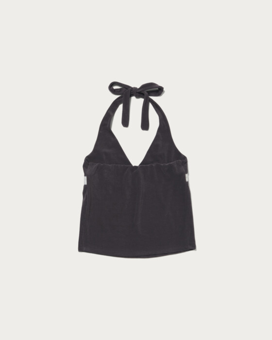 セルフタイのホルターネックトップにストライプ生地をあしらったデザイン。背面はゴム仕様でフィット感と動きやすさを両立。ストレッチ性のあるパイル素材で柔らかな風合いが魅力。春はレイヤード、夏は一枚で軽やかに着られる万能アイテムです。