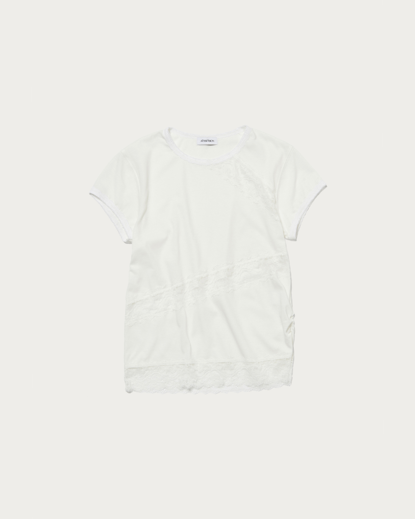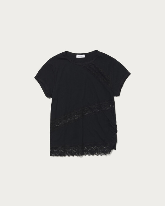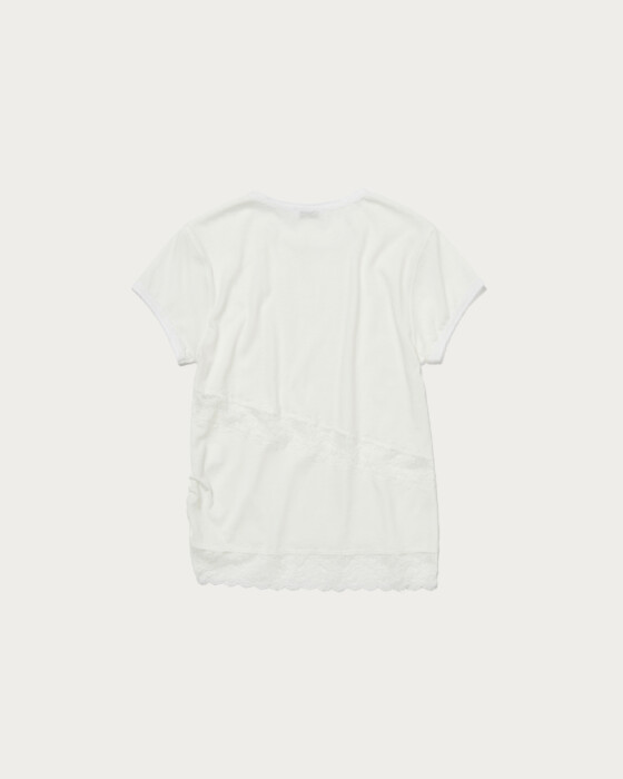 テープ状のレースをあしらったTシャツは、シンプルながら上品な印象をプラスしてくれます。トレンド感のあるゆったりとしたシルエットでデイリーに活躍。薄手の綿素材で夏まで快適、肌馴染みも抜群。無地Tシャツ感覚で着られ、襟元のレースがレイヤードにも映える万能アイテムです。