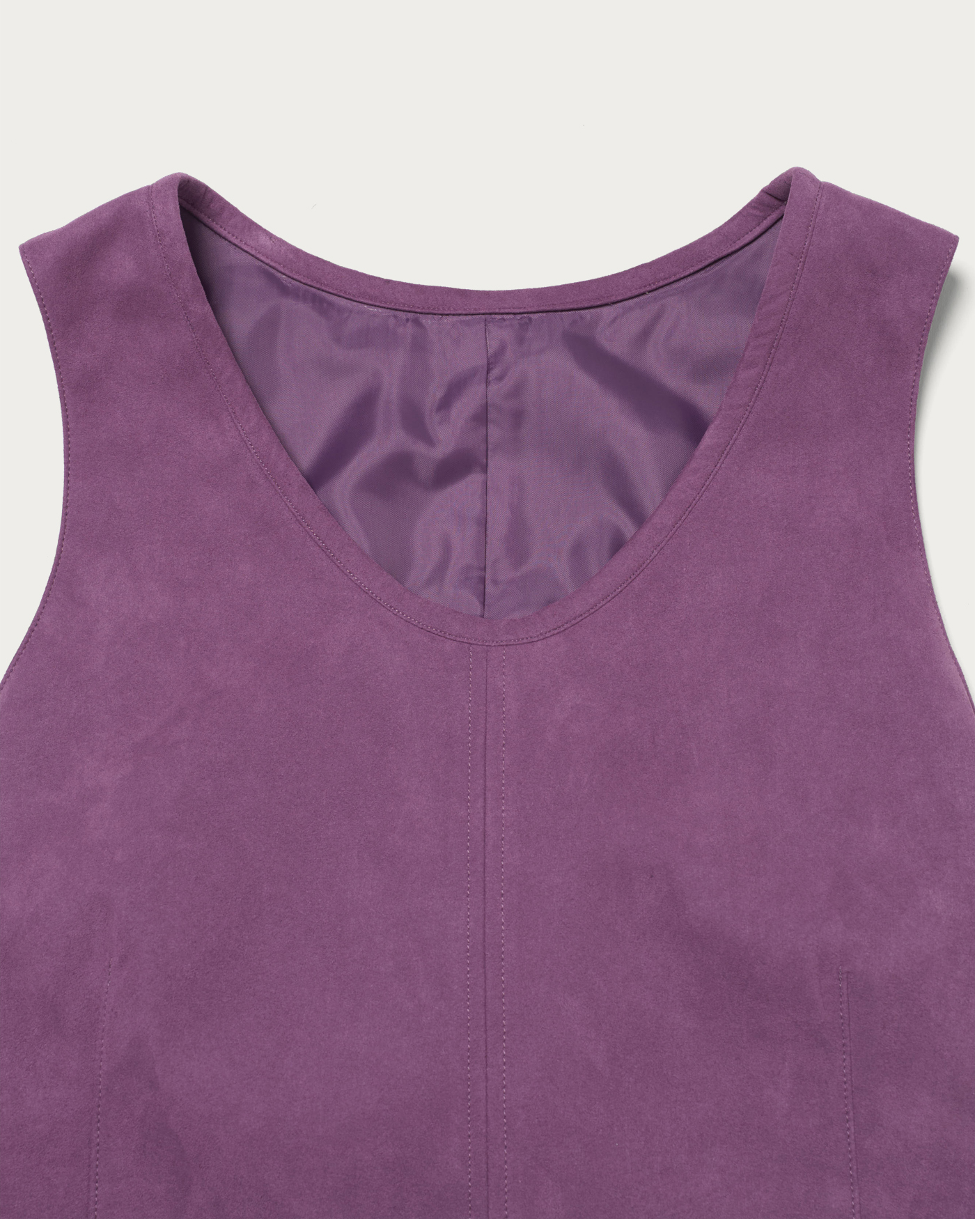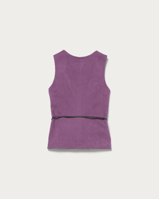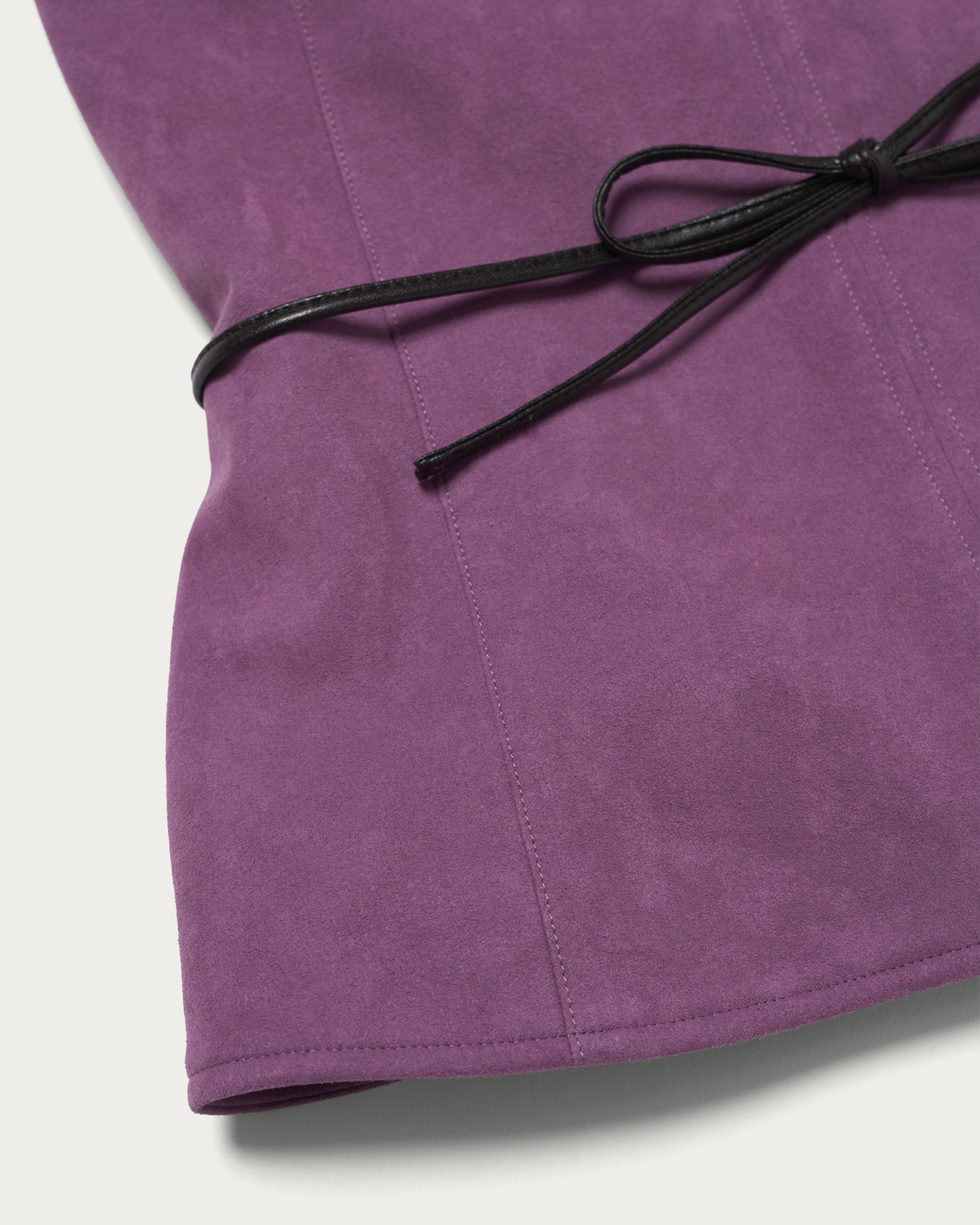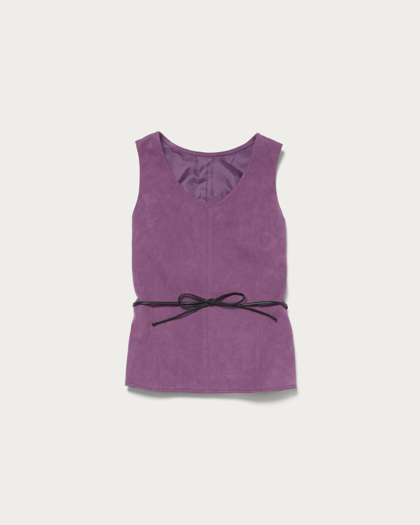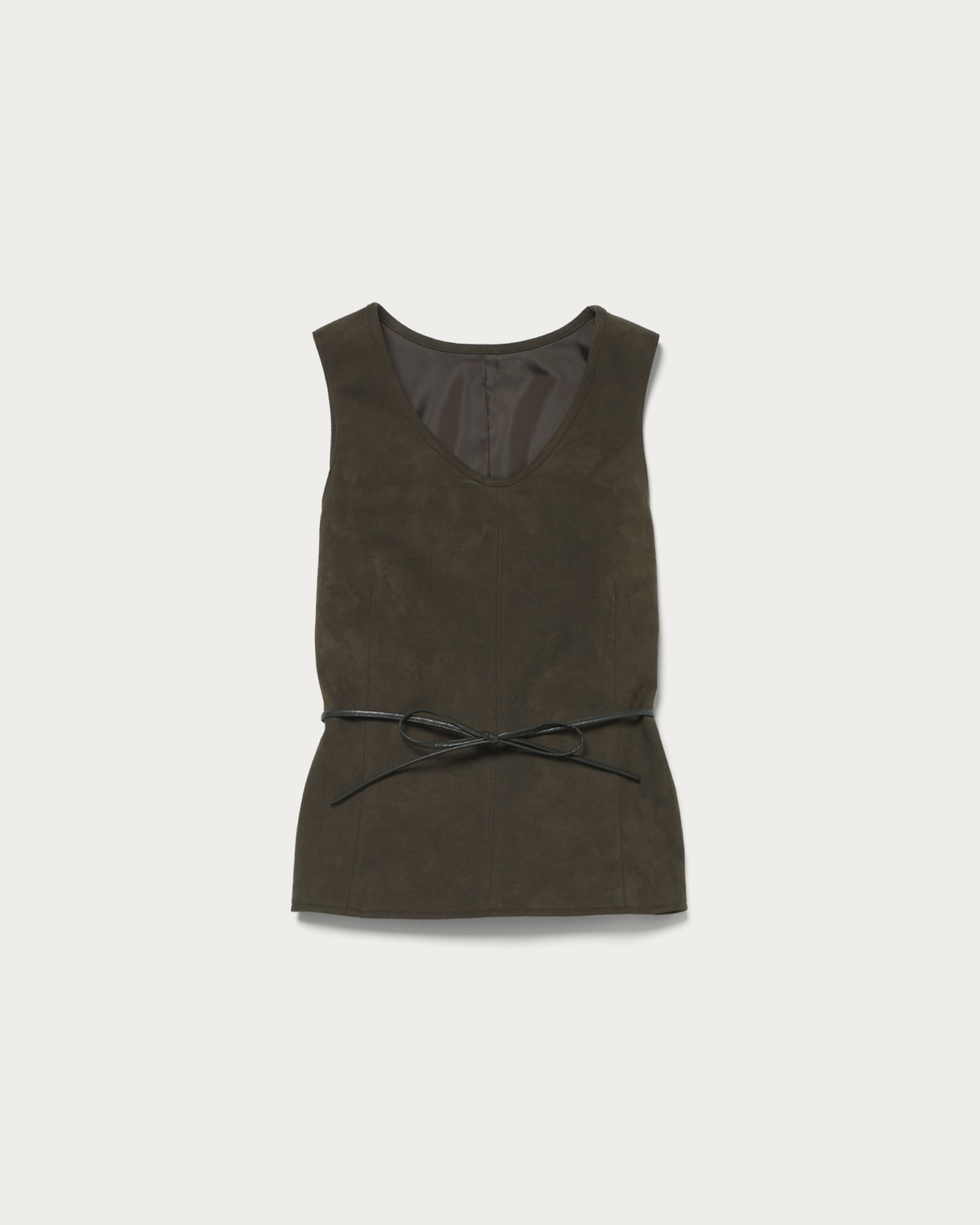ウエストダーツで美しいシェイプを強調したベスト型のトップスは、フロントで絞れるコードでシルエット調整や後ろで結んでポイントにするアレンジも可能。本革のようなソフトなタッチとスエードライクな質感が魅力。軽量で快適な着心地で、シャツやTシャツとのレイヤードにもおすすめです。