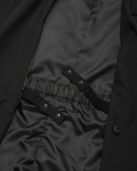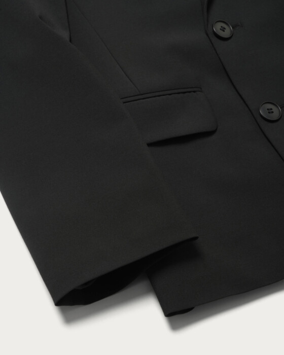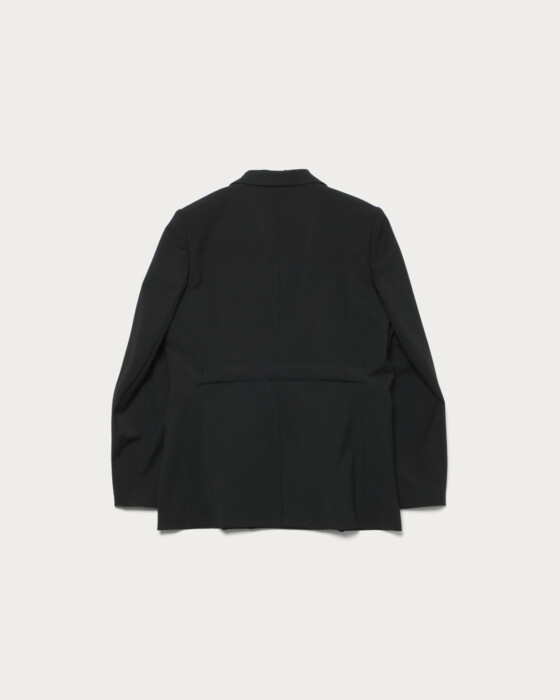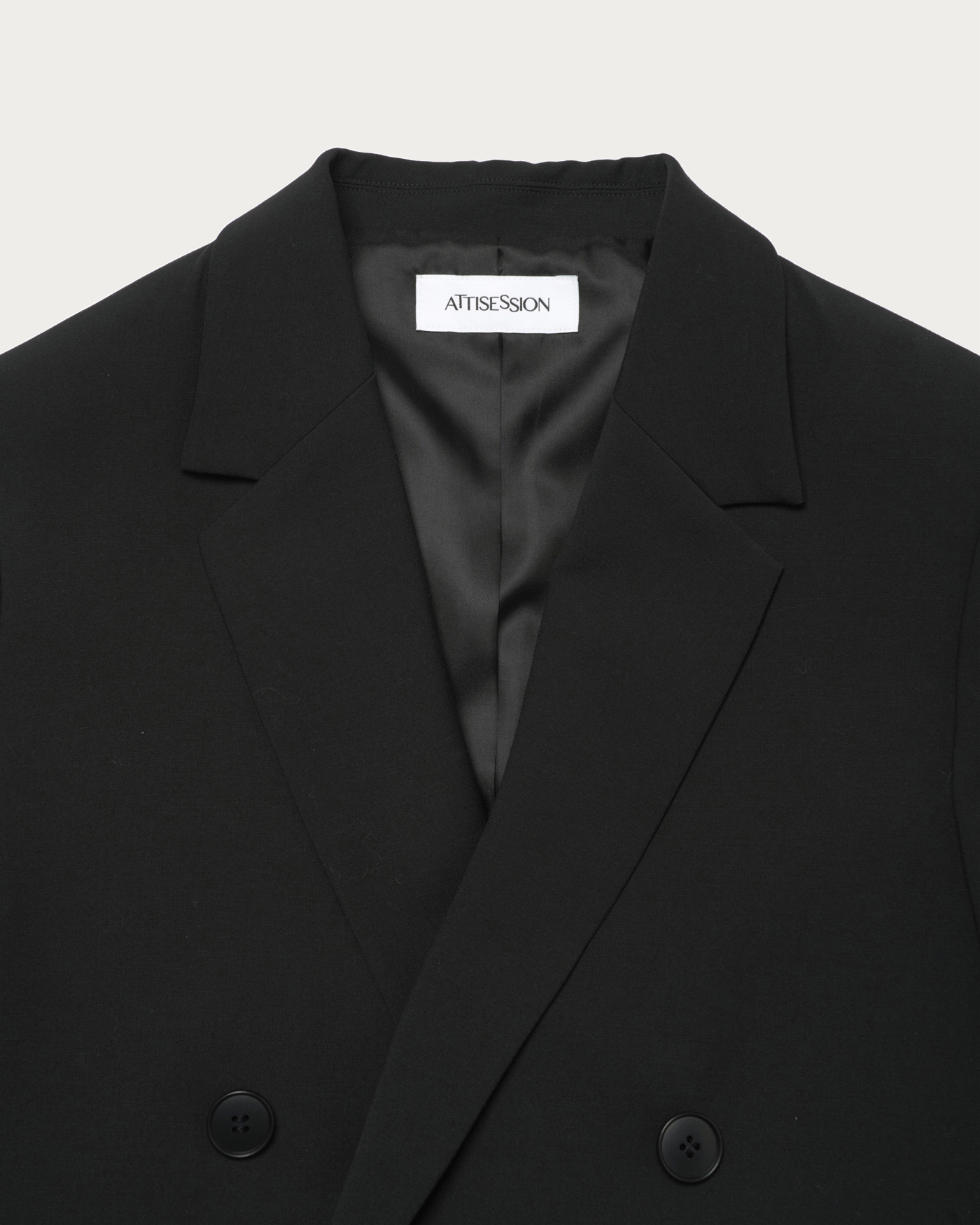 Wブレストのボクシーシルエットジャケットは、ウエストに共地ベルトを内側で留める仕様を採用しすっきりとした印象に。さらりとした無地のトロピカル素材で、セットアップはもちろんデニムとのカジュアルなスタイリングにもおすすめ。春の着こなしにモード感をプラスする一着です。