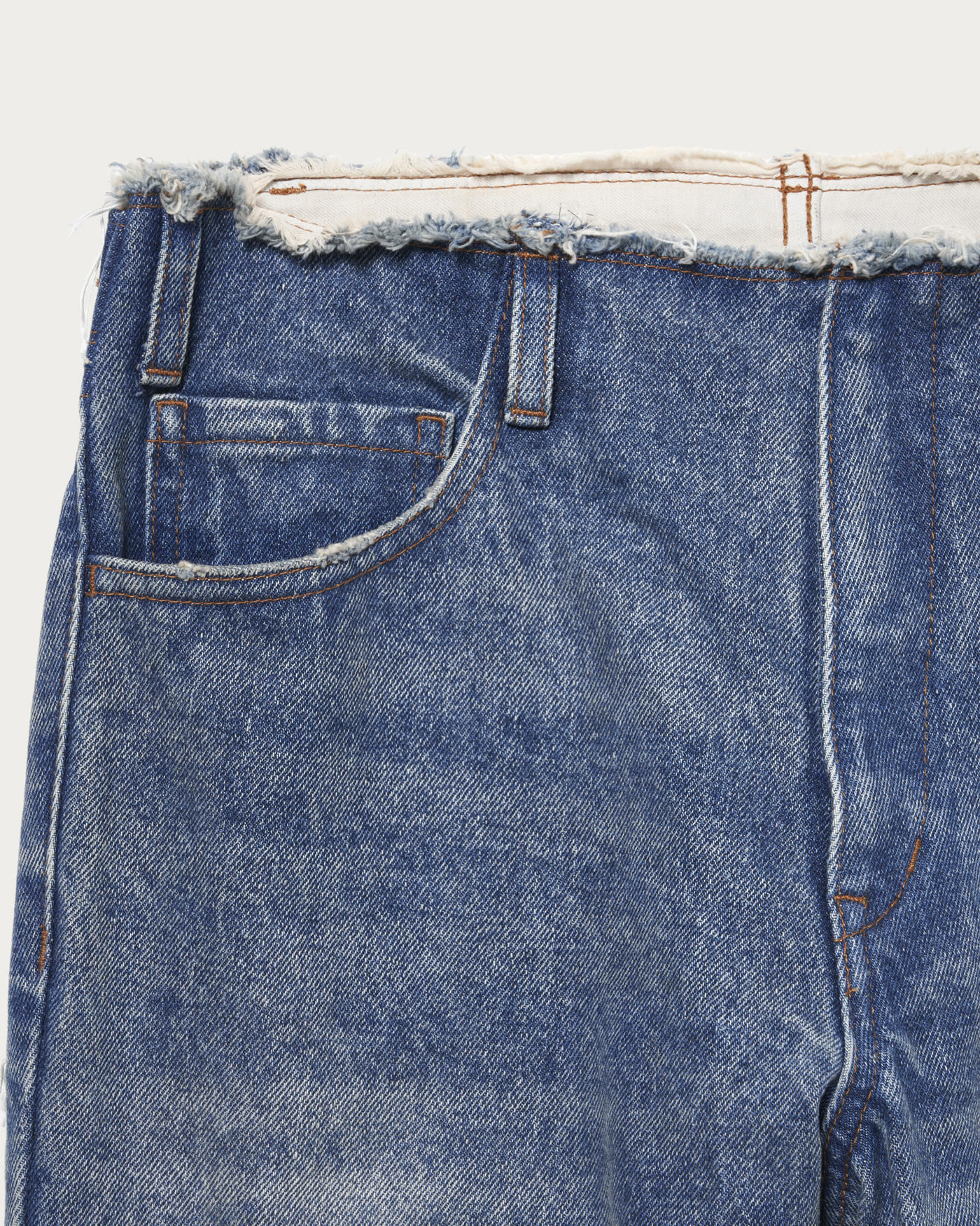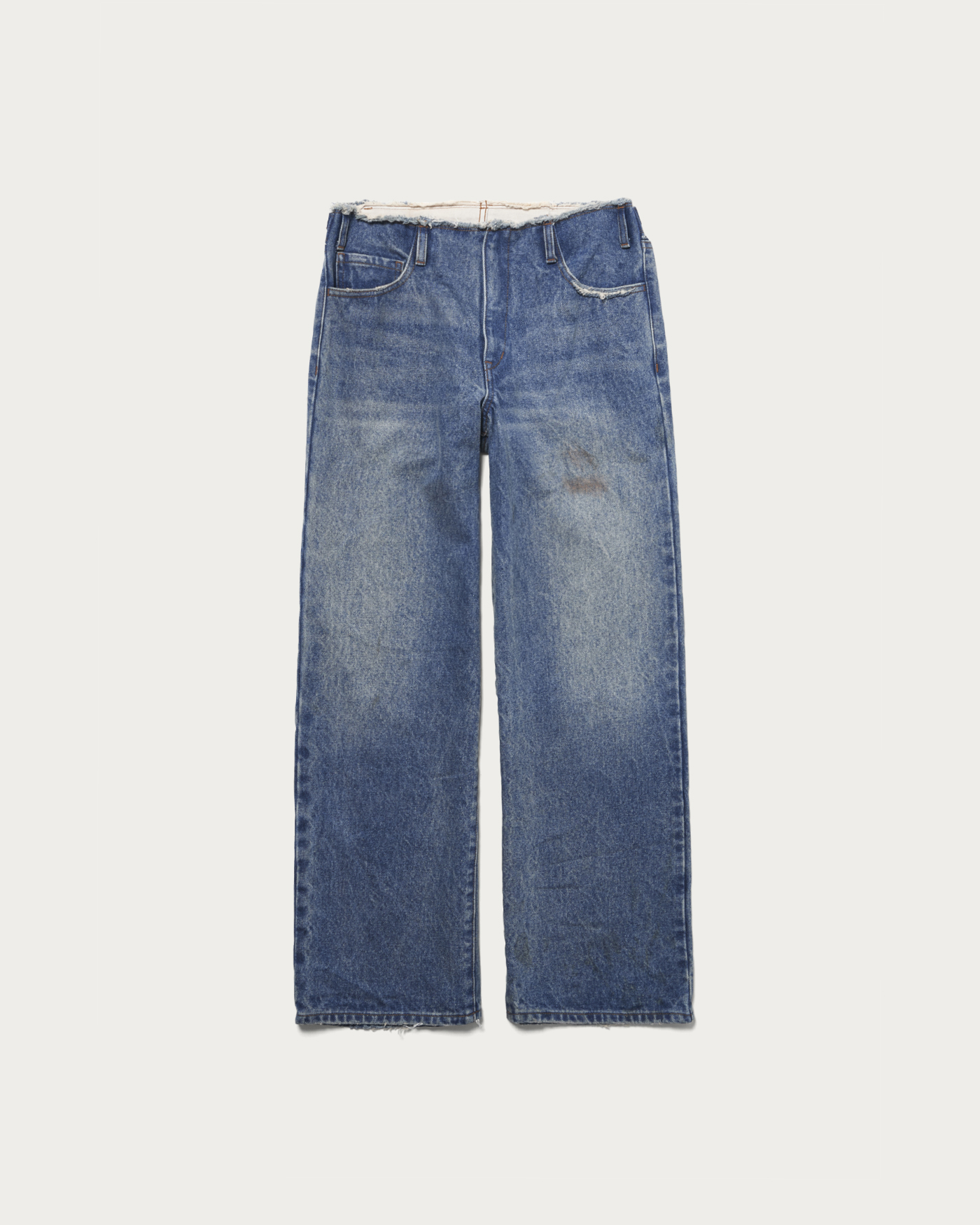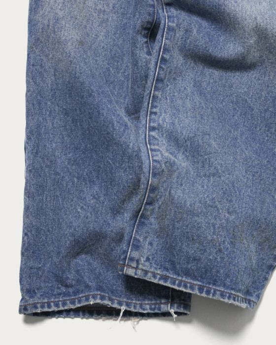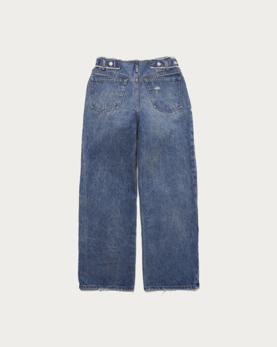 5ポケットデニムをリメイクしたようなデザインで、ブリーチやペンキ加工などを施しヴィンテージ感を演出。14ozの厚手デニムを使用し、存在感のある仕上がりです。カジュアルスタイルの主役になる一本で、個性的な加工がコーディネートにアクセントを加えます。