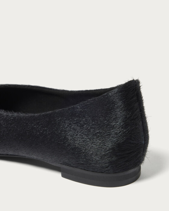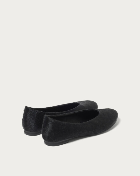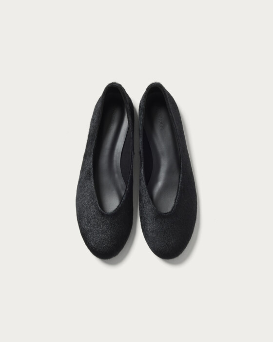 ハラコ素材を使用したバレエシューズ。レザーとは異なる柔らかな質感と、モードな雰囲気が魅力です。上品さと個性を兼ね備え、シンプルなコーディネートにもアクセントを加える一足。カジュアルにもきれいめにも合わせやすく、スタイリングの幅を広げてくれます。
