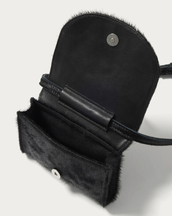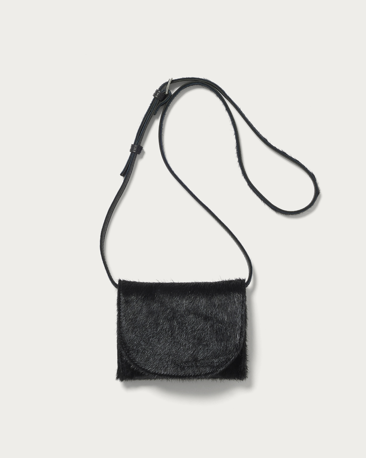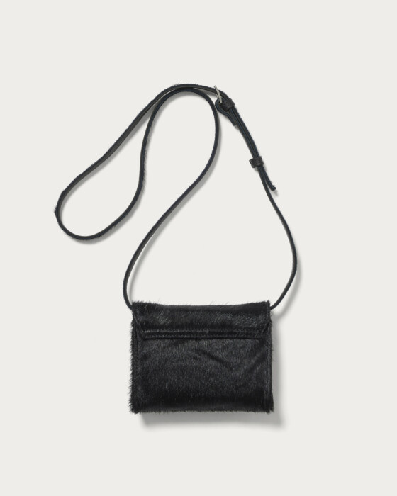 ハラコ素材を使用したミニバッグは、レザーとは異なる柔らかな質感とモードな雰囲気が魅力。上品さと個性を兼ね備え、シンプルなコーディネートにもアクセントを加えます。ストラップは短くしてポシェット風、クロスボディ、ハンドバッグと多彩なアレンジが可能。カジュアルにもきれいめにも合わせやすく、スタイリングの幅を広げる一品です。