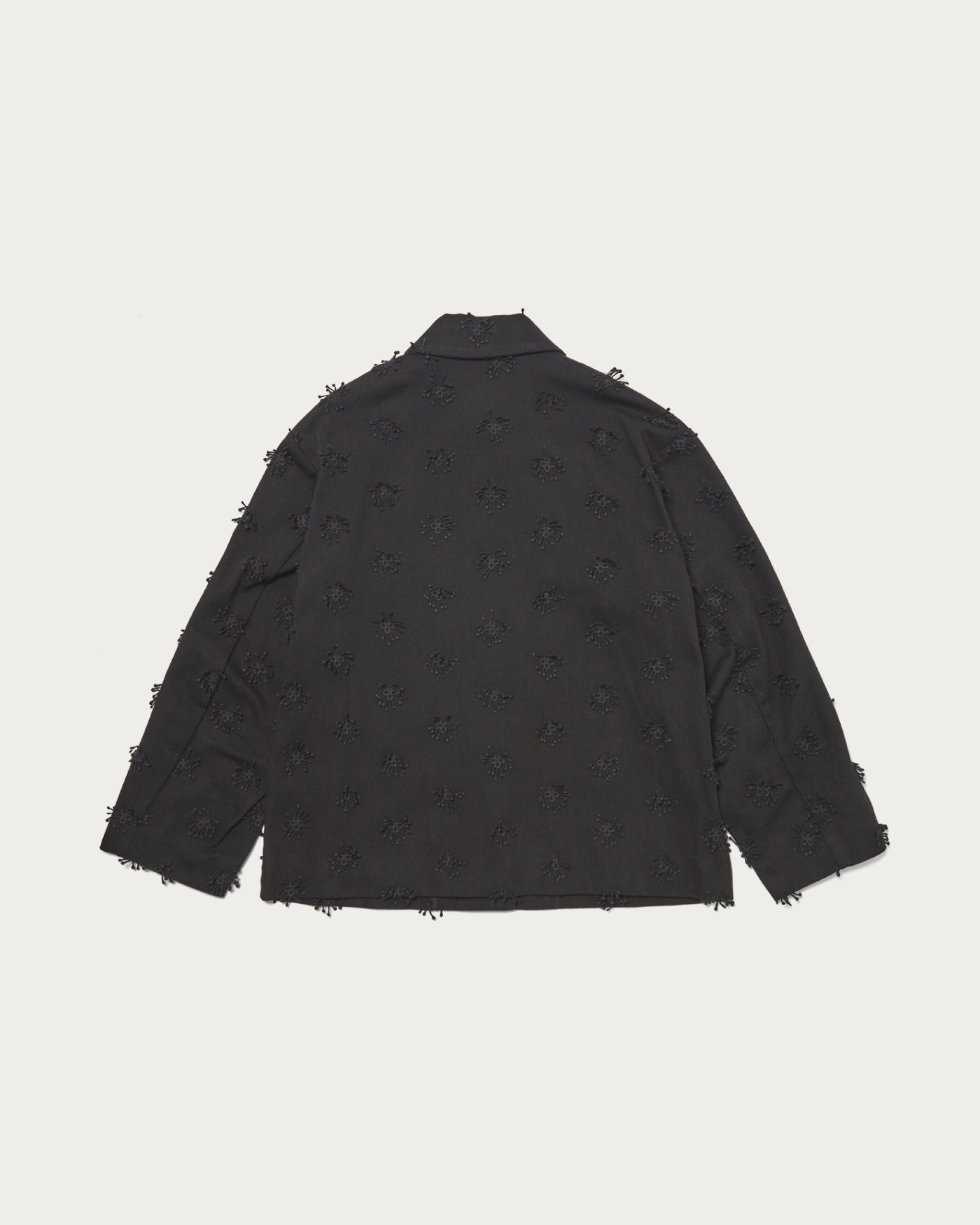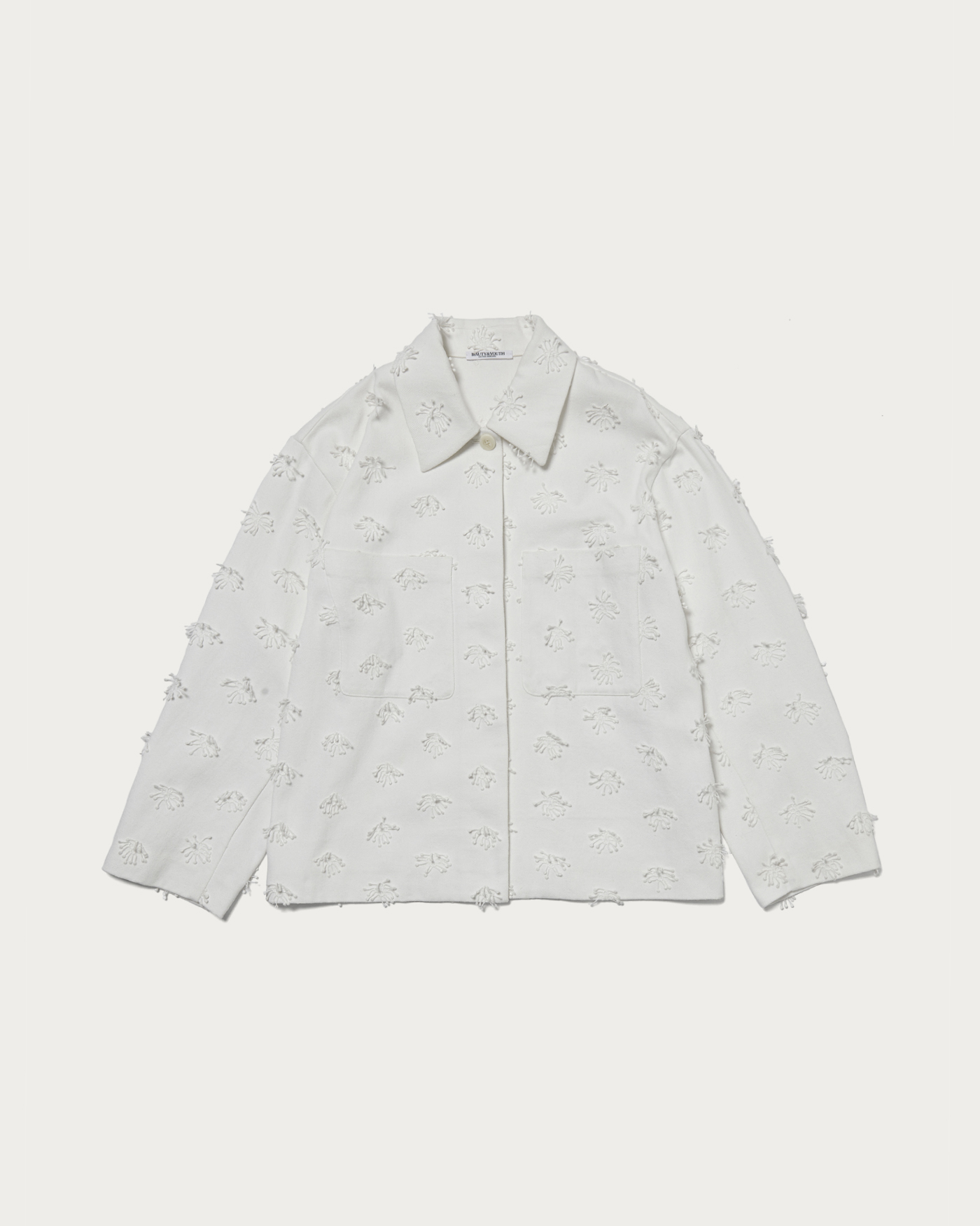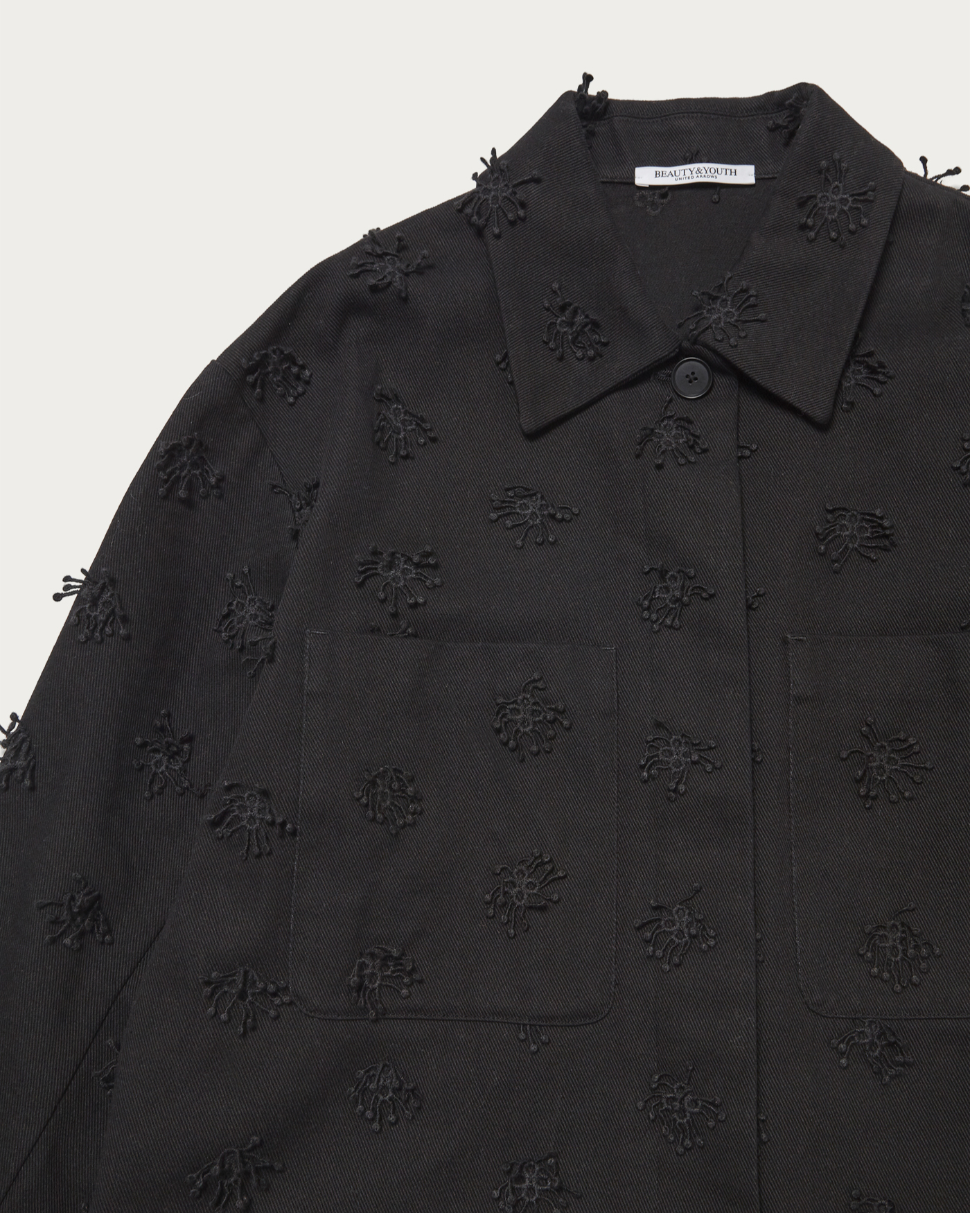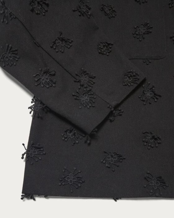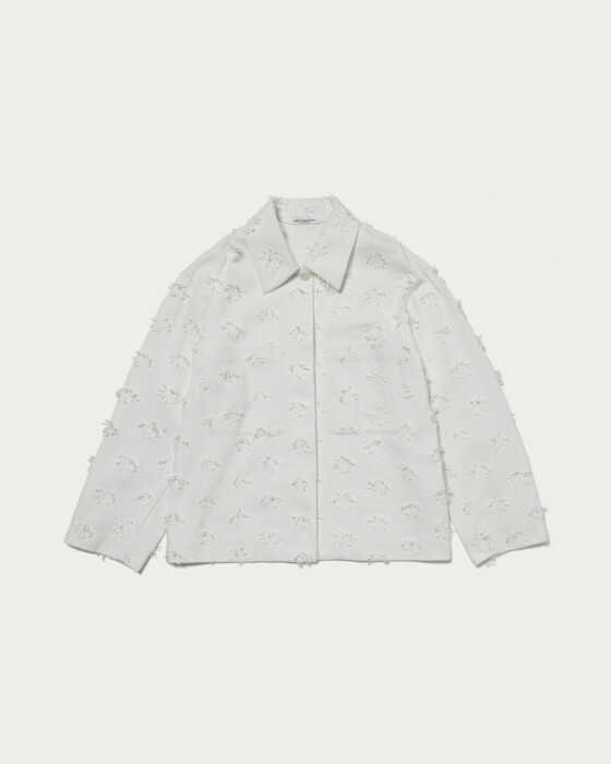 立体的な刺繍を施しシンプルに軽く羽織れるショートジャケット。比翼仕立てにしたボタンと、大きめのポケットもポイントです。シンプルなボトムを合わせたジャケットが主役のスタイルも素敵ですが、ぜひセットアップにも挑戦していただきたいアイテムです。
