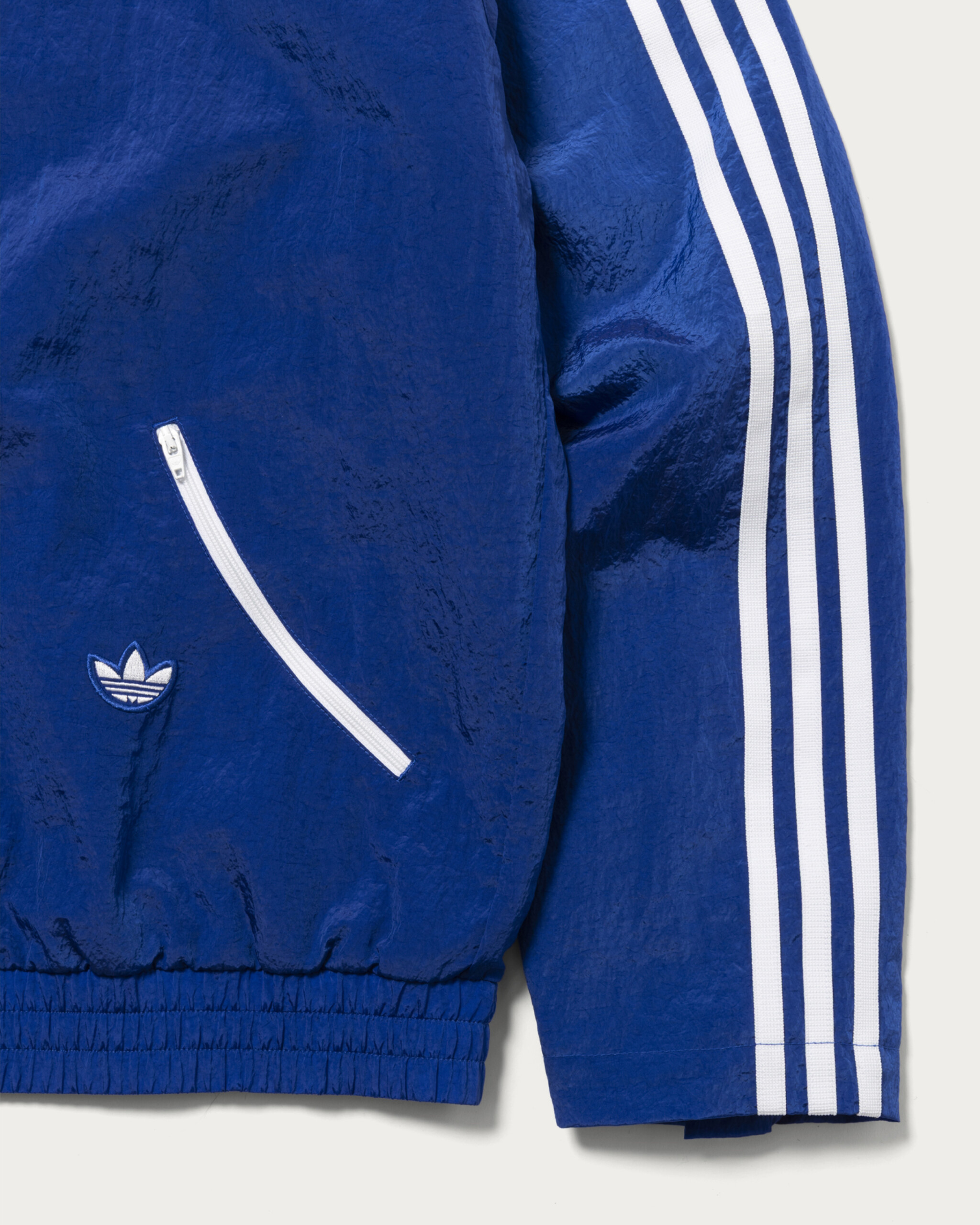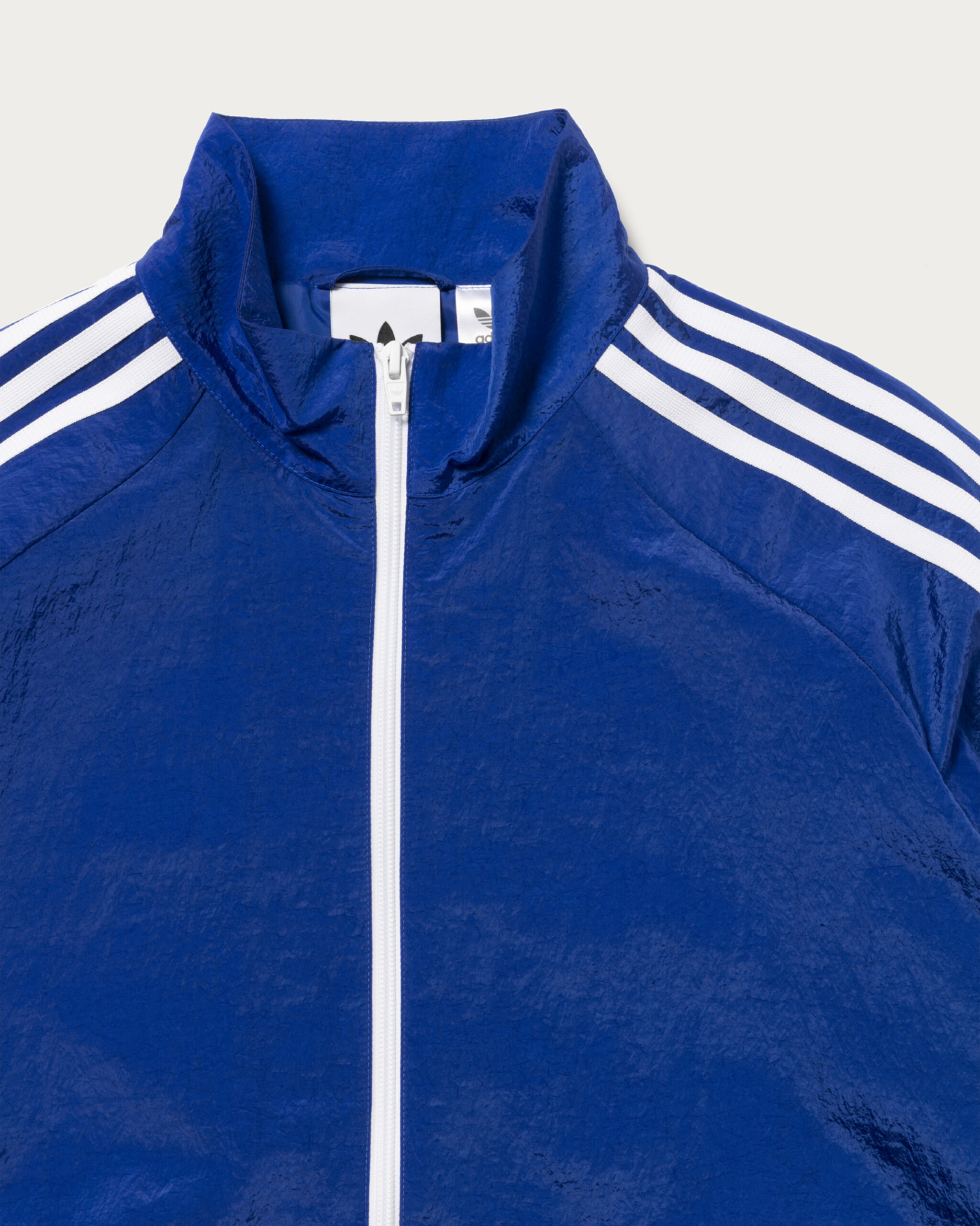 〈adidas Originals(アディダスオリジナルス)〉との別注ジャケットは、レトロアディダスをテーマにし、春らしく軽く涼しい素材を使用した今シーズンらしい少し短丈で丸みあるシルエットに。ラインが立ち襟から袖まで続く3本ラインが特徴です。また、袖口をコンシールファスナーにし、湾曲したポケット口にワッペンのトレフォイルマークをあしらってレトロ感を演出しました。(ウィメンズ品番:1625-4-000106)