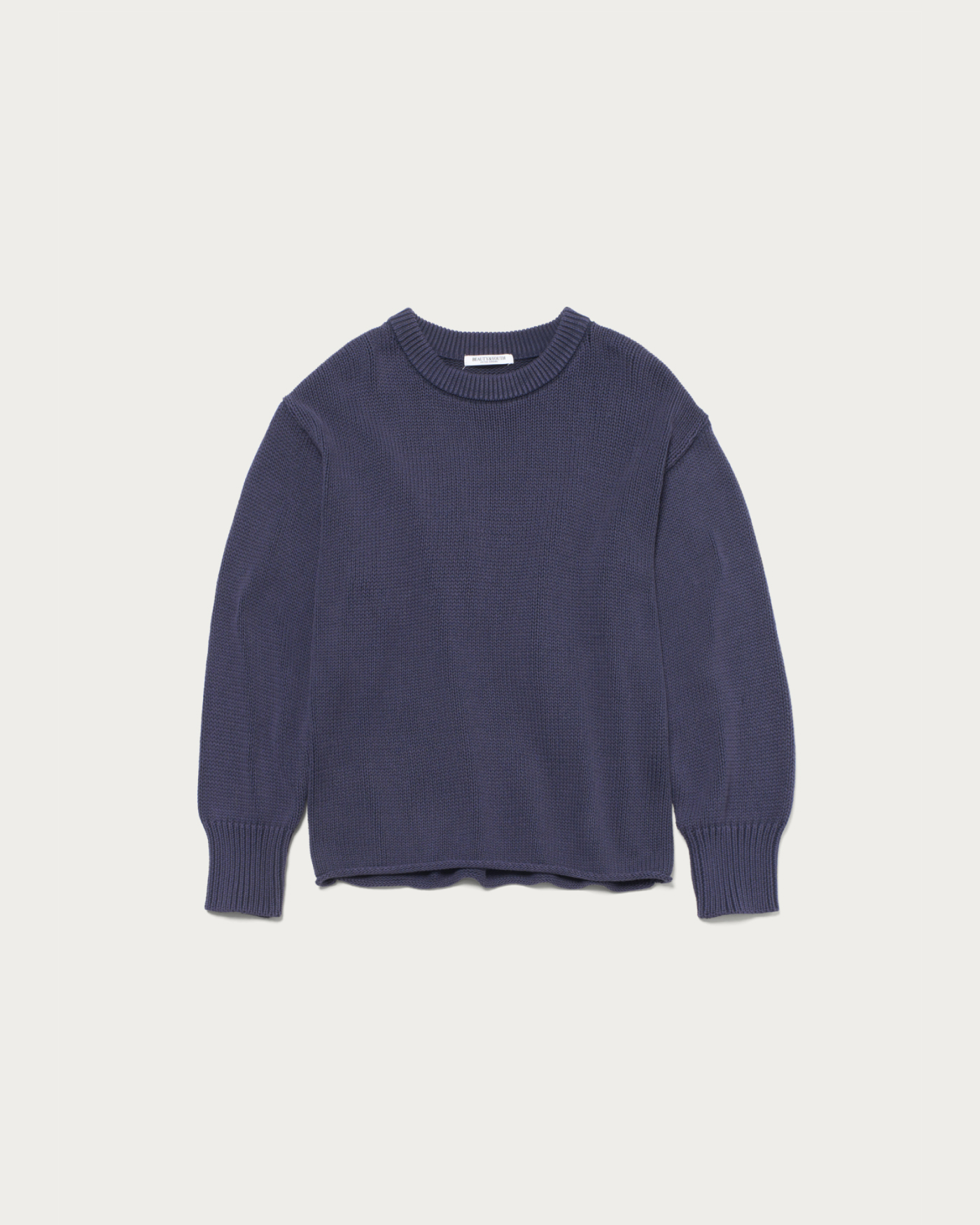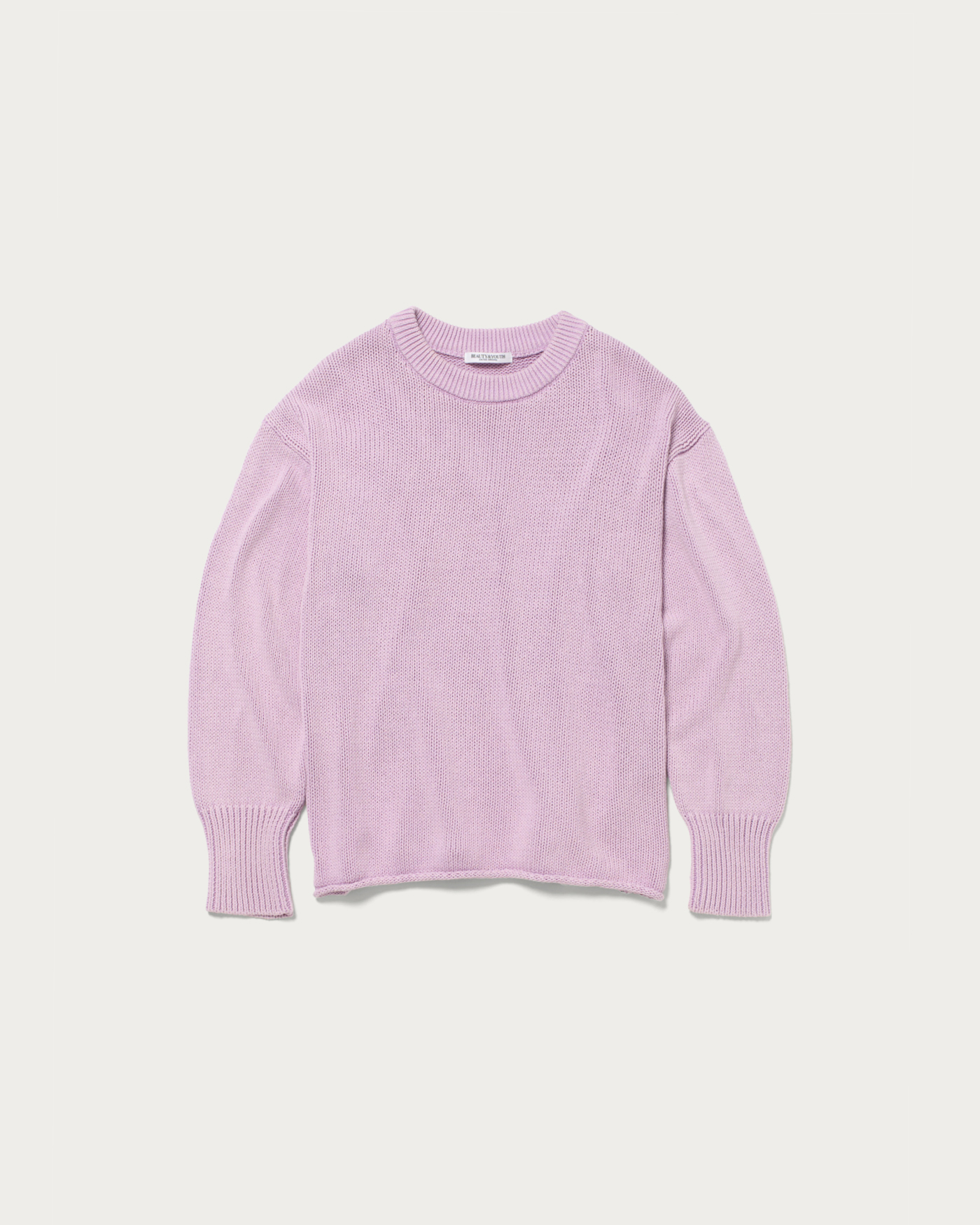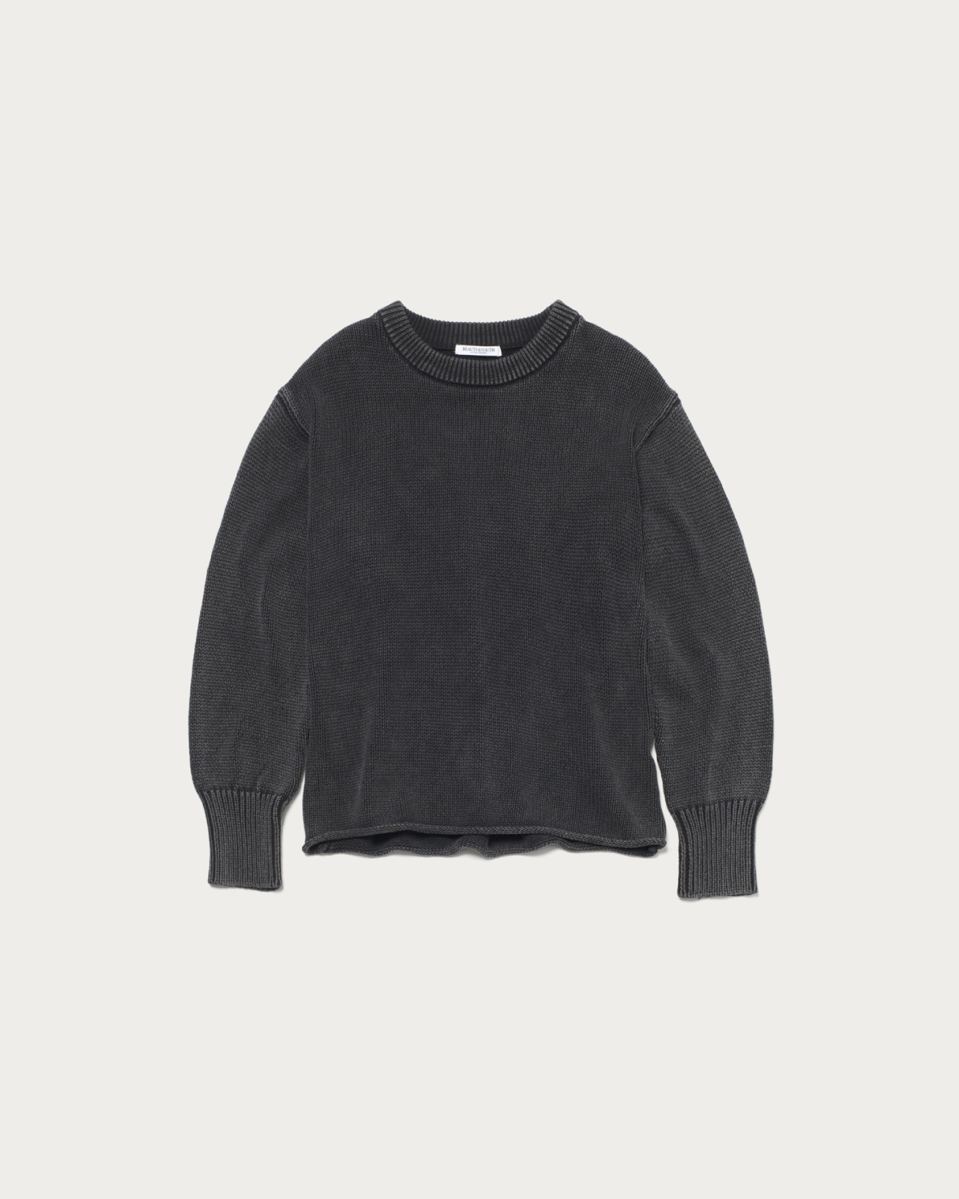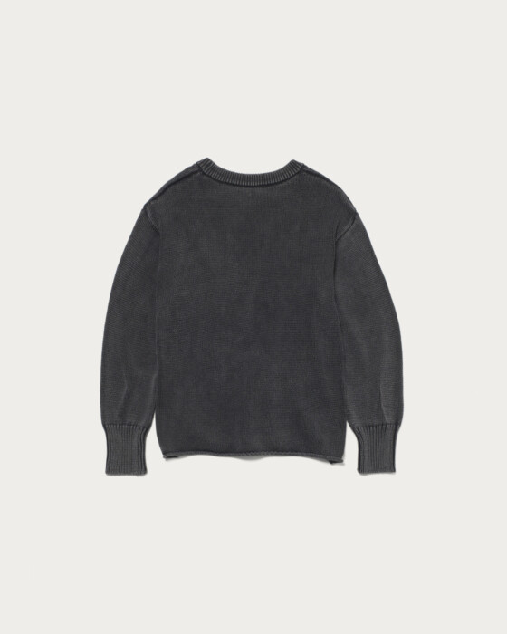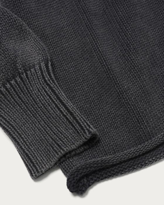 ややゆったりとしたシルエットで裾を編み、端をロールさせた抜け感のあるニットプルオーバー。コットン糸を多本取りしたものを編み立てた後に、色落ち加工を施し、ヴィンテージのムード溢れる一着に仕上げました。
