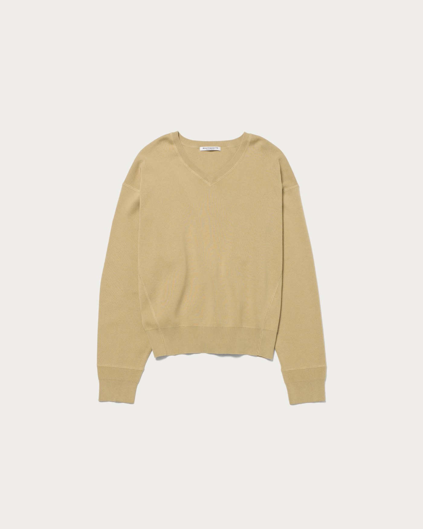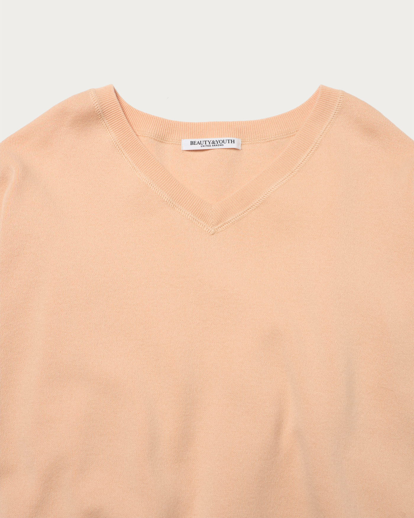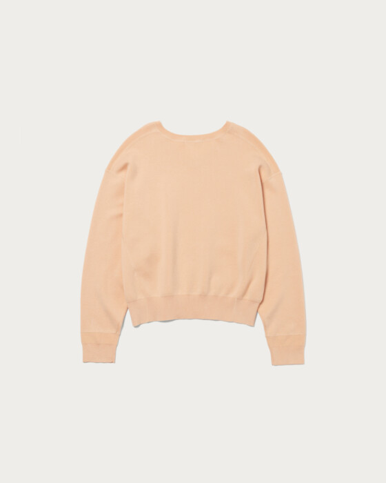 ソフトで肌触りの良いコットン素材をスムース編みにして膨らみを出したニットプルオーバー。ドロップショルダーにゆったりとしたシルエットを組み合わせることで、リラックスした着こなしを演出する一着に仕上がりました。一枚でも着やすい適度な開きのすっきりとしたVネックがポイントです。