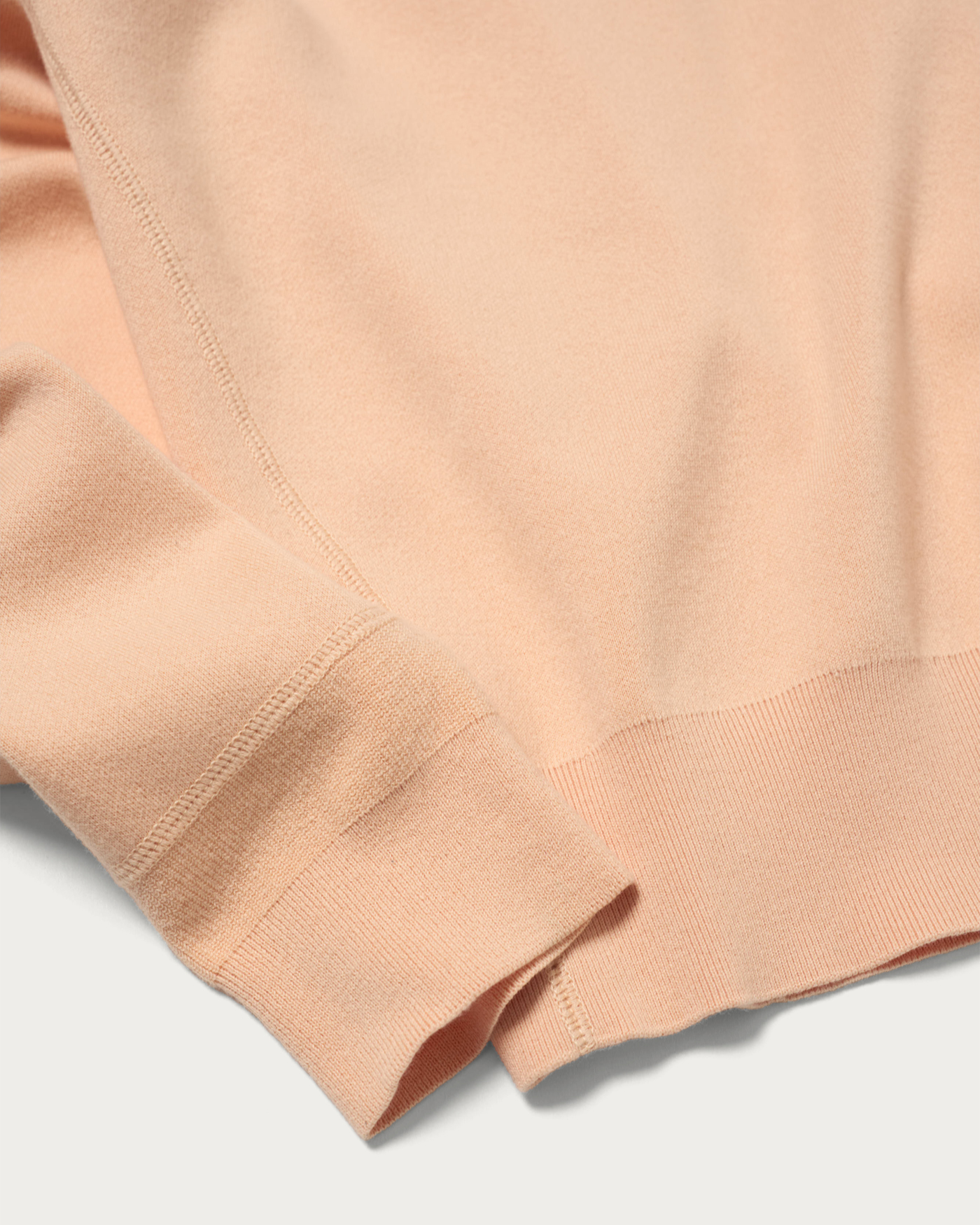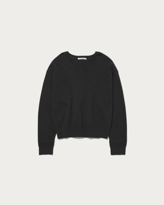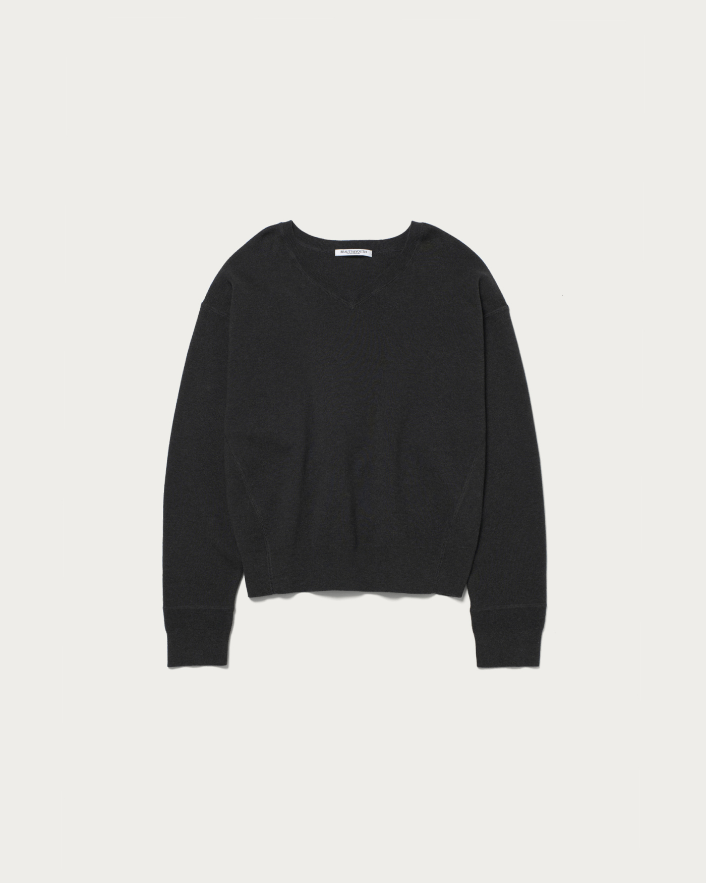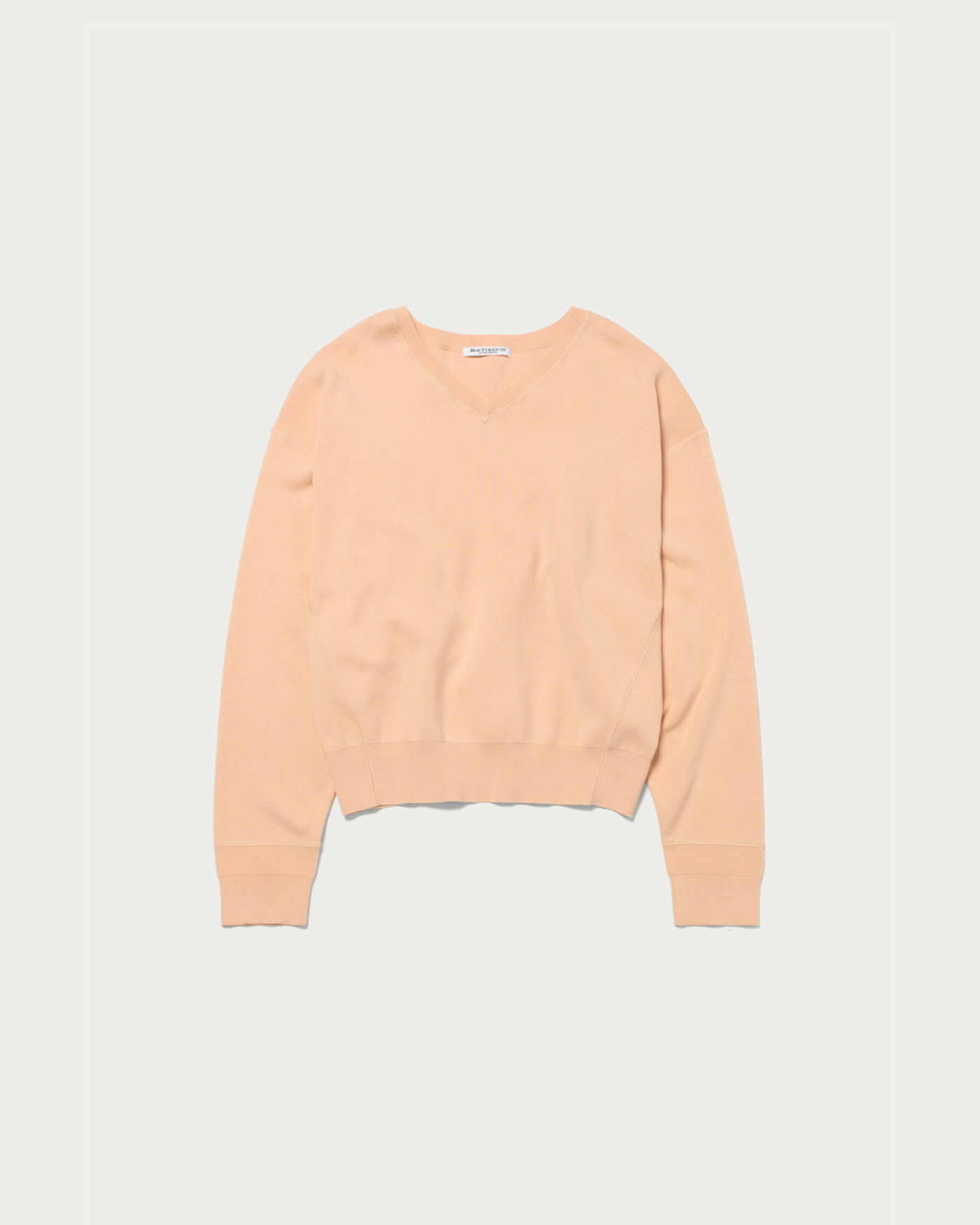 ソフトで肌触りの良いコットン素材をスムース編みにして膨らみを出したニットプルオーバー。ドロップショルダーにゆったりとしたシルエットを組み合わせることで、リラックスした着こなしを演出する一着に仕上がりました。一枚でも着やすい適度な開きのすっきりとしたVネックがポイントです。