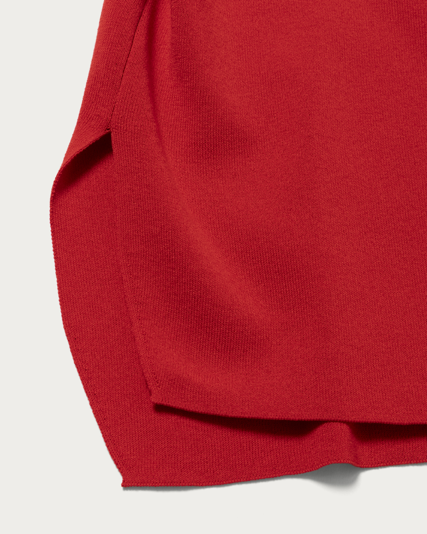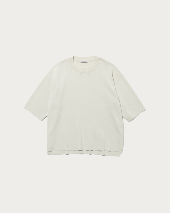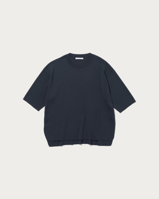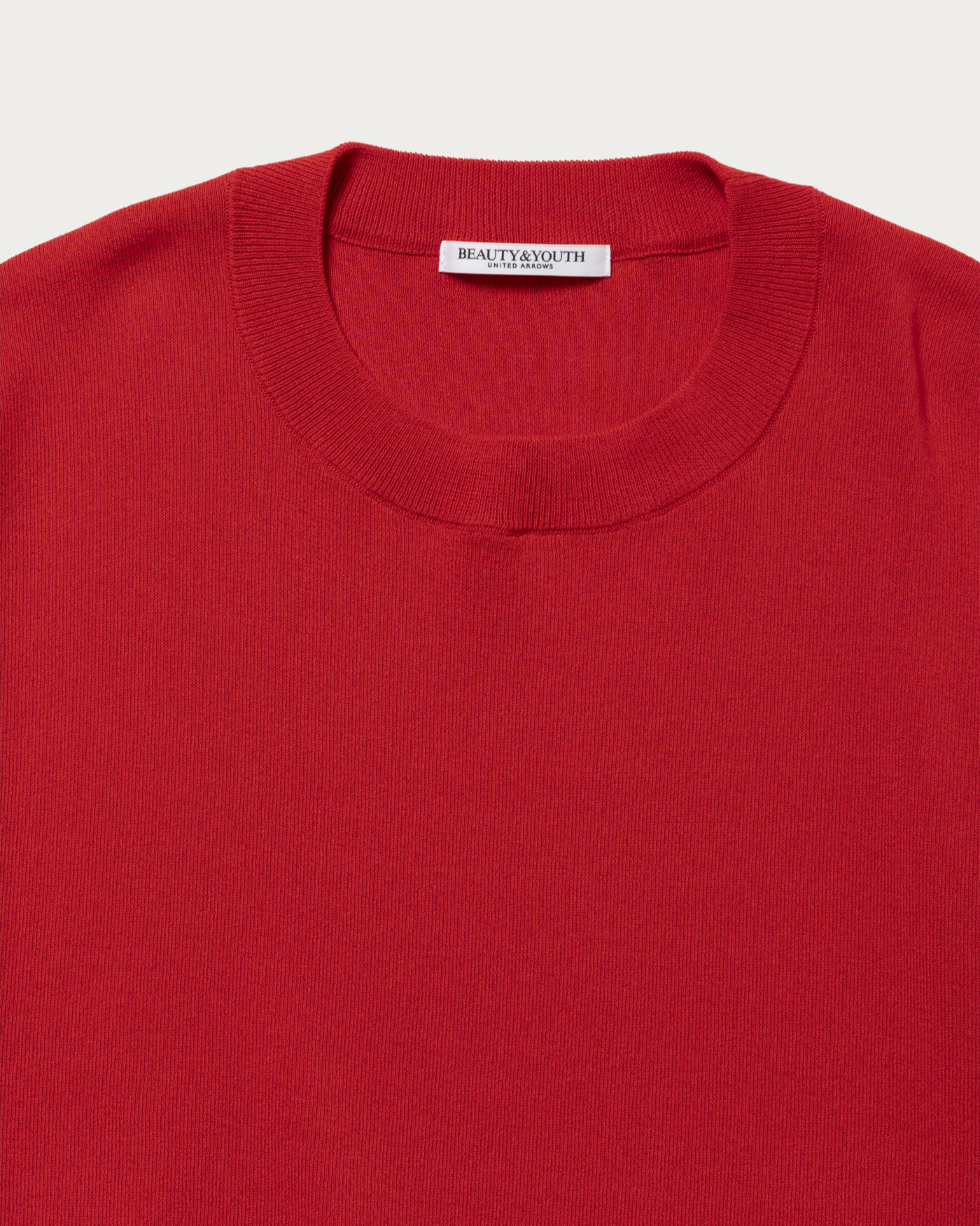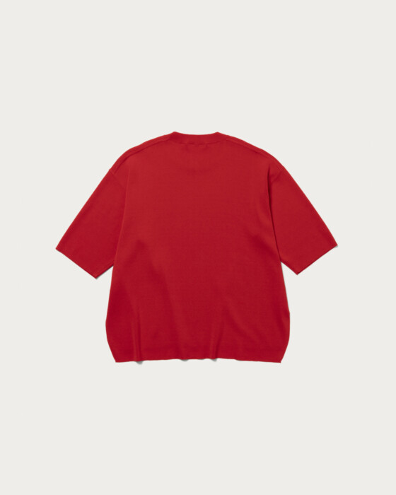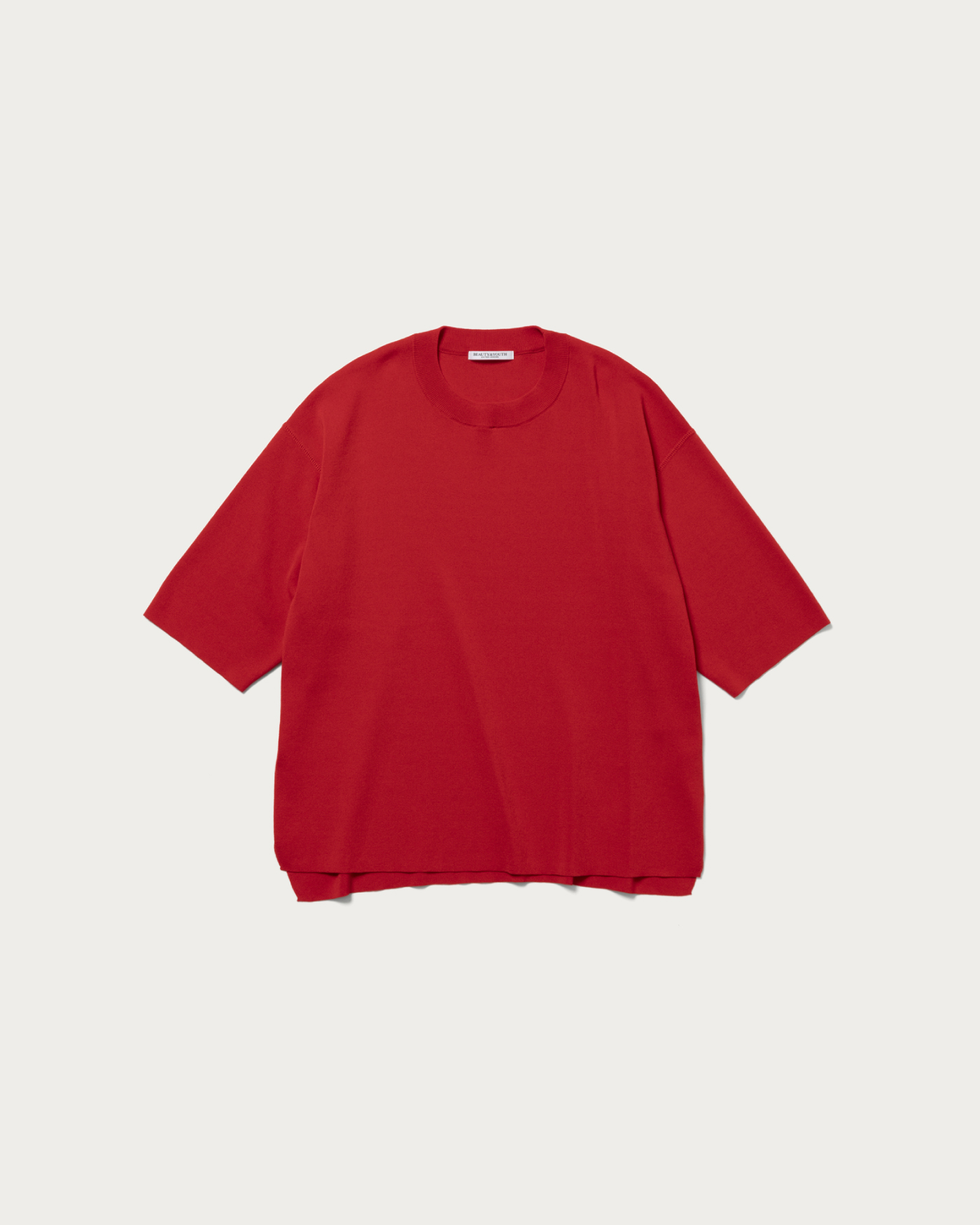 シャリ感のあるコットンポリエステルの混紡糸で編みたてたニットプルオーバー。Tシャツのようなフラット感を持ちながらも、裾をラウンドさせることで上品な雰囲気が漂う一着に仕上げました。カラーはオフホワイトとレッド、ネイビーの3色をご用意。