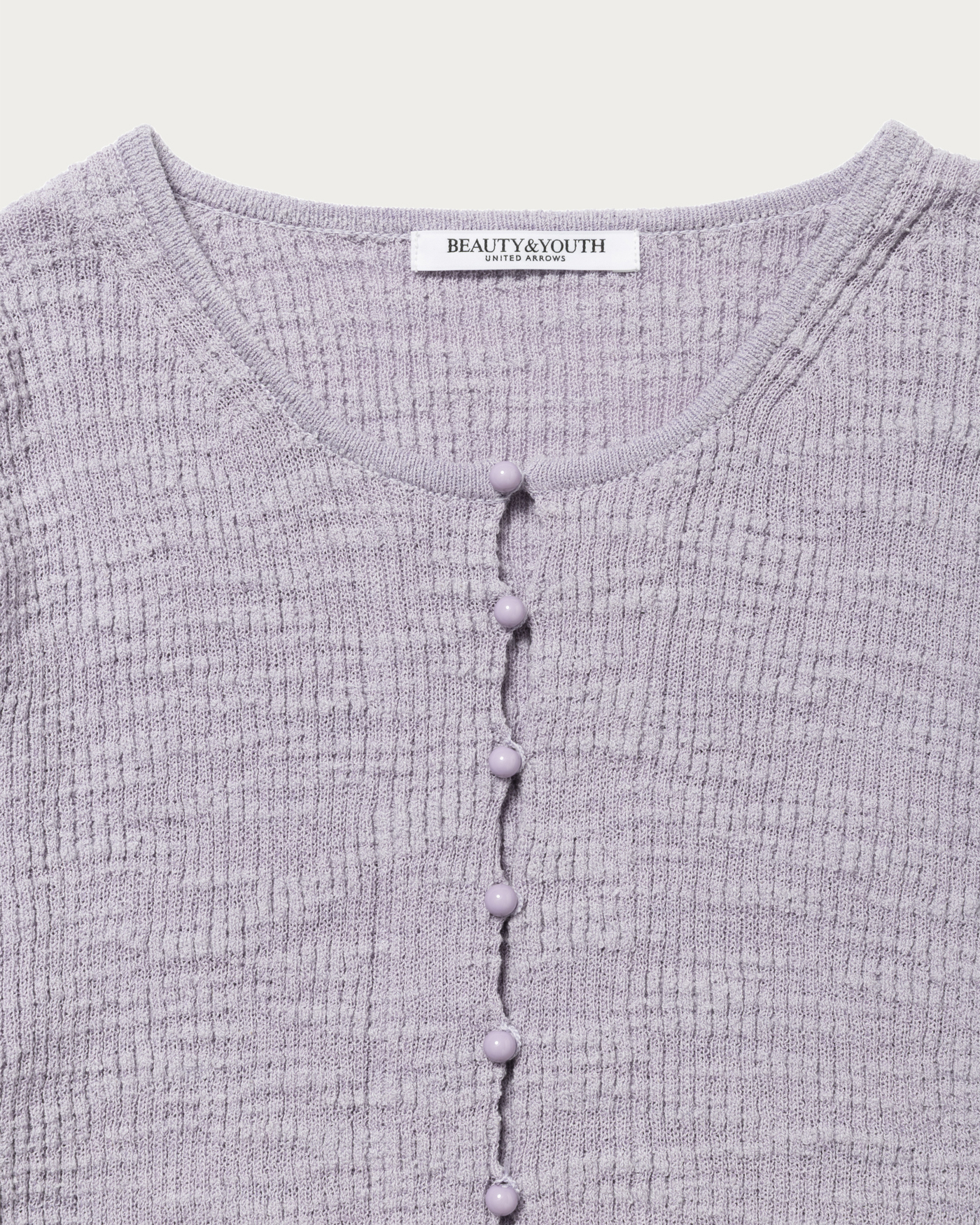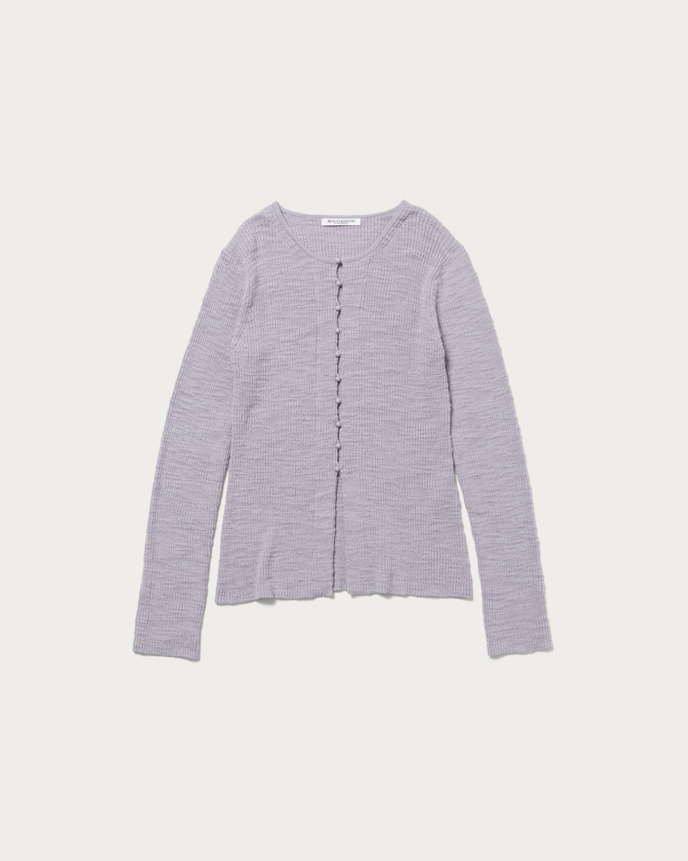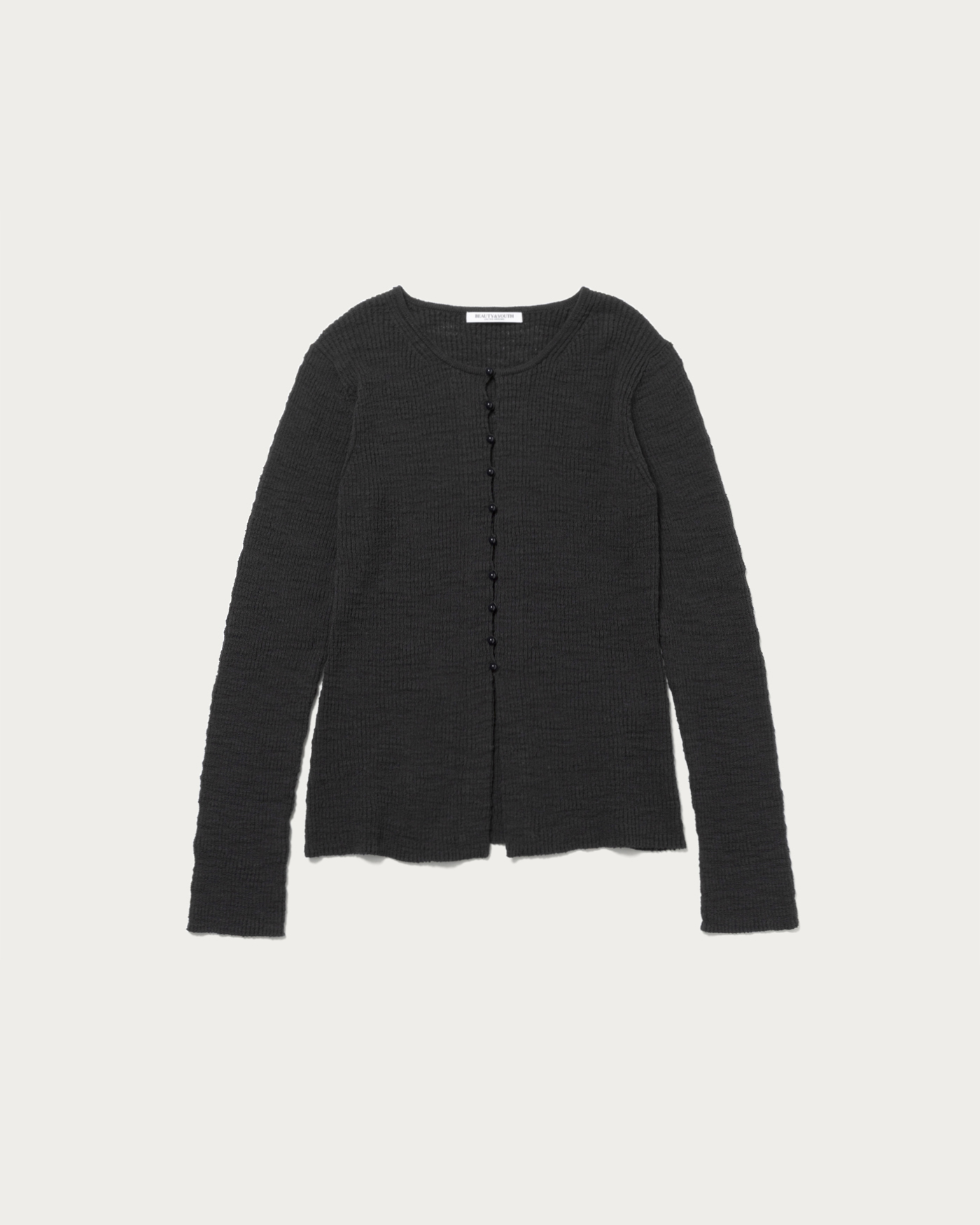 綿ナイロンのスラブ糸を使用したリブ編のカーディガン。豊かな糸の表情をポイントにシンプルなリブ編にし、衿やフロントは華奢に仕上げました。ボール状のボタンをたくさんつけたデザインを活かし、トップスのように着用するのがおすすめです。