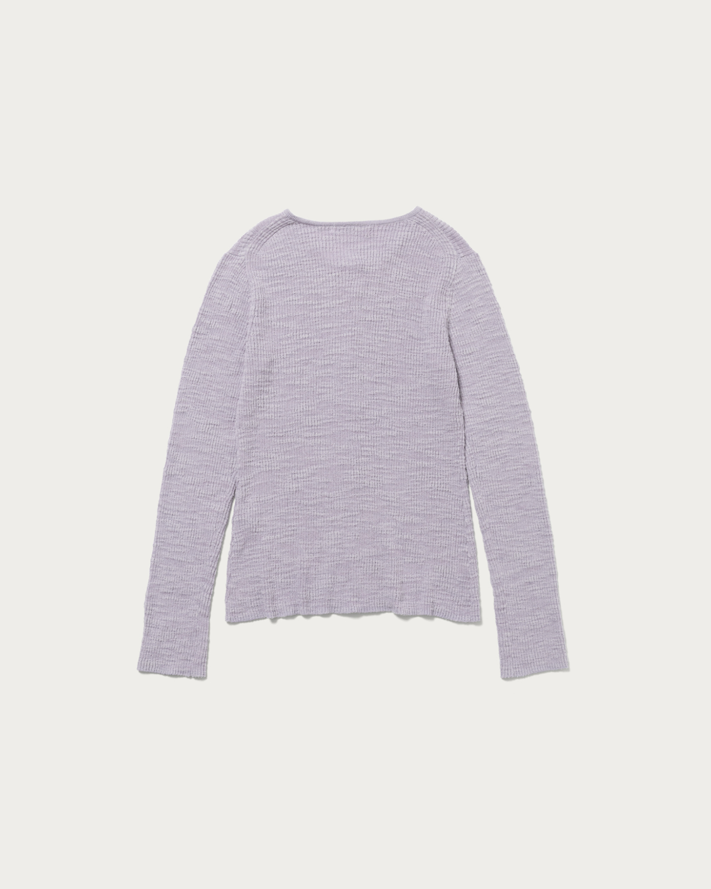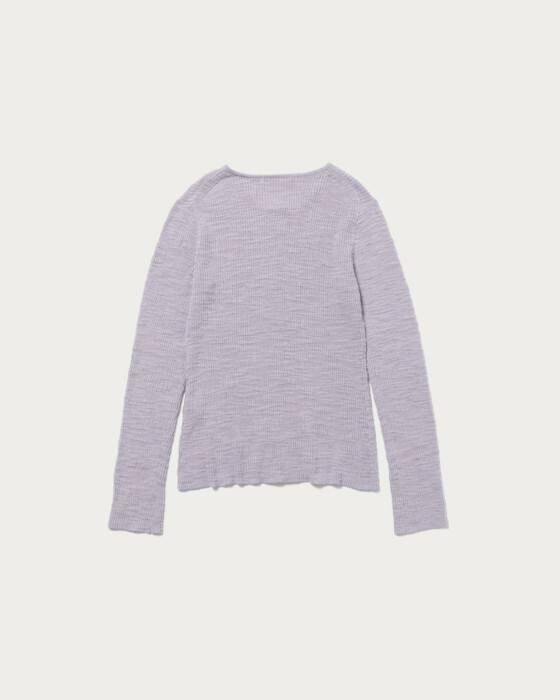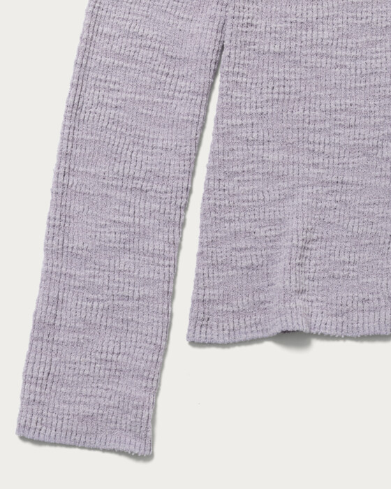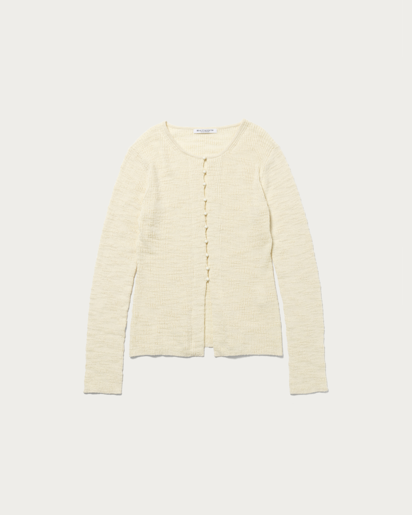綿ナイロンのスラブ糸を使用したリブ編のカーディガン。豊かな糸の表情をポイントにシンプルなリブ編にし、衿やフロントは華奢に仕上げました。ボール状のボタンをたくさんつけたデザインを活かし、トップスのように着用するのがおすすめです。