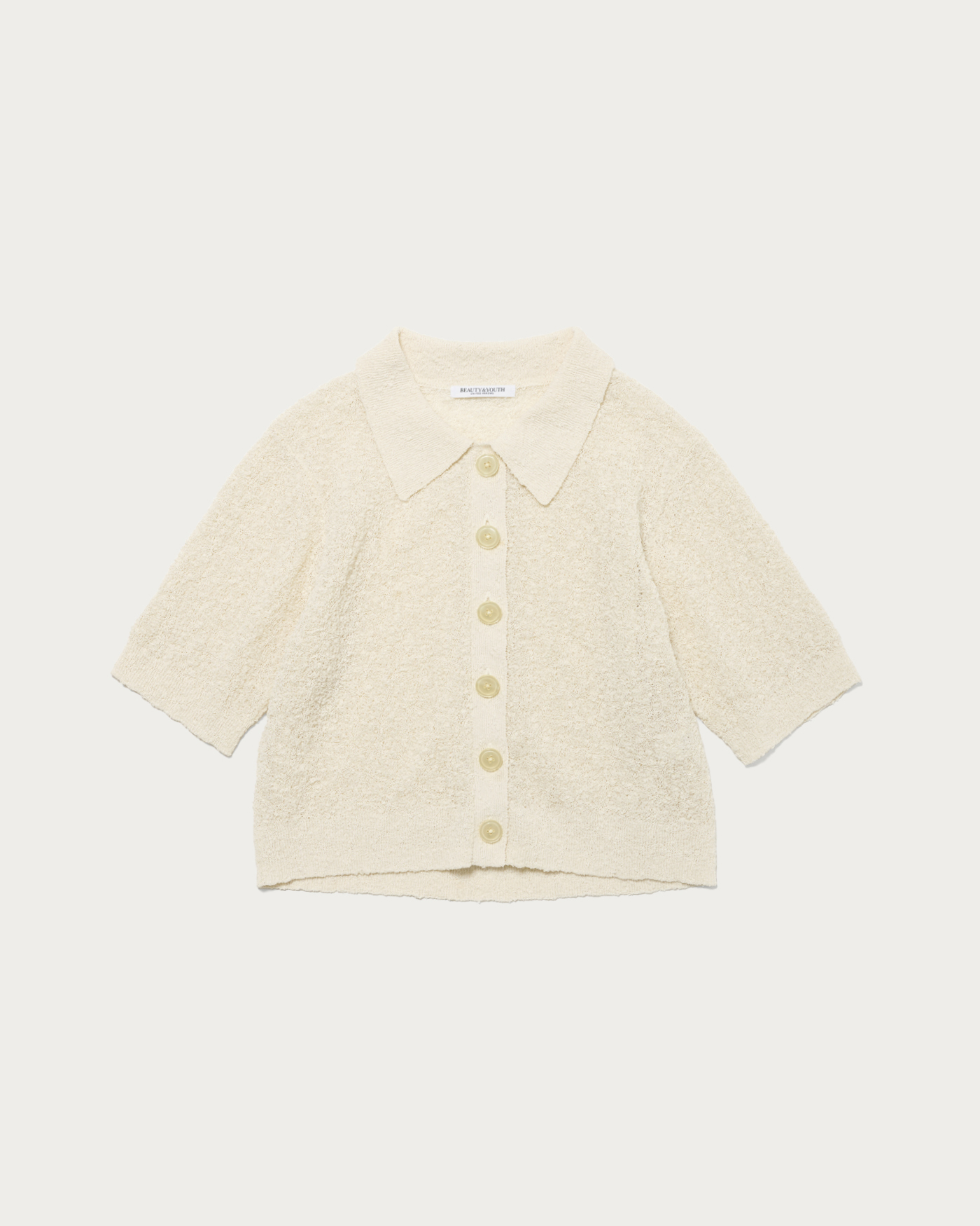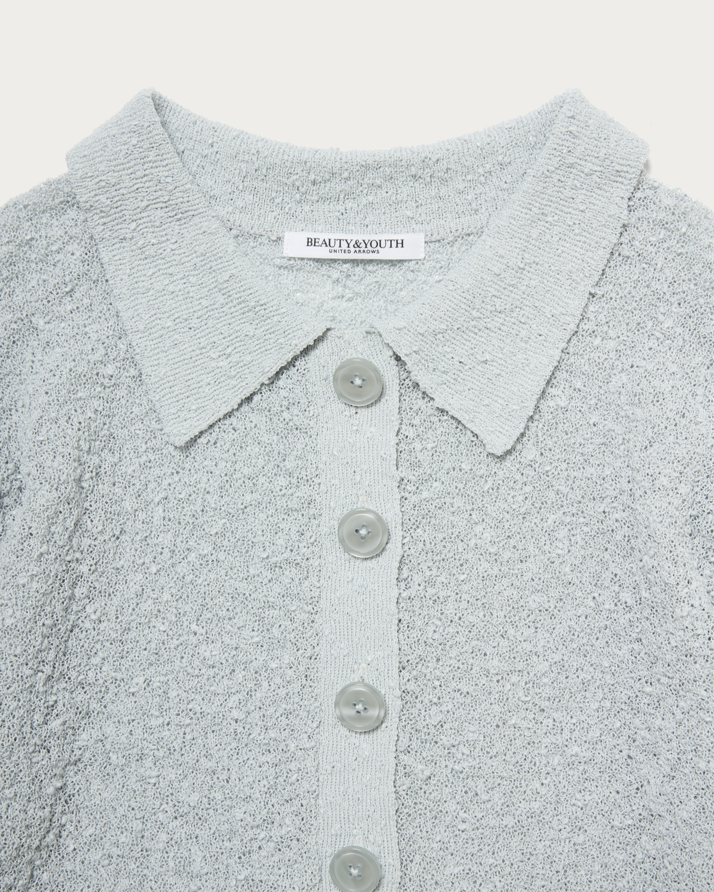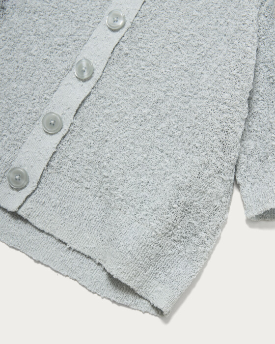 つぶつぶとしたノットヤーンがキュートなシャツ型のカーディガン。凹凸感を楽しめる表情のある仕上がりに。トレンド感のあるコンパクトなサイズ感で、羽織りとしてはもちろんのこと、ボタンを閉じてトップスのように楽しむのもおすすめです。