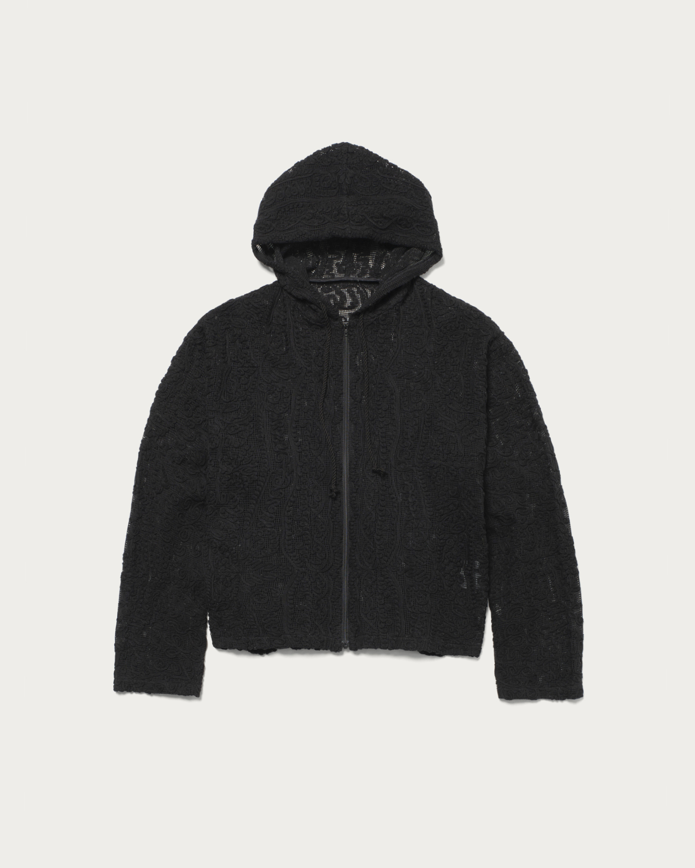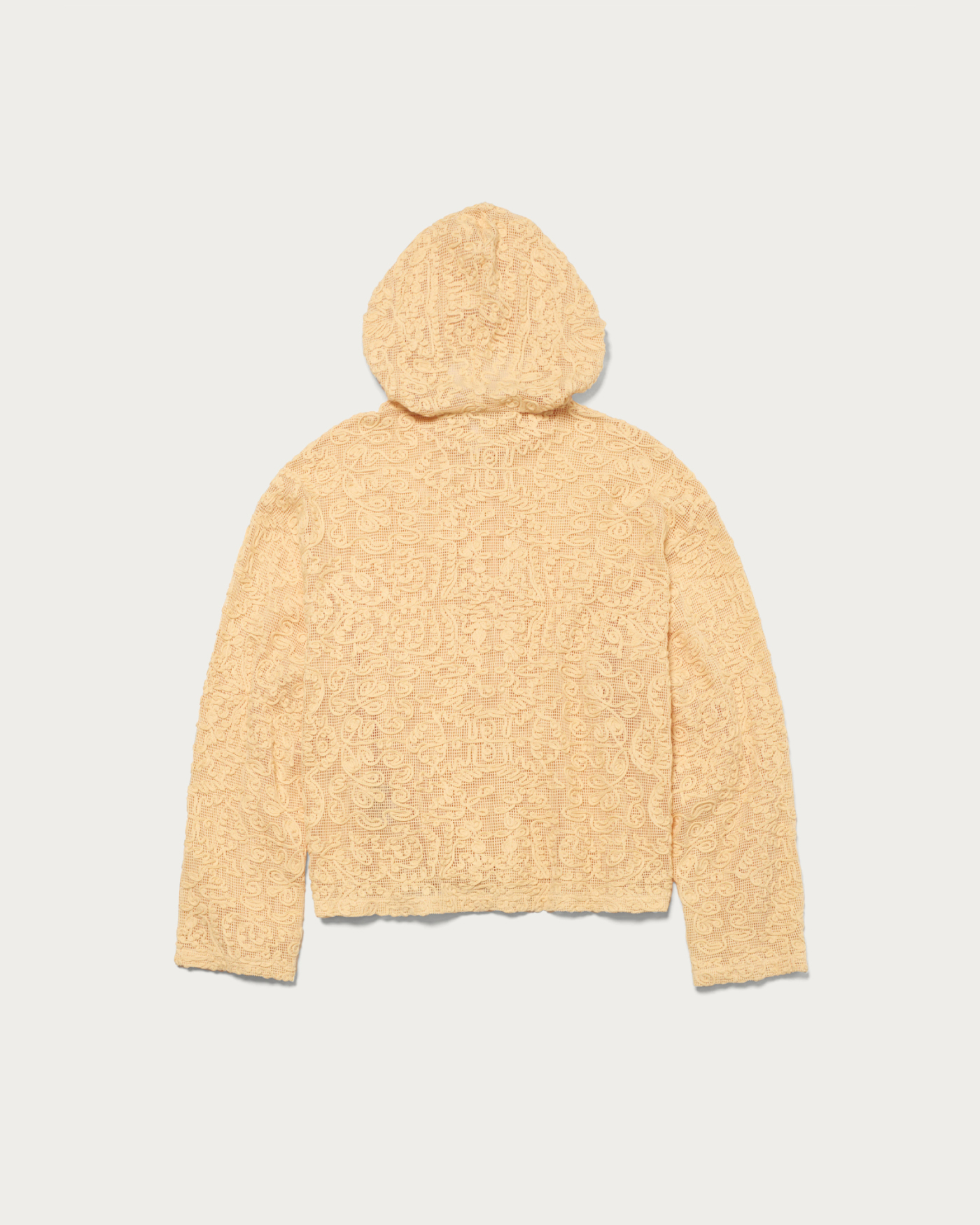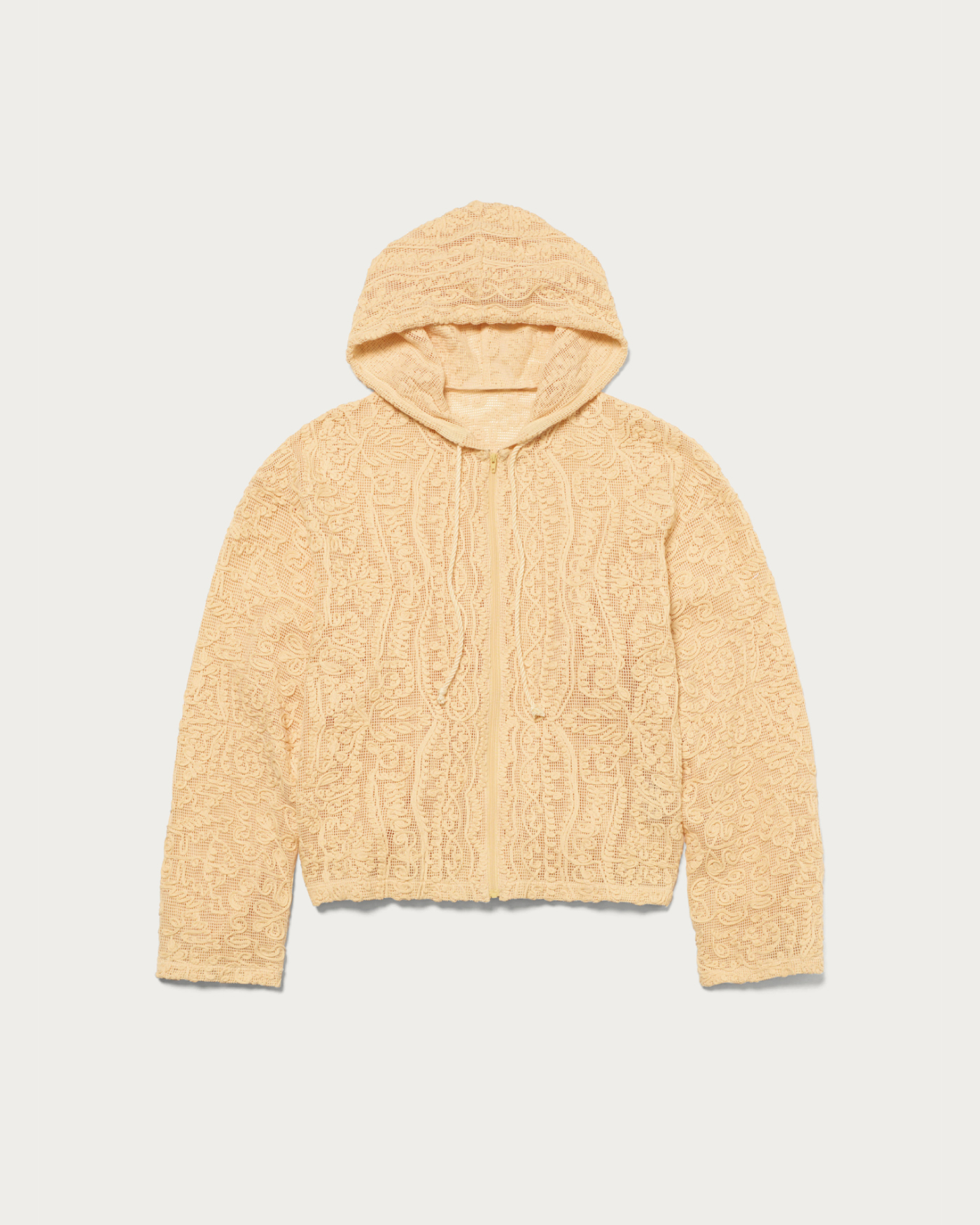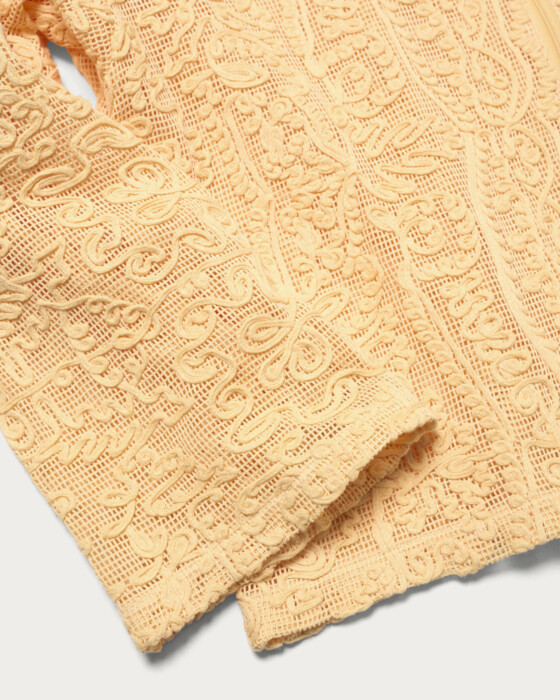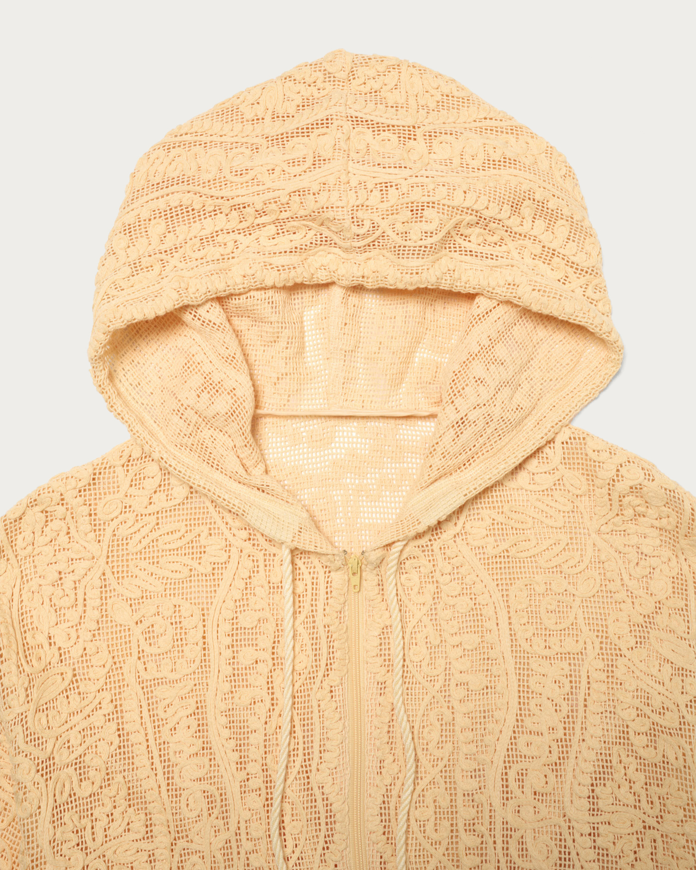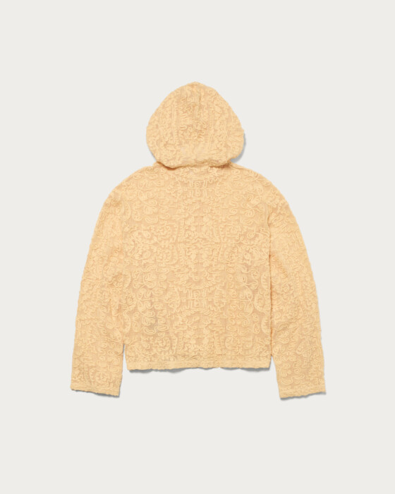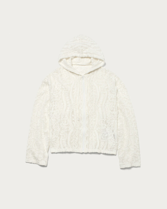 存在感のあるレース素材を主役に、シンプルなフーディ型でデイリーカジュアルな印象に仕上げました。さらっと羽織ることができる程よいサイズ感です。コットンのナチュラルな質感と、オリエンタルなムードが漂うテープ刺繍の柄がポイントです。
