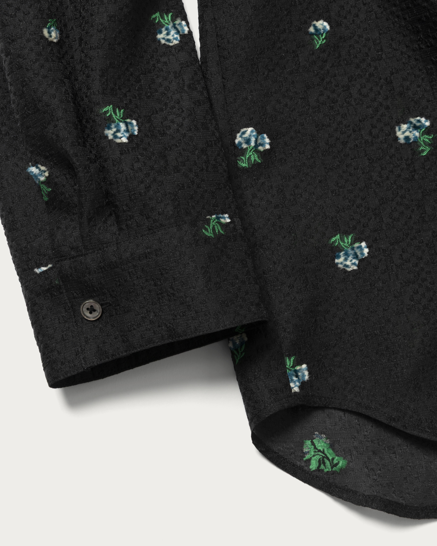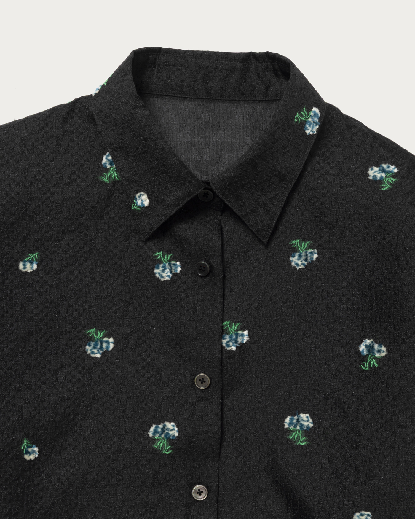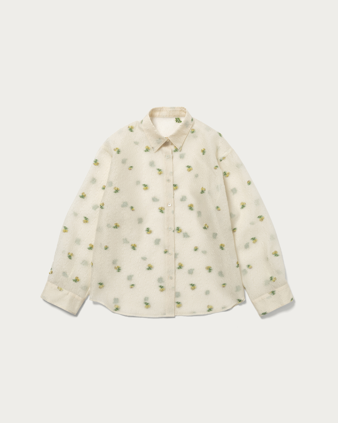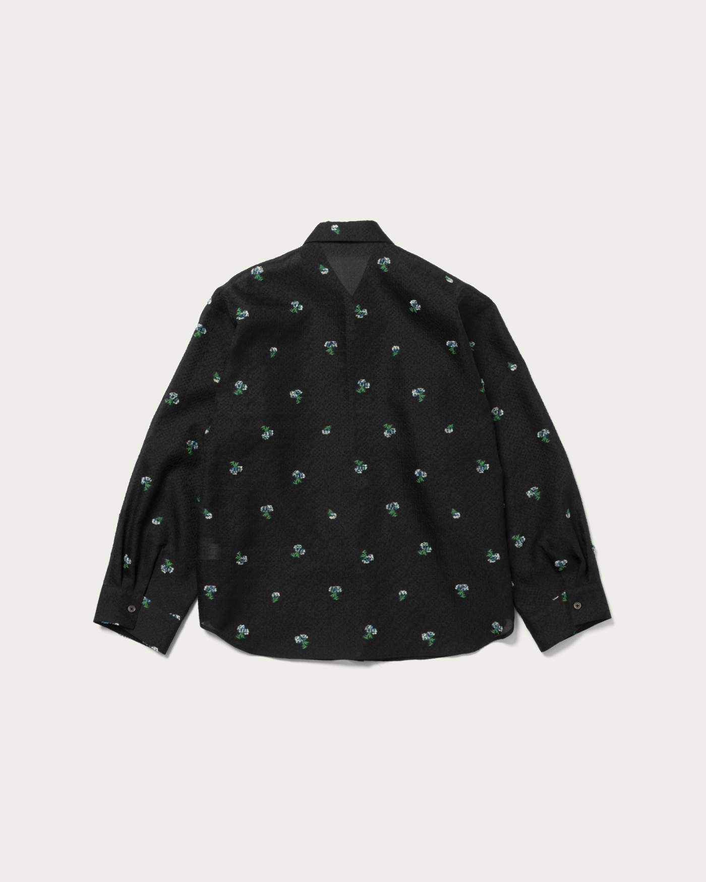 シアーシャツに花のモチーフのジャガードを施した素材を活かし、シンプルで使い勝手のいいシャツに仕立てました。お花部分と葉っぱ部分それぞれに両面カットを入れることにより、表側のお花を立体的にしているのがポイントです。また、程よい丈感にもこだわり、前を開けて羽織としても使っていただきやすいようお作りしました。