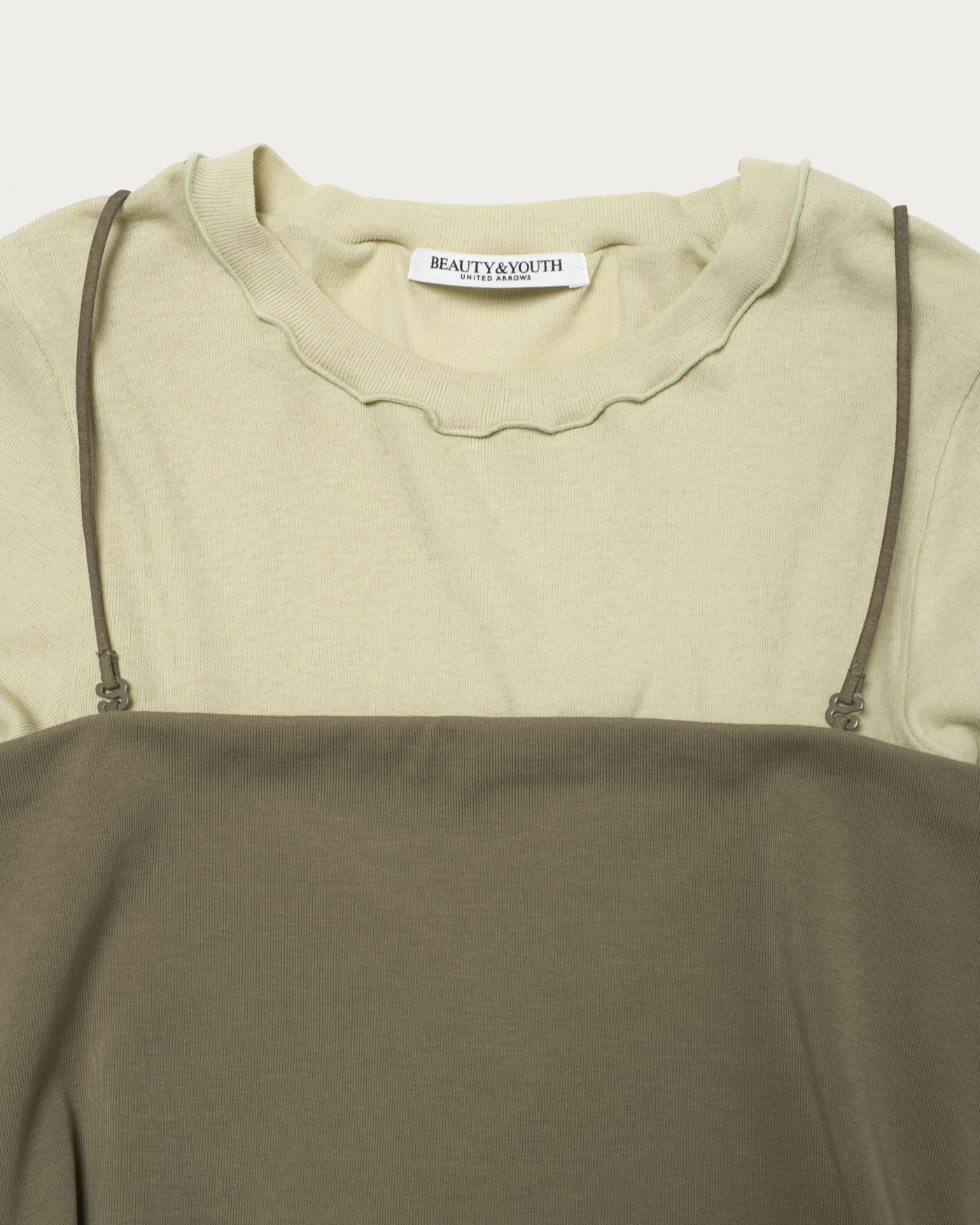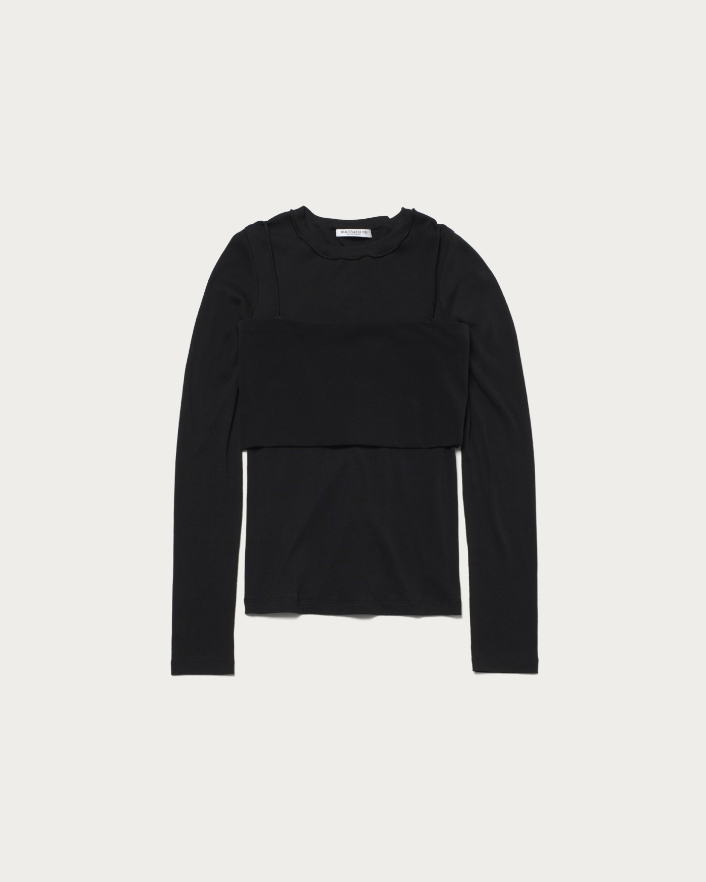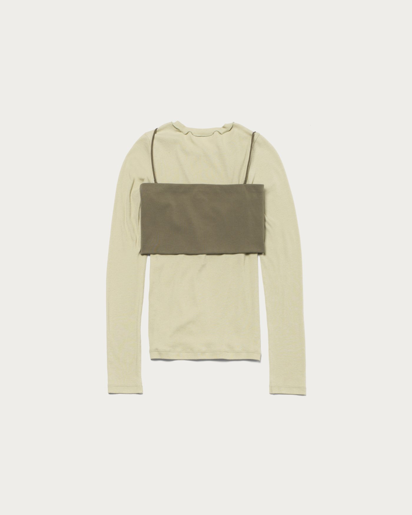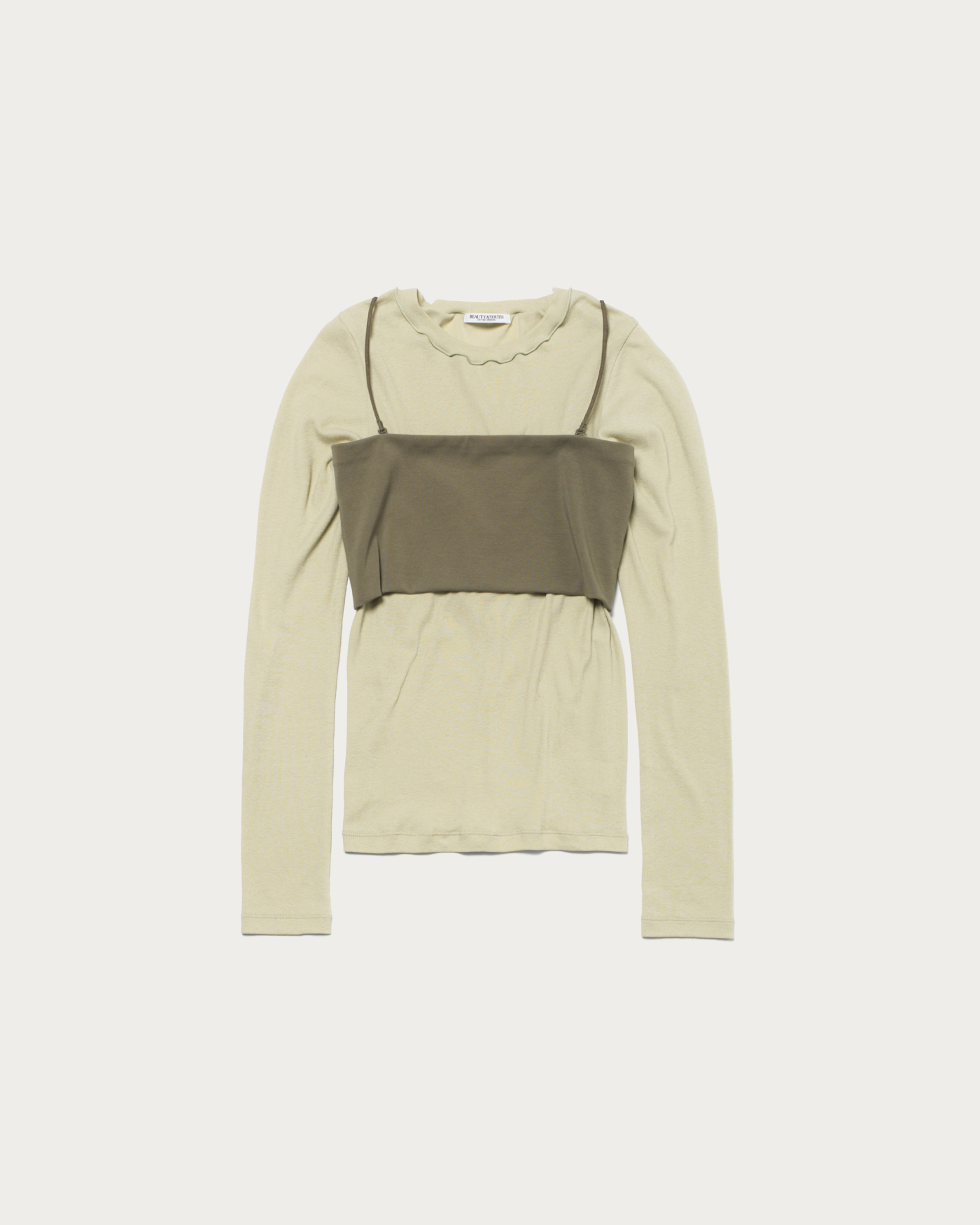 ロングスリーブとバンドゥがセットになったカットソートップス。シアー素材で抜け感があるロングスリーブをバンドゥとレイヤードすることにより、シンプルながらもモダンなスタイリングが完成します。シアーなリブ素材でしぼ感のある表情が特徴のトップスと、着用時のホールド感が魅力のバンドゥは肩ひもの取り外し可能です。