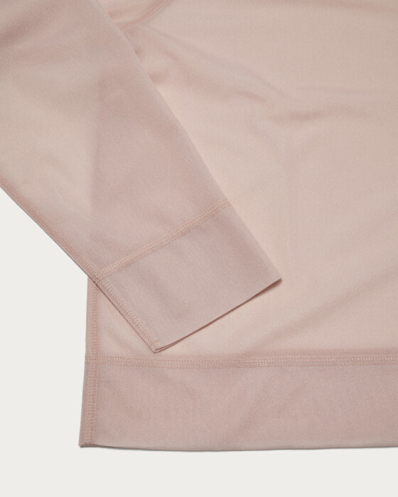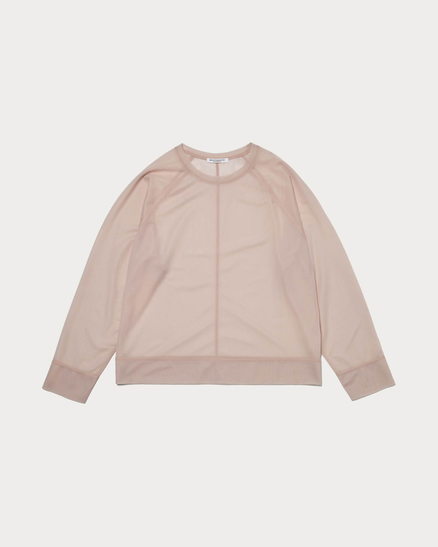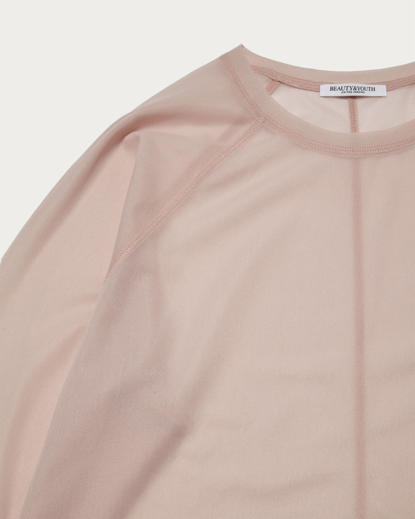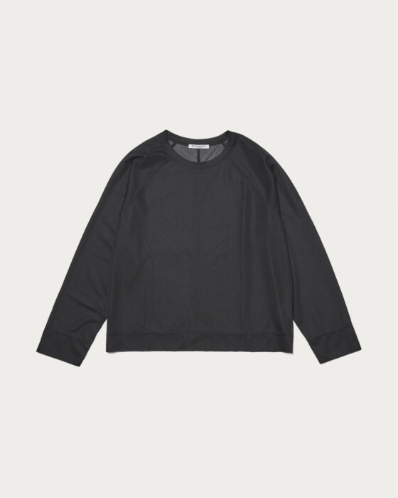 ボディをオーバーサイズに仕立て、ラグランスリーブと3本針の振りステッチをあしらいカジュアルな印象に仕上げました。気軽にレイヤードしやすい長めの丈感です。素材はハリとさりげない光沢が特徴のトリコットオーガンジー。クリア過ぎない表情のあるシアー感がポイントです。