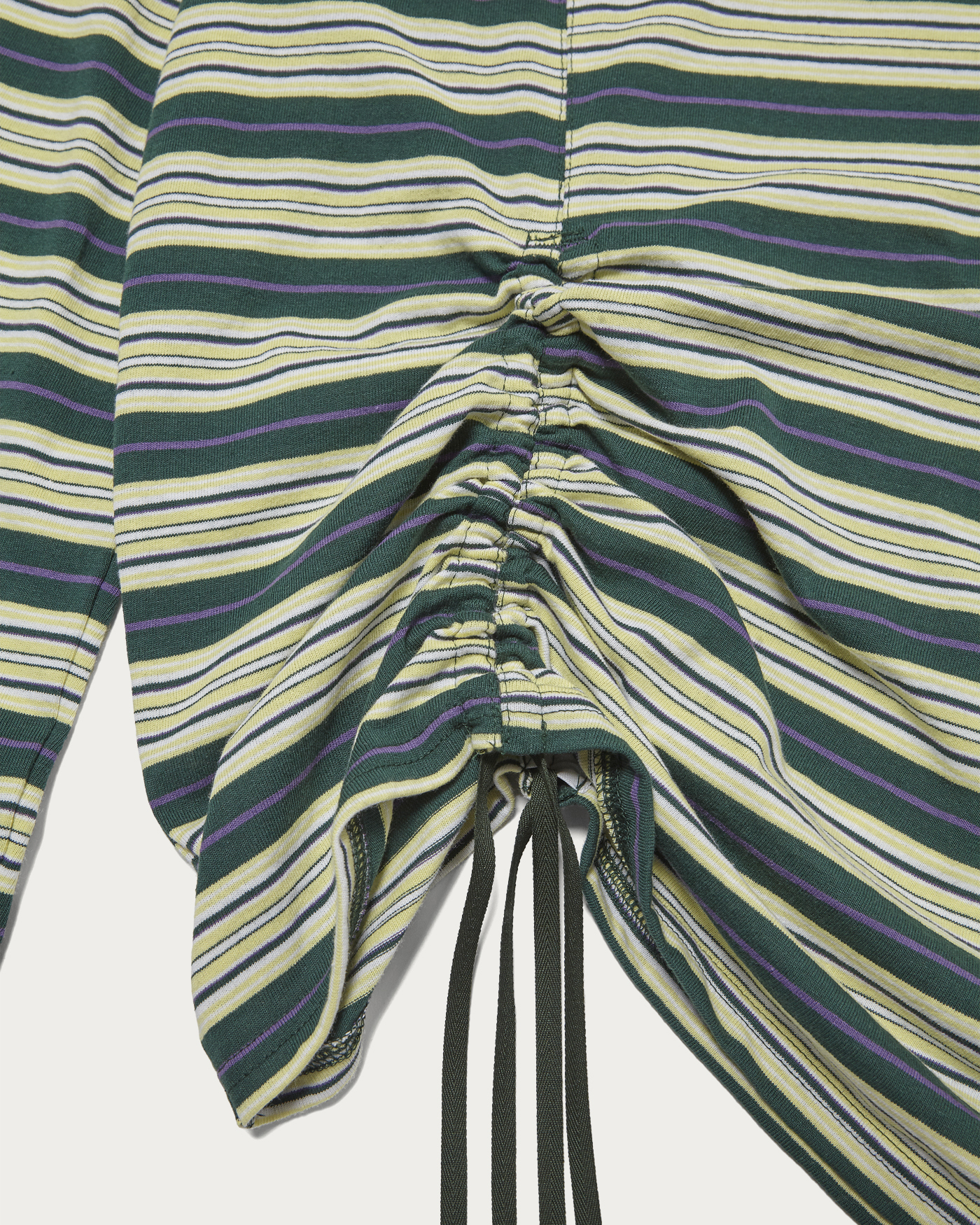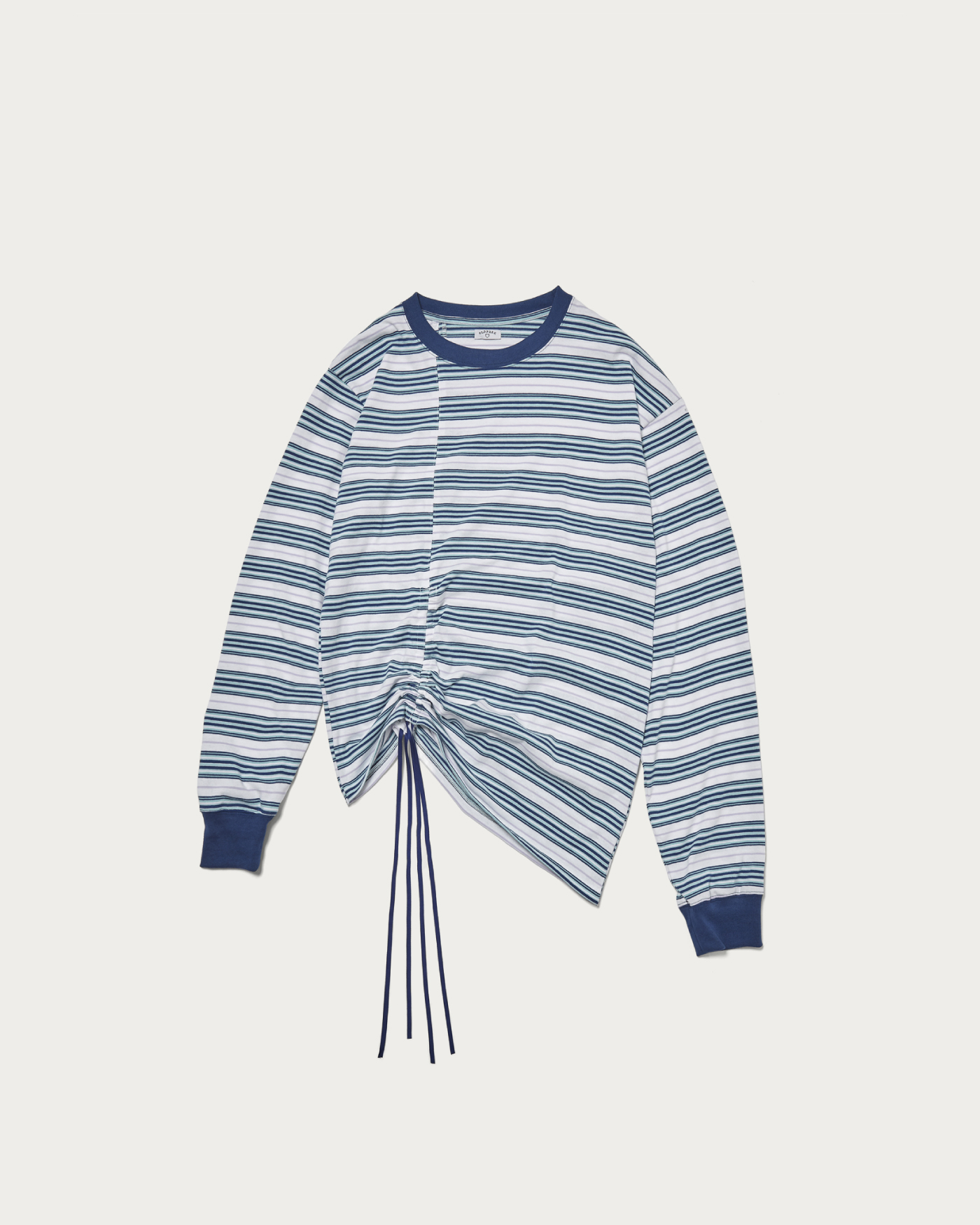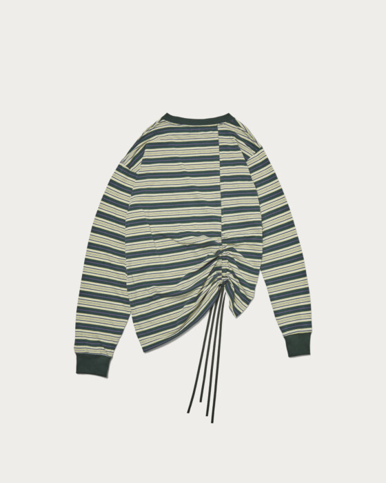 左右非対称のロングスリーブTシャツを組み合わせることで、アンバランスなサイズ感とボーダーのピッチのズレがアクセントになった一枚。インラインで展開する「Asymmetry Tee」をベースにロングスリーブへ変更し、ウィメンズ向けに再構築しました。通常は無地ですが、別注ではボーダー生地を採用し、より表情のある仕上がりに。裾のドローコードを絞ることで着丈やシルエットに変化がつき、スタイリングに応じたニュアンス調整が可能です。