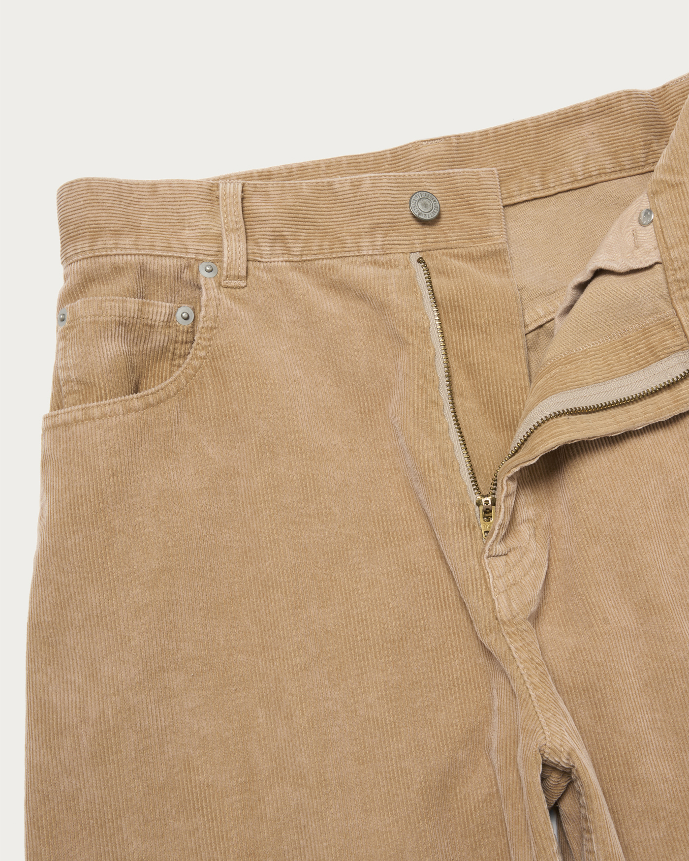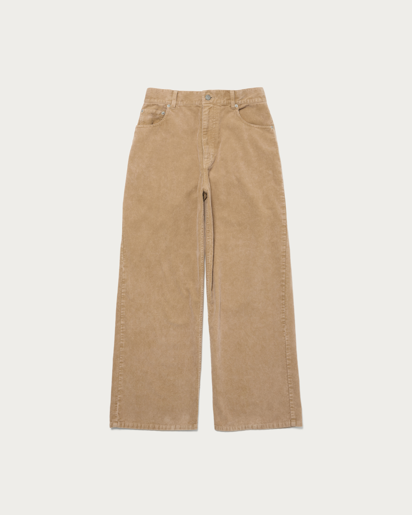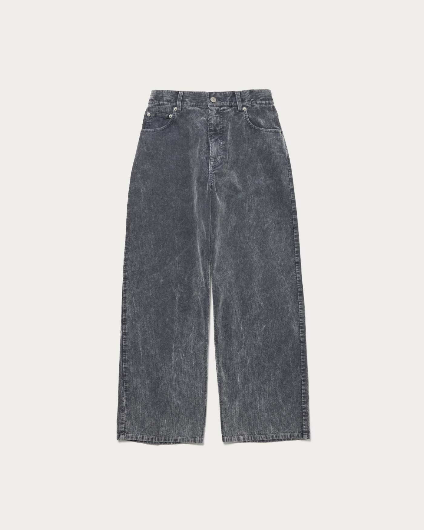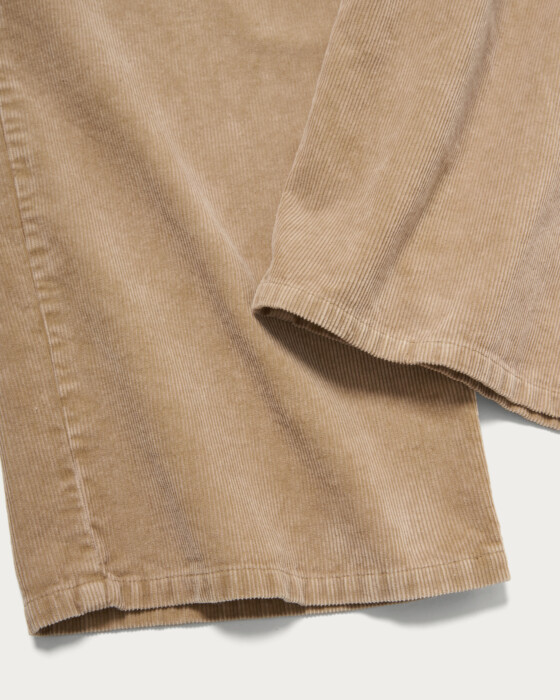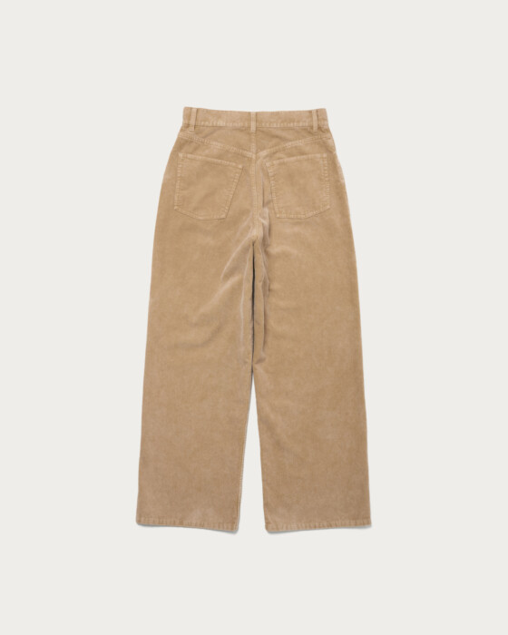 素材の加工にこだわった5ポケットのコーデュロイパンツ。サイズ感は大きめのウエストを選び、ヒップハングでルーズにお楽しみいただくのがおすすめ。同時期展開のガーメントダイシャツを合わせたフェード感のある着こなしや、テープヤーンのハンドニットに合わせたカジュアルなスタイリングが素敵です。