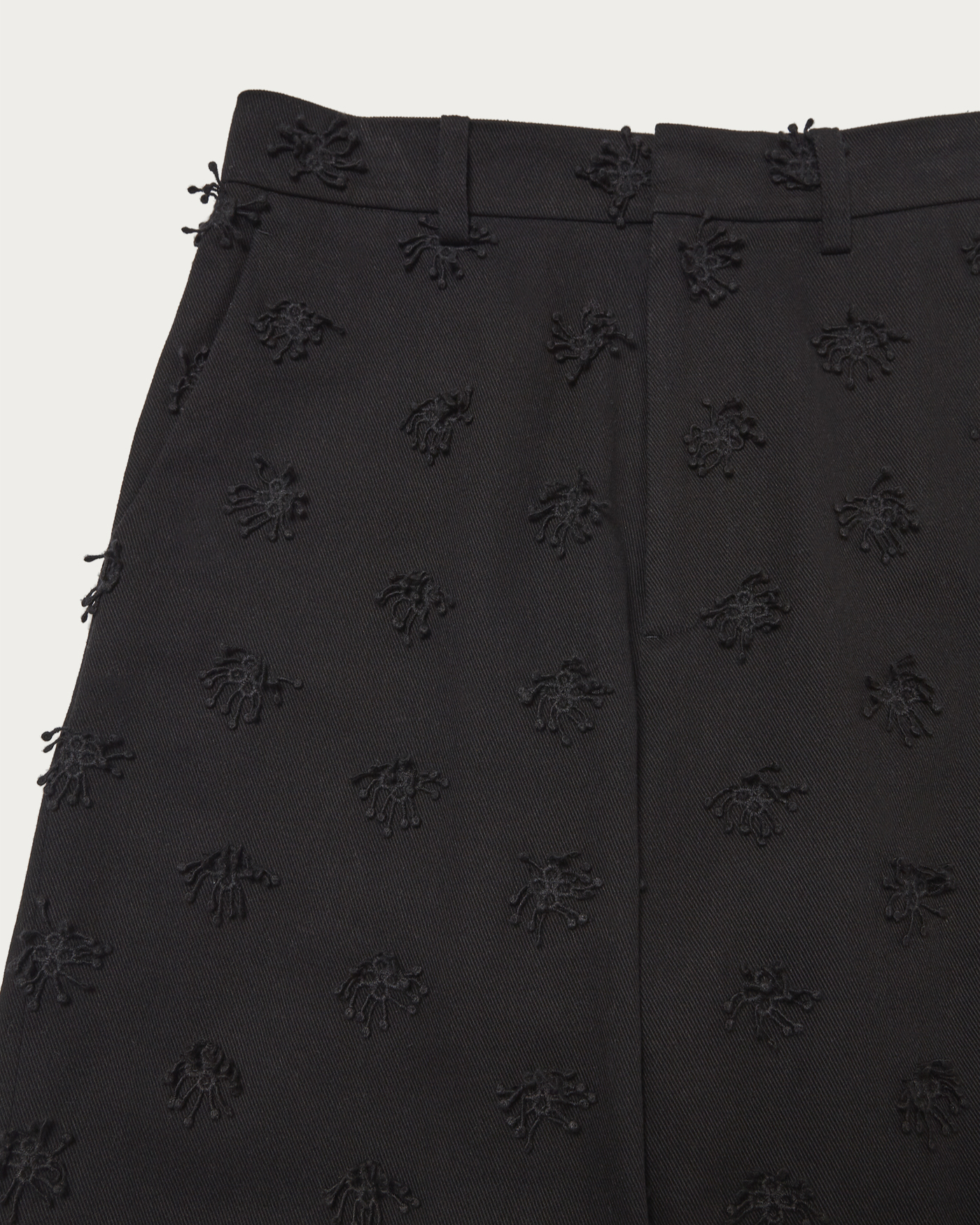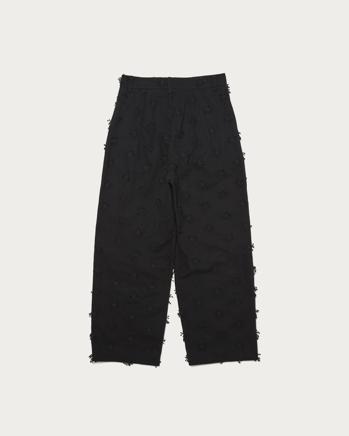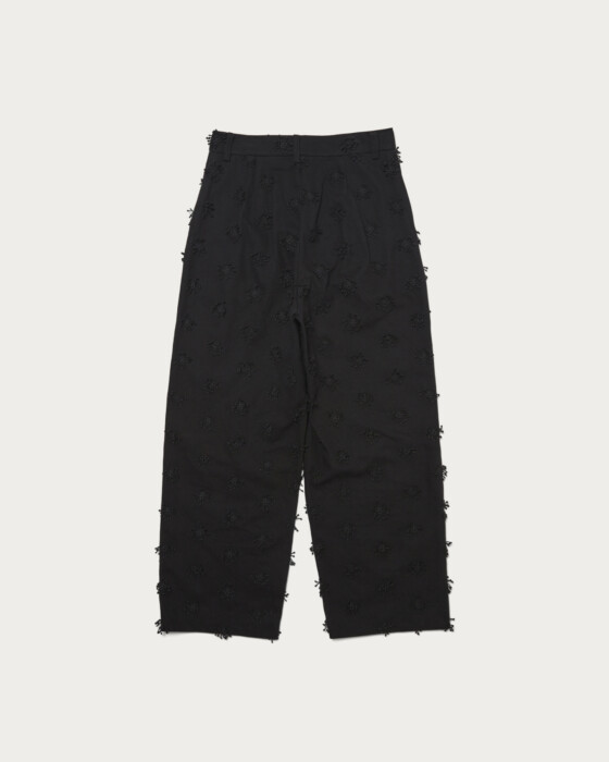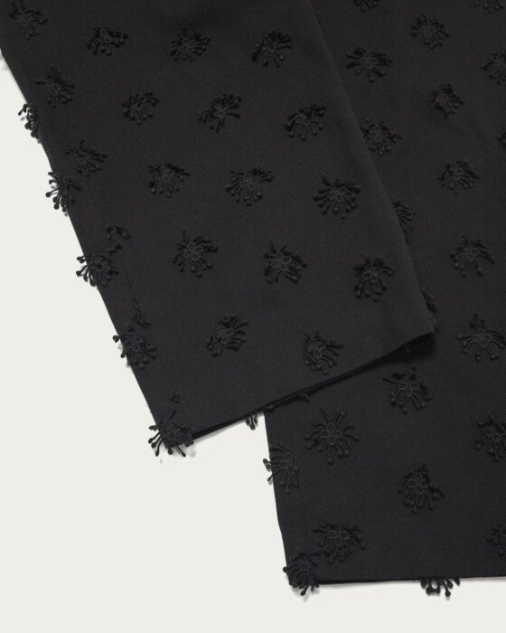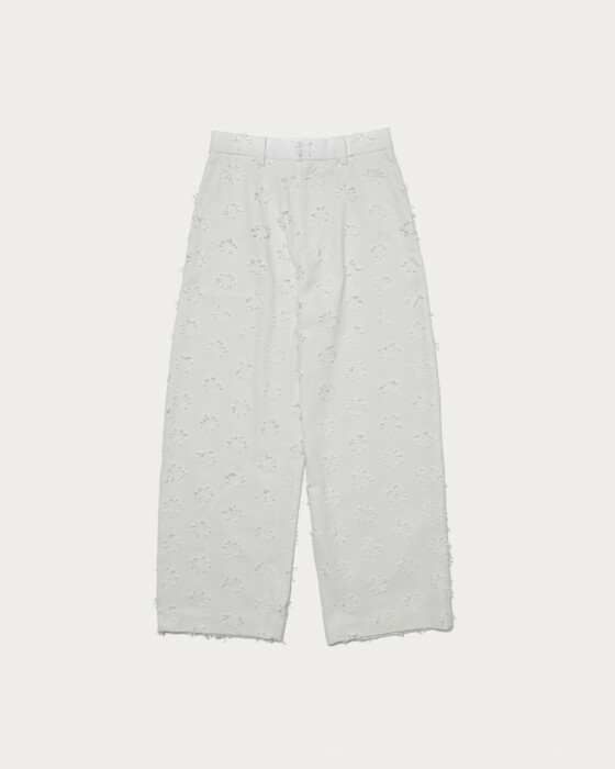 特徴的な素材を活かしてシンプルに仕上げ、ややルーズでありながら腰回りはすっきり履けるようシルエットにこだわりました。太番手のコットンを使用し立体的な刺繍を施した素材が魅力。同素材のジャケットと合わせたコーディネートでセットアップスタイルもぜひお楽しみください。